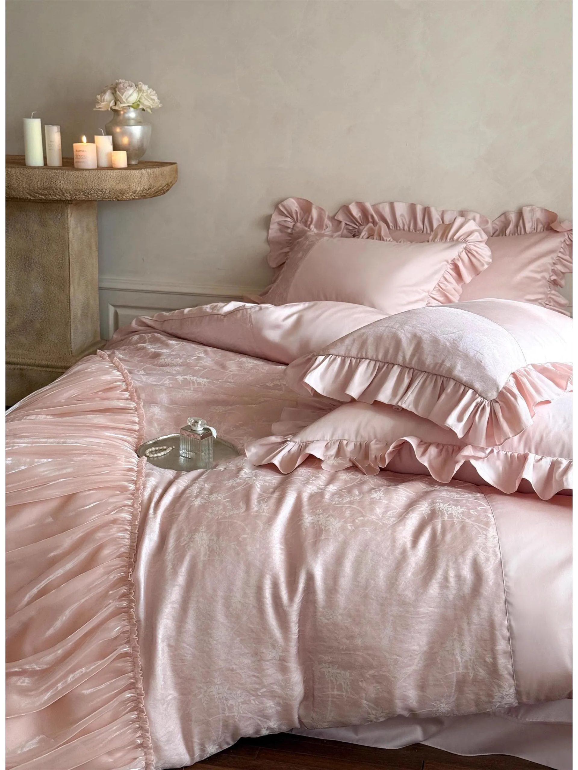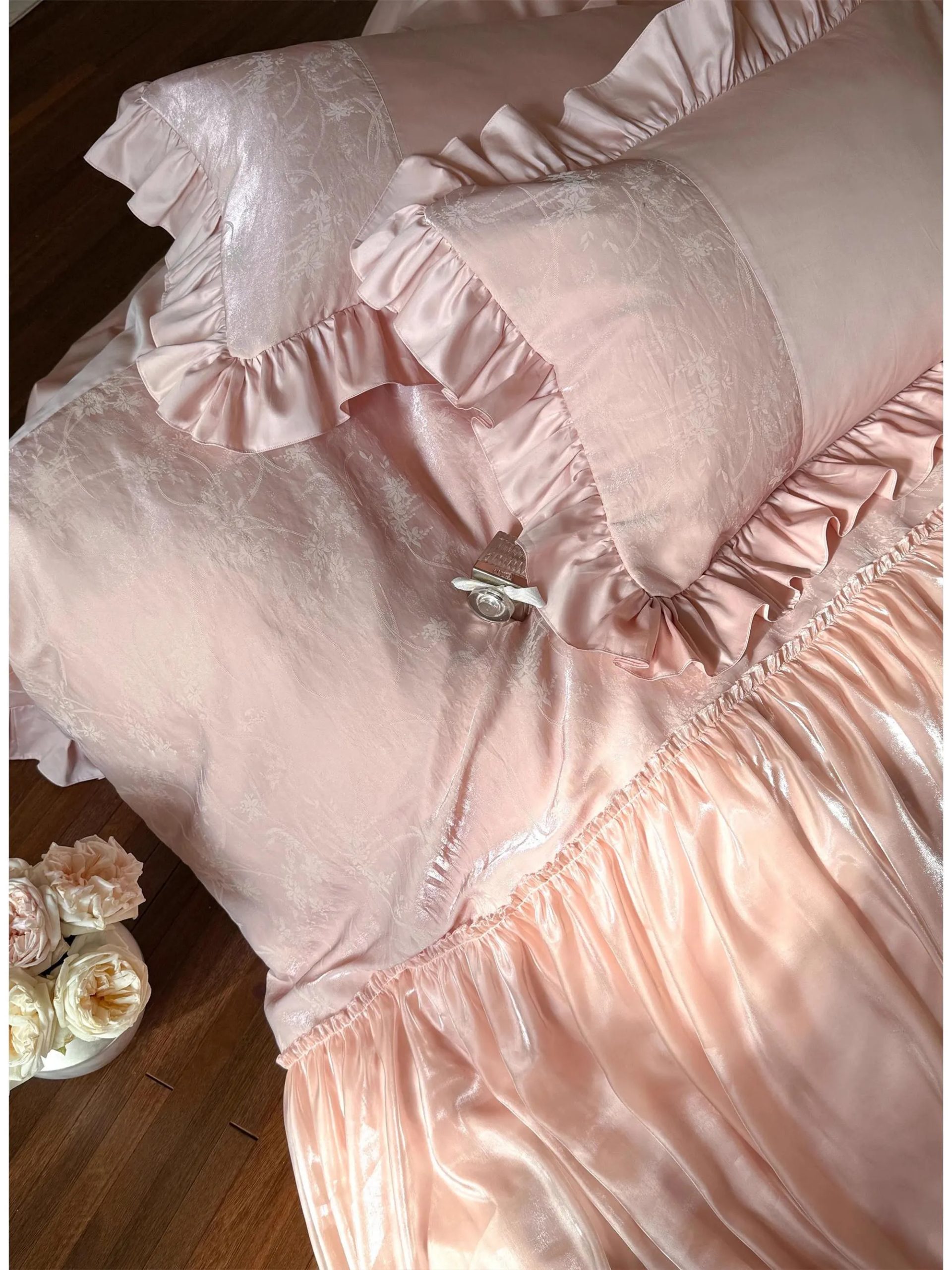 Multi-layered ruffle craftsmanship: The pillowcases and duvet covers feature hand-layered ruffles, creating a vibrant and dynamic pleat, infusing the bedding with a princess-like romantic and soft beauty. The soft pink hue further enhances the dreamy, fairy-like feel, evoking a fairytale-like feeling in every gesture.