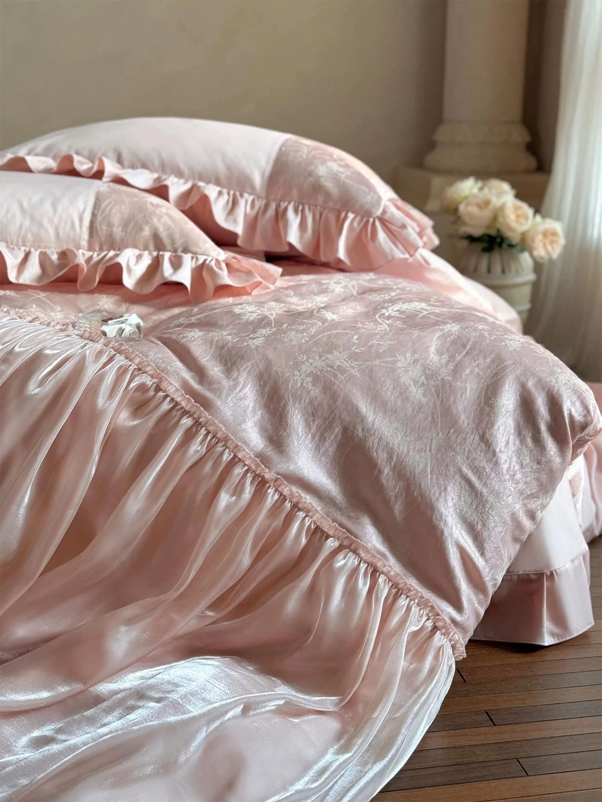 This ensemble seamlessly blends the dreamy romance of a French princess with the feminine elegance of a luxurious girl. With a soft pink satin base, layered ruffles and delicate jacquard/embroidery create a dreamlike bedroom reminiscent of a princess’s chamber. Every fold exudes a sense of romantic ritual, transforming sleep into an immersive fairytale experience.