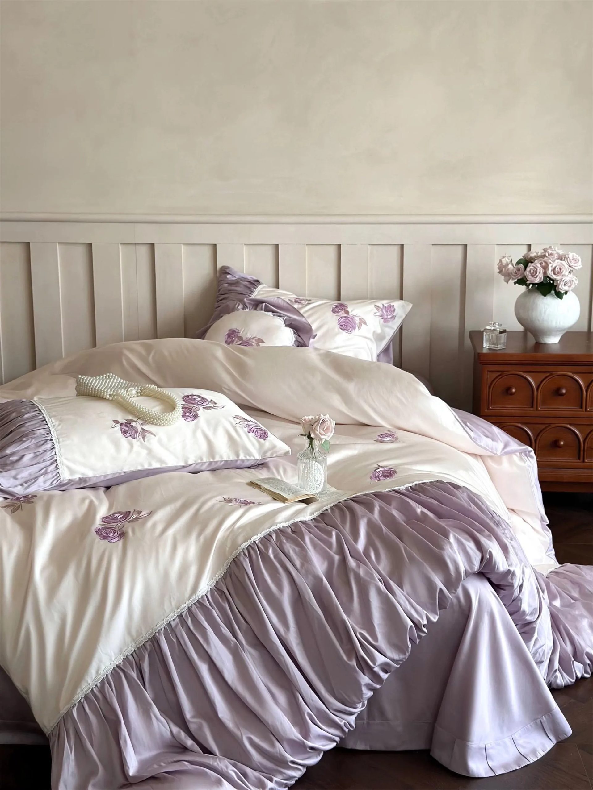 A deep fusion of French romantic tenderness and the sophistication of a light luxury style, this embellishment features a purple-hued three-dimensional rose embroidery, complemented by a silky satin texture and contrasting purple and white accents. The result is a bedroom space that combines romance with a refined sense of sophistication, evoking the elegant bedroom of a French manor. Every detail of the embroidery exudes a sense of ritual in a light luxury lifestyle.