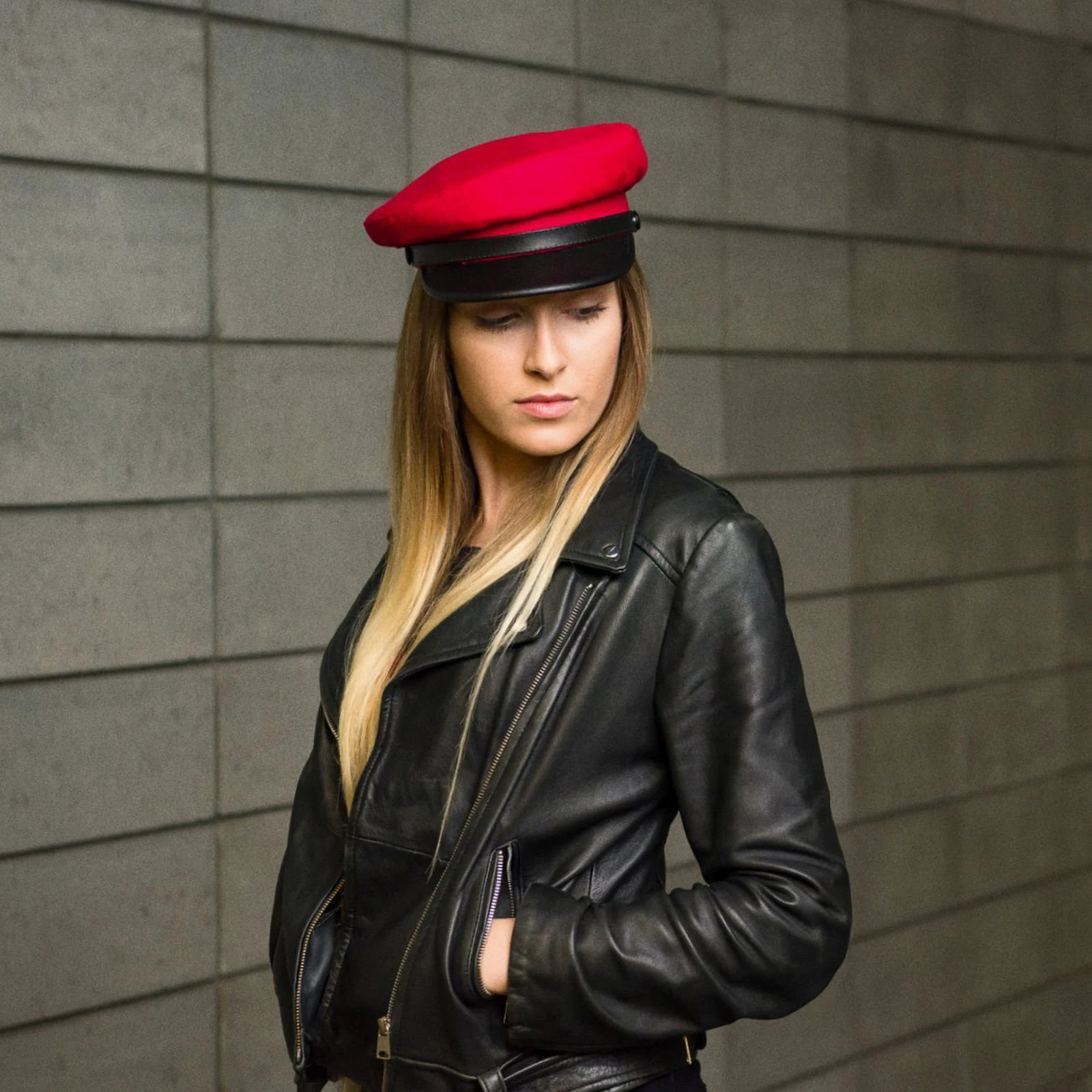 Retro Workwear Style: Paired with a black leather jacket, a basic white T-shirt, straight-leg jeans, and Doc Martens boots, the red and black beret complements the leather jacket, while the contrasting colors enhance the retro workwear feel. Perfect for weekend shopping or outdoor shopping.