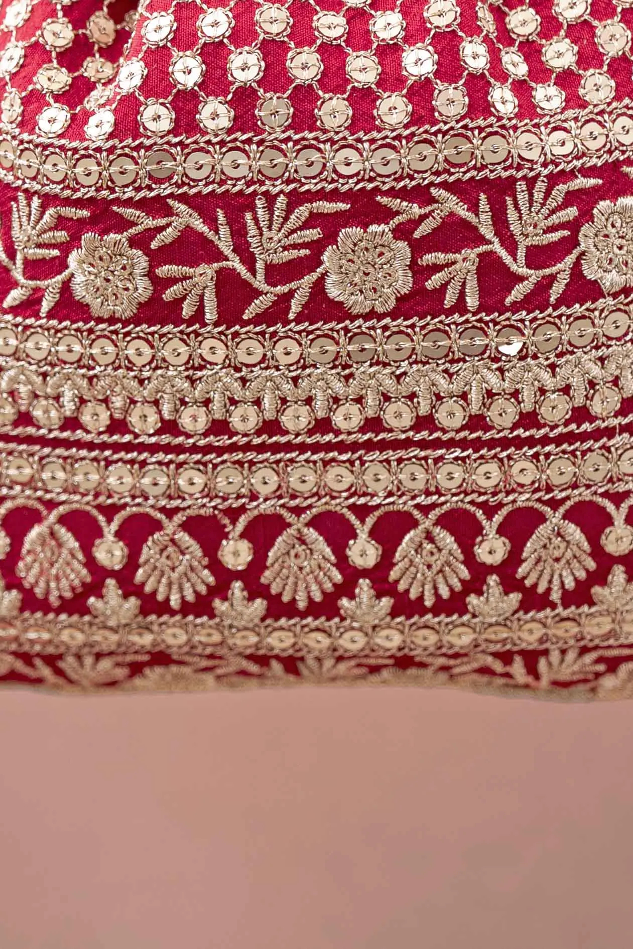 The bag’s base is a vibrant red satin, evoking a festive atmosphere reminiscent of celebratory red silk. The delicate gold embroidery (floral and geometric patterns) creates a striking visual impact of traditional elegance against the red, as if incorporating the exquisiteness of imperial brocade and the vibrant energy of festive celebrations. Even before touching the bag, you’re captivated by its festive and sophisticated atmosphere.