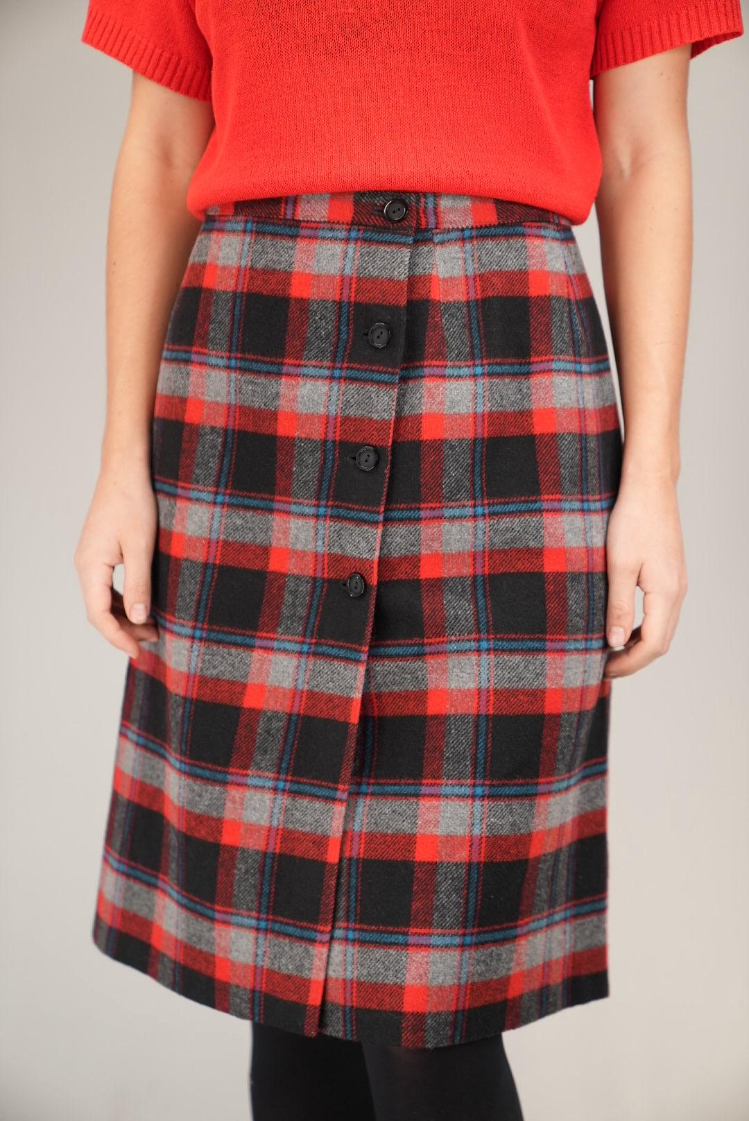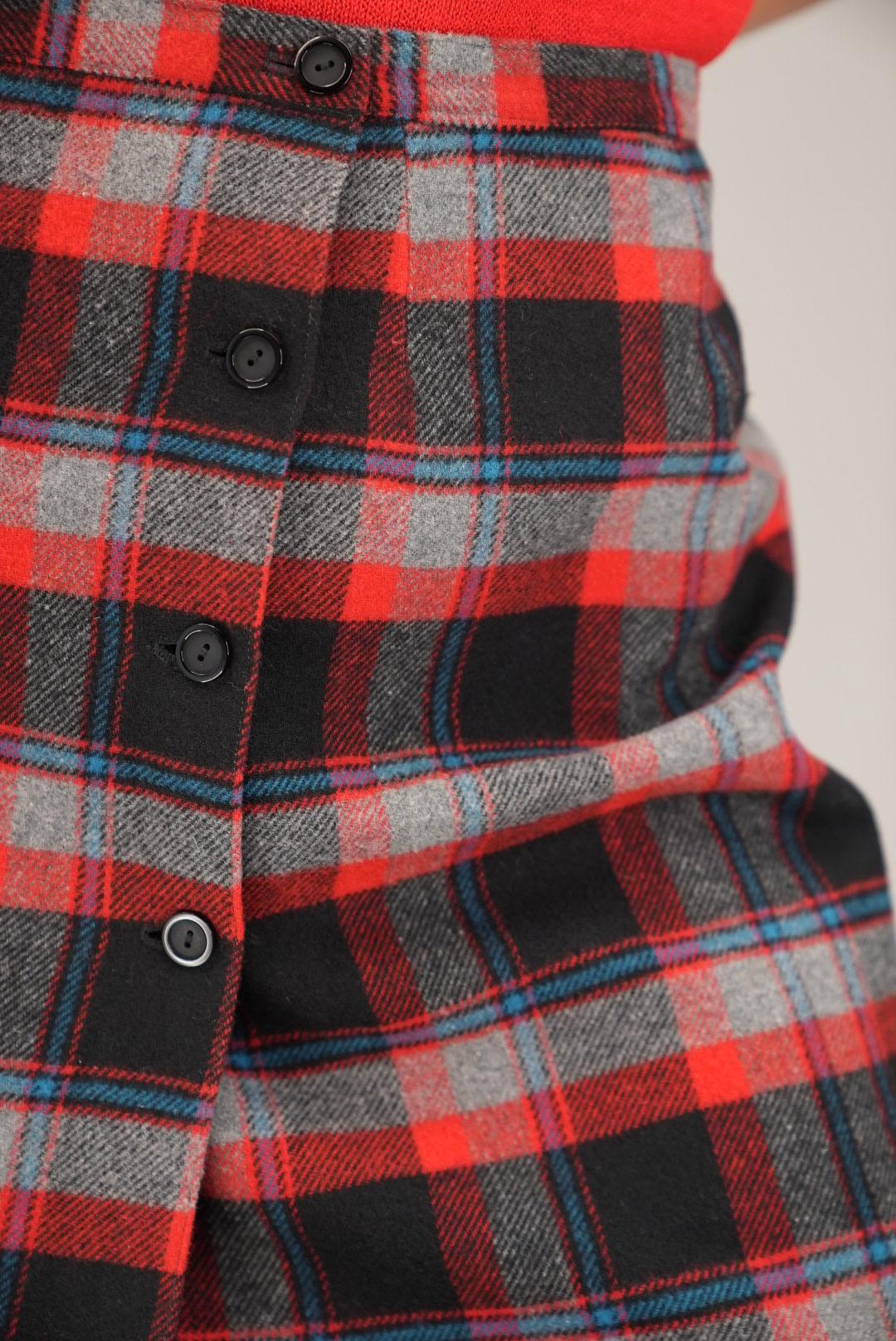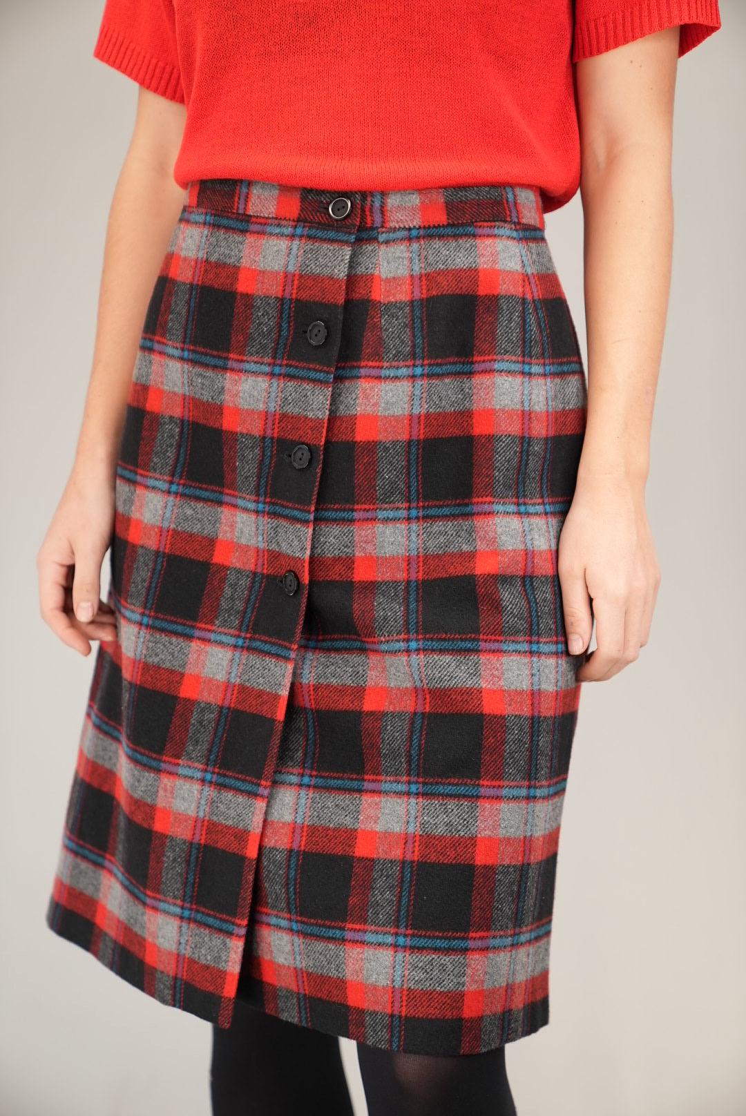 Structured, classic, and easy to style, this red and black tartan button-front skirt brings a touch of vintage charm and reliable versatility to your wardrobe.