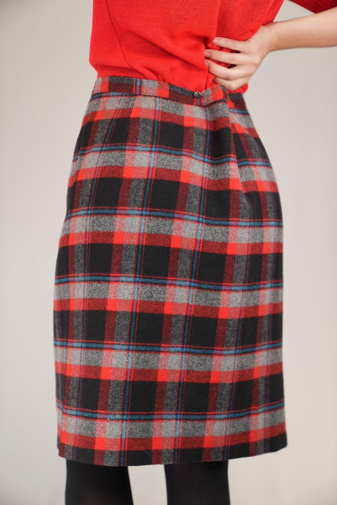 This skirt features a timeless tartan pattern in red, black, and soft grey, giving it a clean, heritage-inspired look that works from weekday to weekend. The straight, gently tapered silhouette creates a neat line through the hips and legs, while the front button placket adds structure and a subtle vintage touch. It is an easy, versatile piece for cool-weather outfits, pairing effortlessly with knits, blouses, and simple tops.