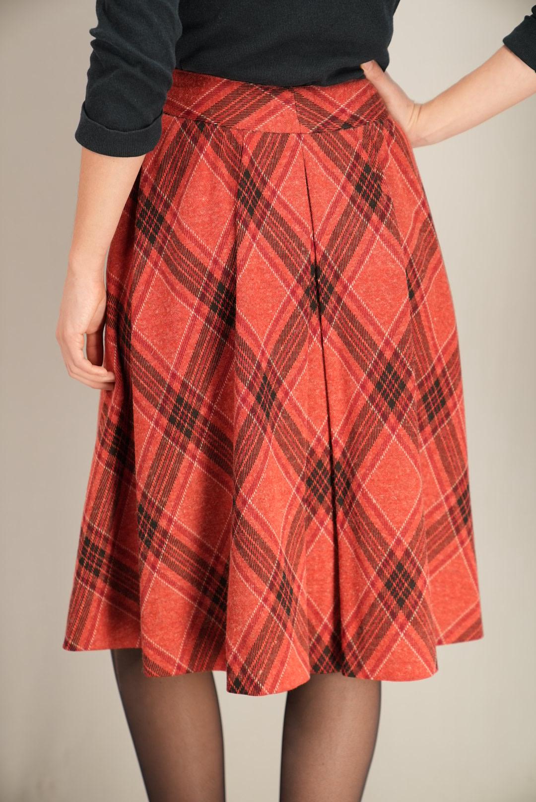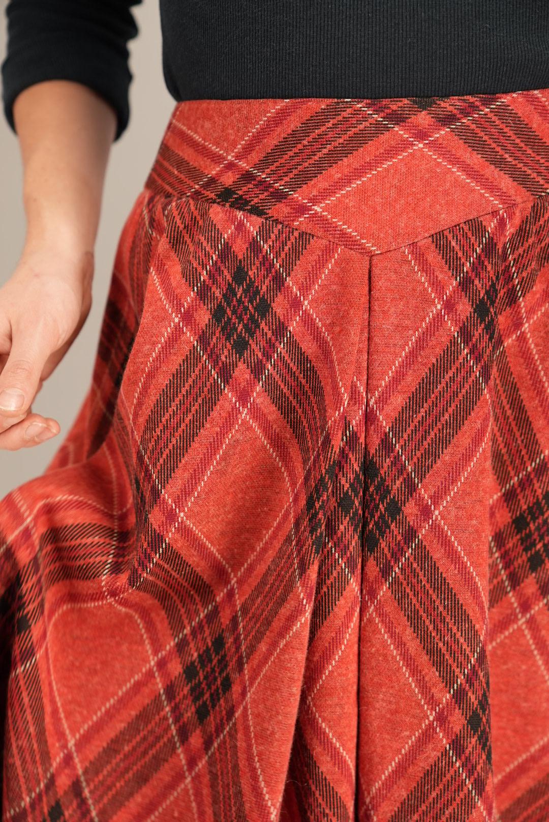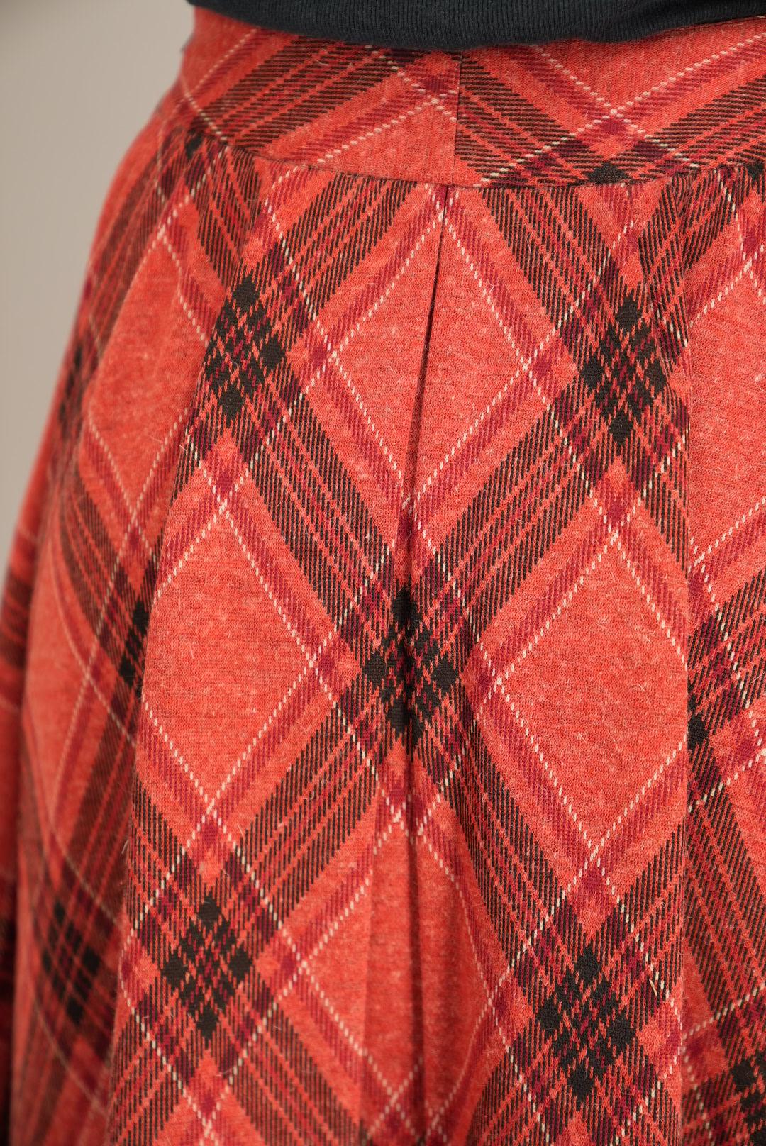 This A-line skirt features a cheerful red plaid pattern with fine dark lines, giving it a warm, vintage-inspired character. The waistband is cut on the bias so the checks run diagonally, drawing attention to the waist and adding a subtle design twist. Below the yoke, gentle gathers and panels open into a flowing flare that moves beautifully as you walk, offering an easy, feminine silhouette for everyday wear.