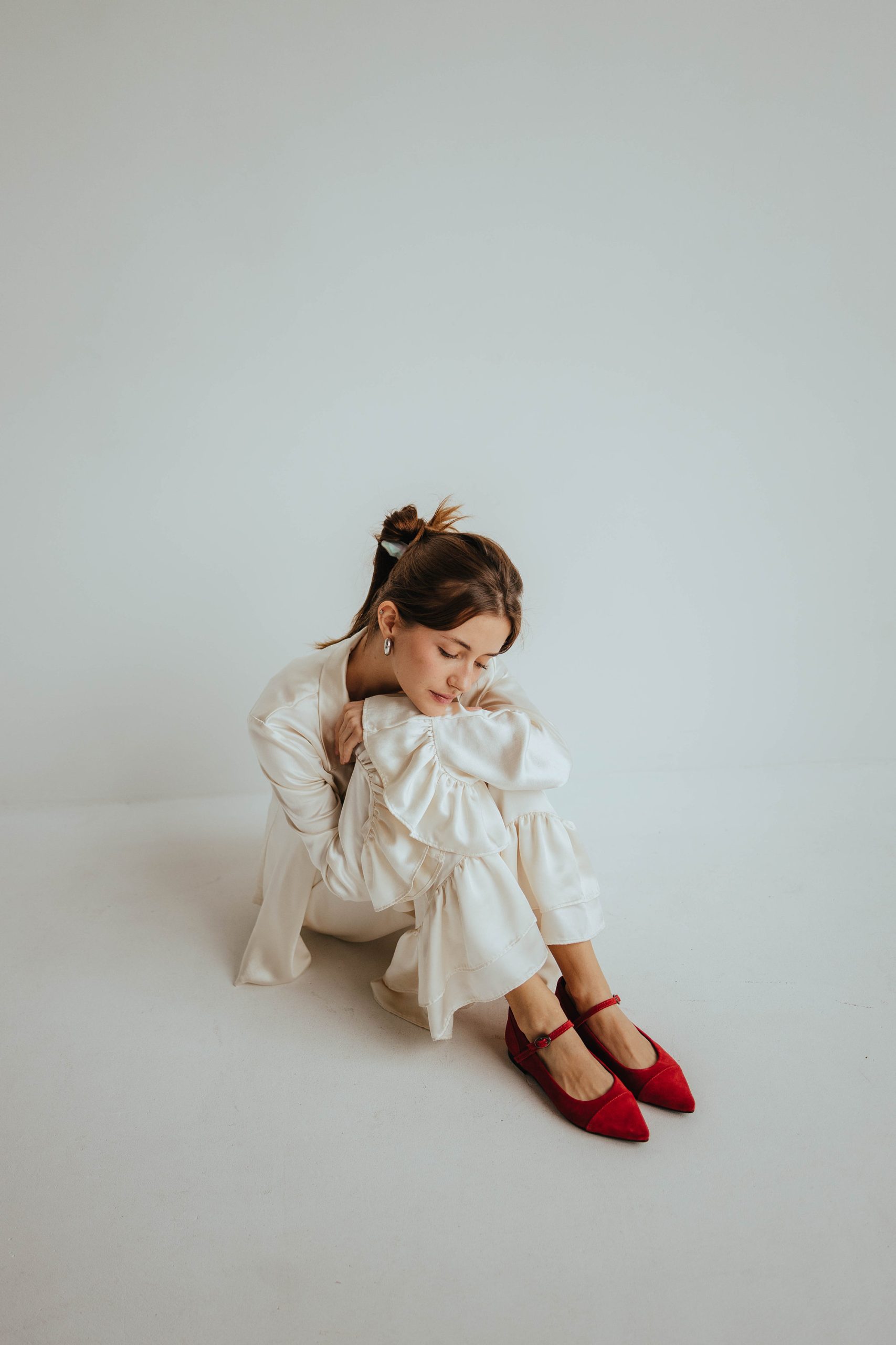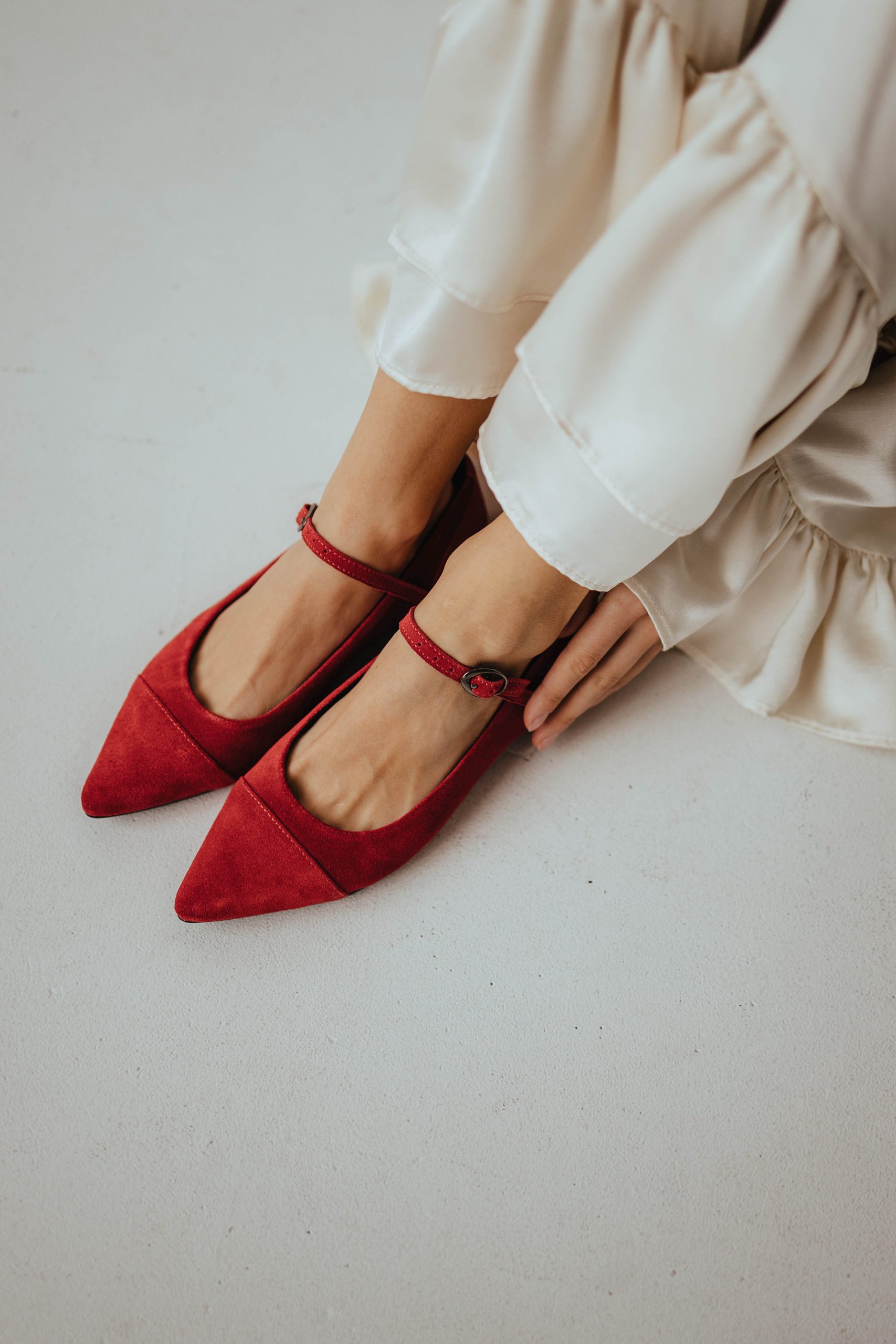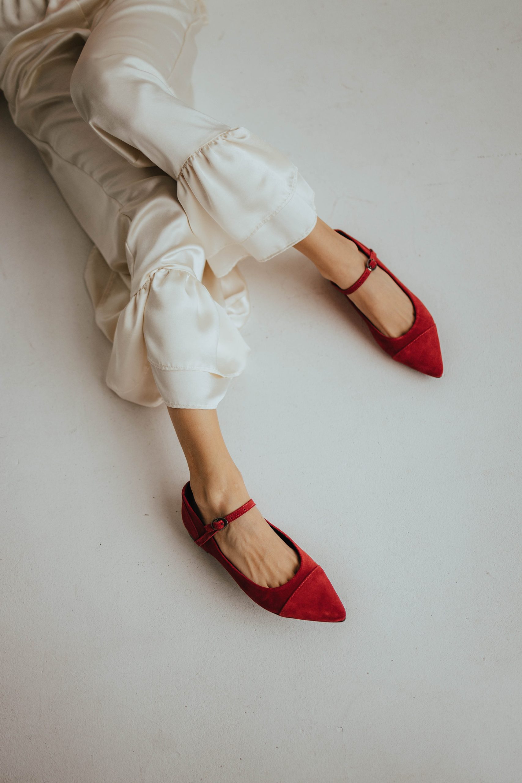 Modern and romantic Mary Janes—sleek lines, soft texture, and a striking red color—deliver all-day comfort.