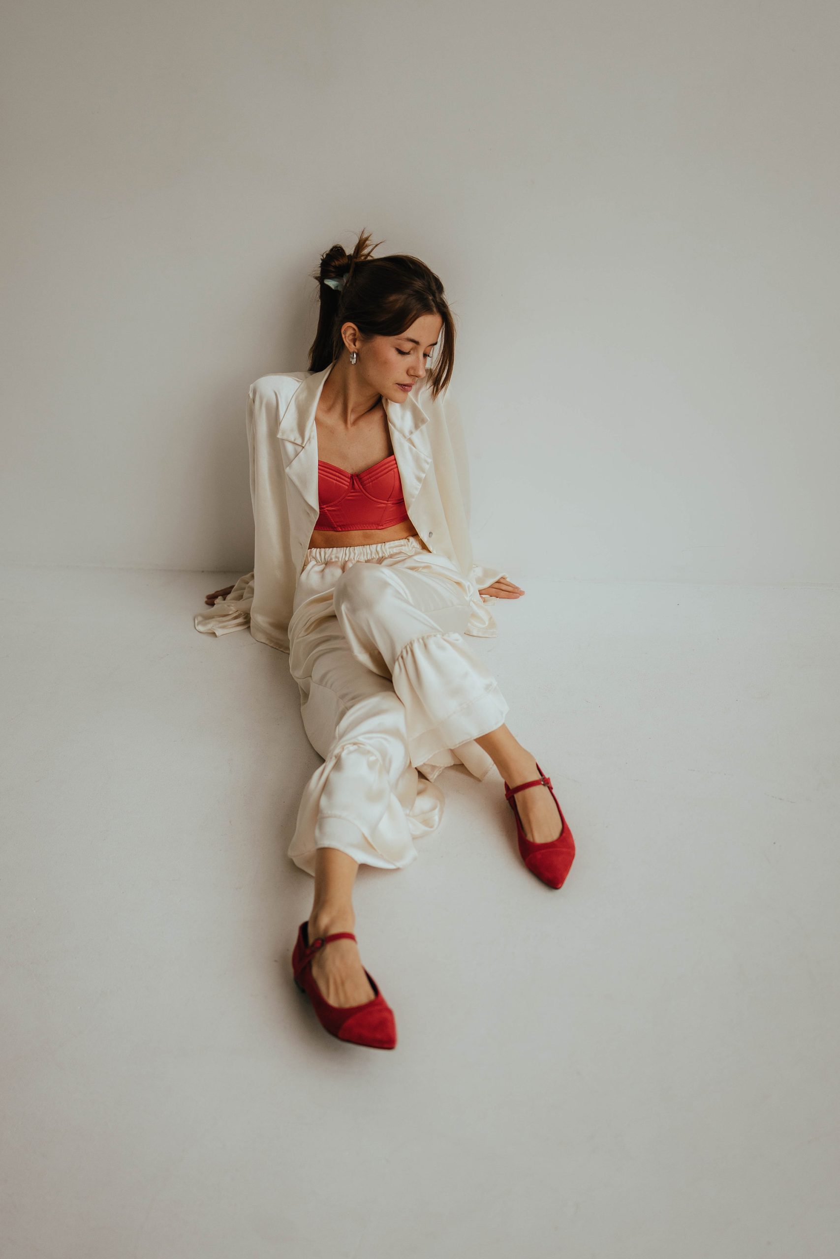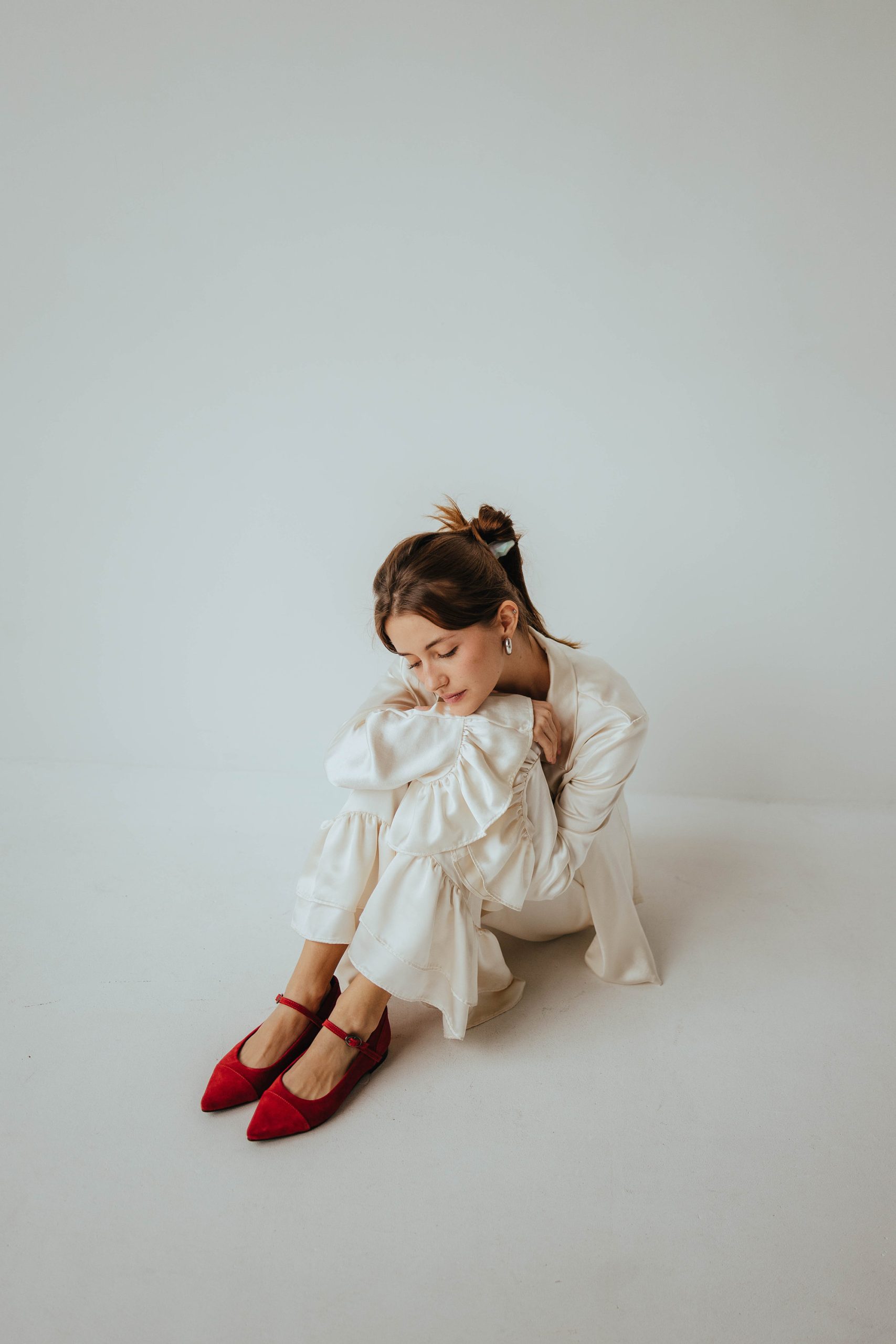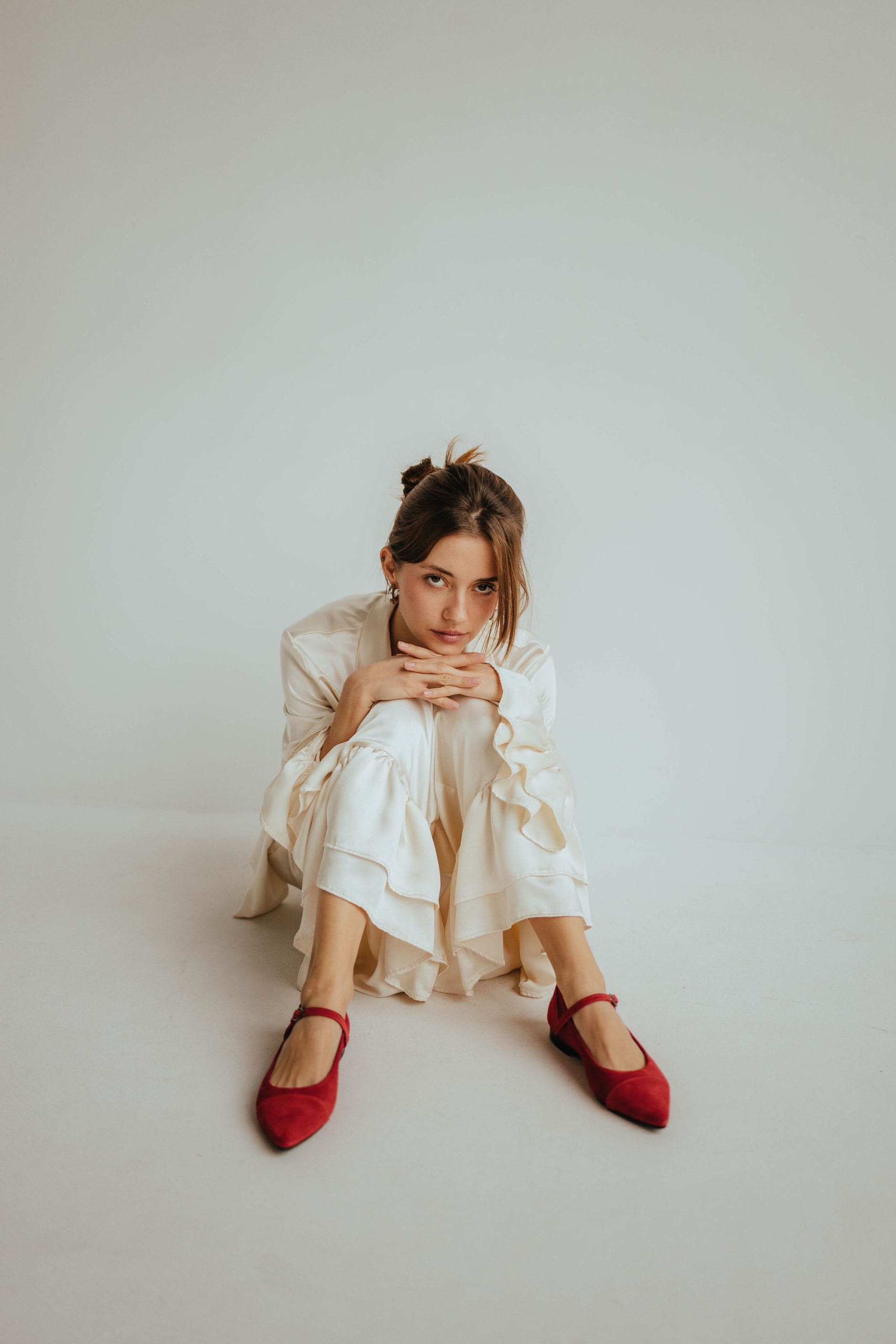 Modern and romantic Mary Janes—sleek lines, soft texture, and a striking red color—deliver all-day comfort.