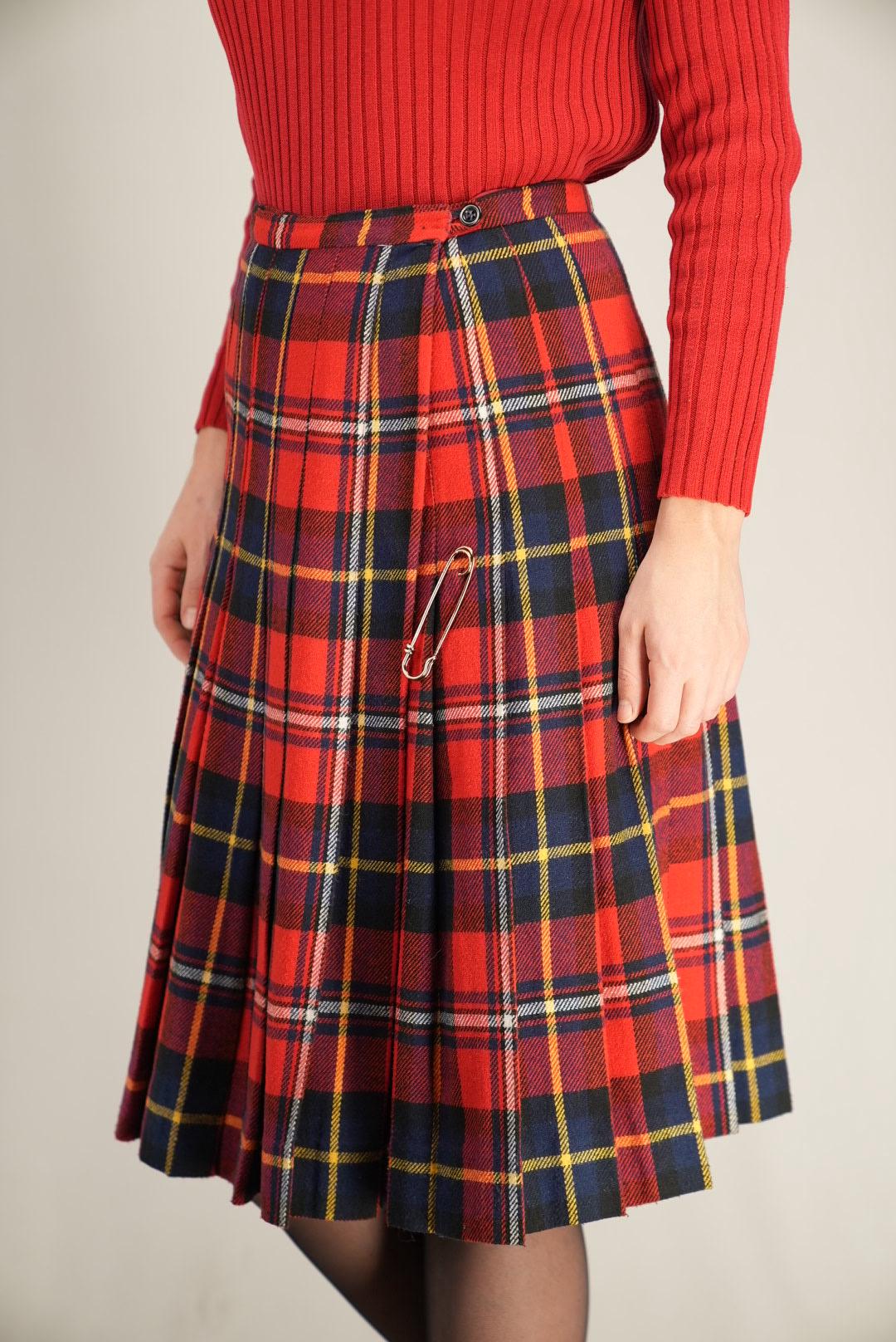 This skirt takes its cue from traditional kilts, featuring a bold red tartan pattern with navy, yellow, and green lines for true heritage charm. The high-waisted design and neatly stitched pleats create a structured A-line silhouette that swings beautifully as you walk. A classic kilt pin detail at the front adds an authentic, slightly edgy touch, making this piece perfect for both everyday wear and festive occasions.