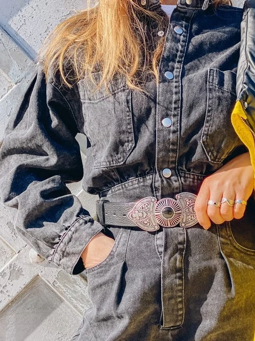 Everyday Retro Style: Paired with a loose sweater and high-waisted jeans (as shown), the black belt complements the classic denim blue. The vintage-inspired carved buckle adds an artistic touch to a simple outfit, creating a casual yet stylish retro vibe for everyday outings and coffee shops.