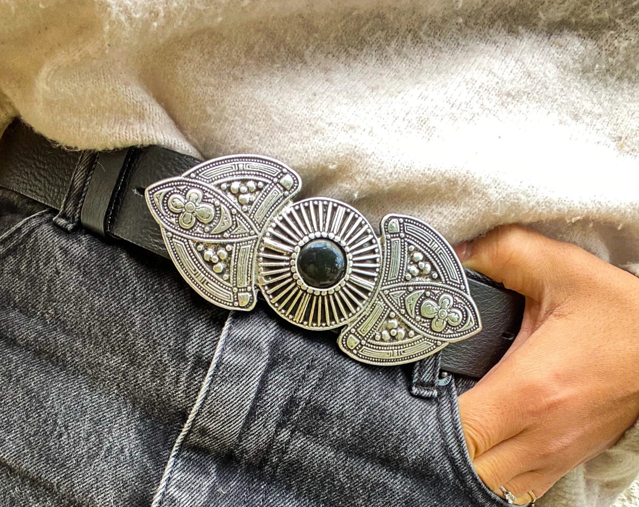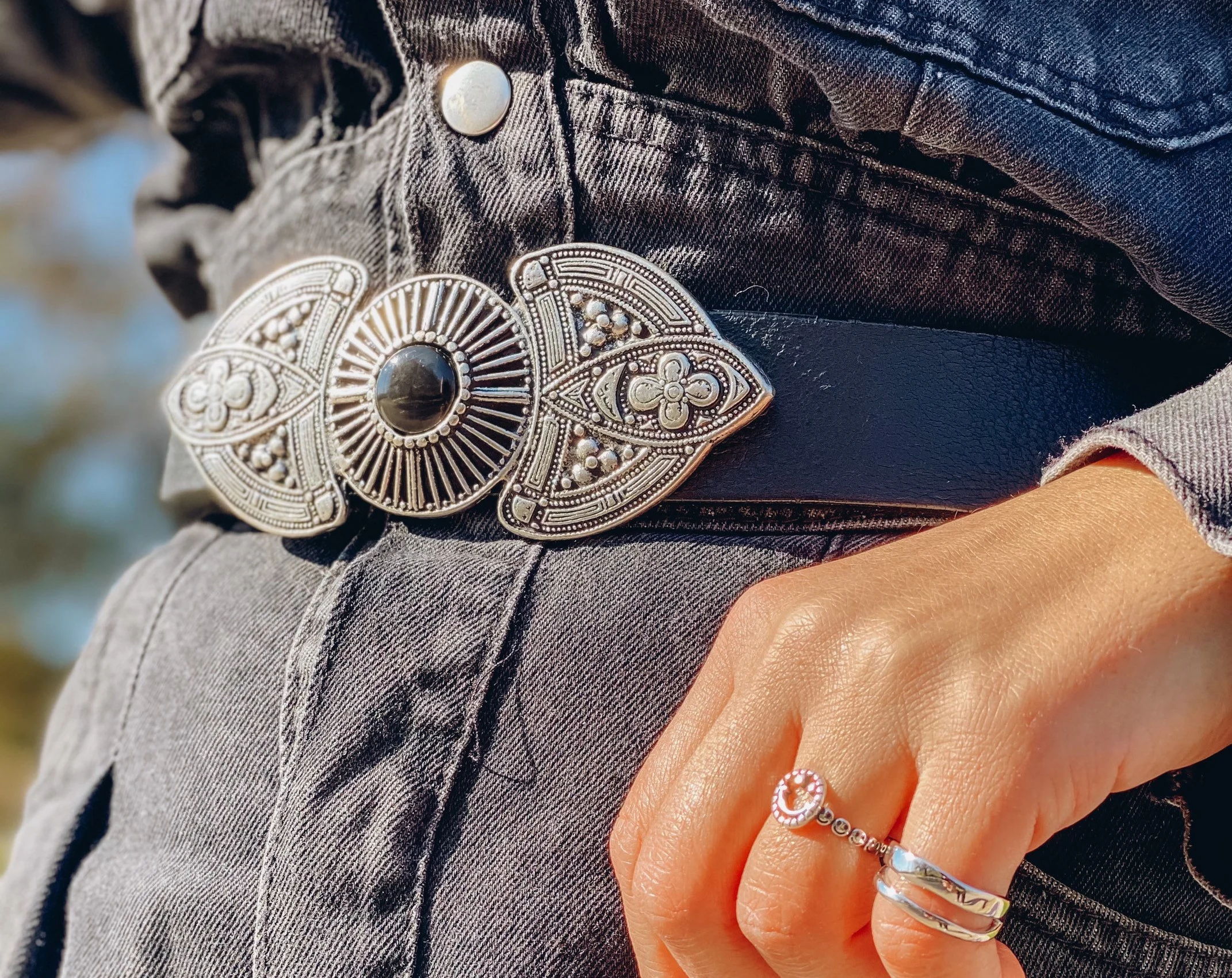 Bohemian Style: Paired with an ethnic dress and ankle boots, the artistic buckle pattern evokes the free and romantic spirit of Bohemia, while a black belt balances the dress’s sophistication. Perfect for music festivals or vacations, this look is perfect for a romantic and uninhibited look.