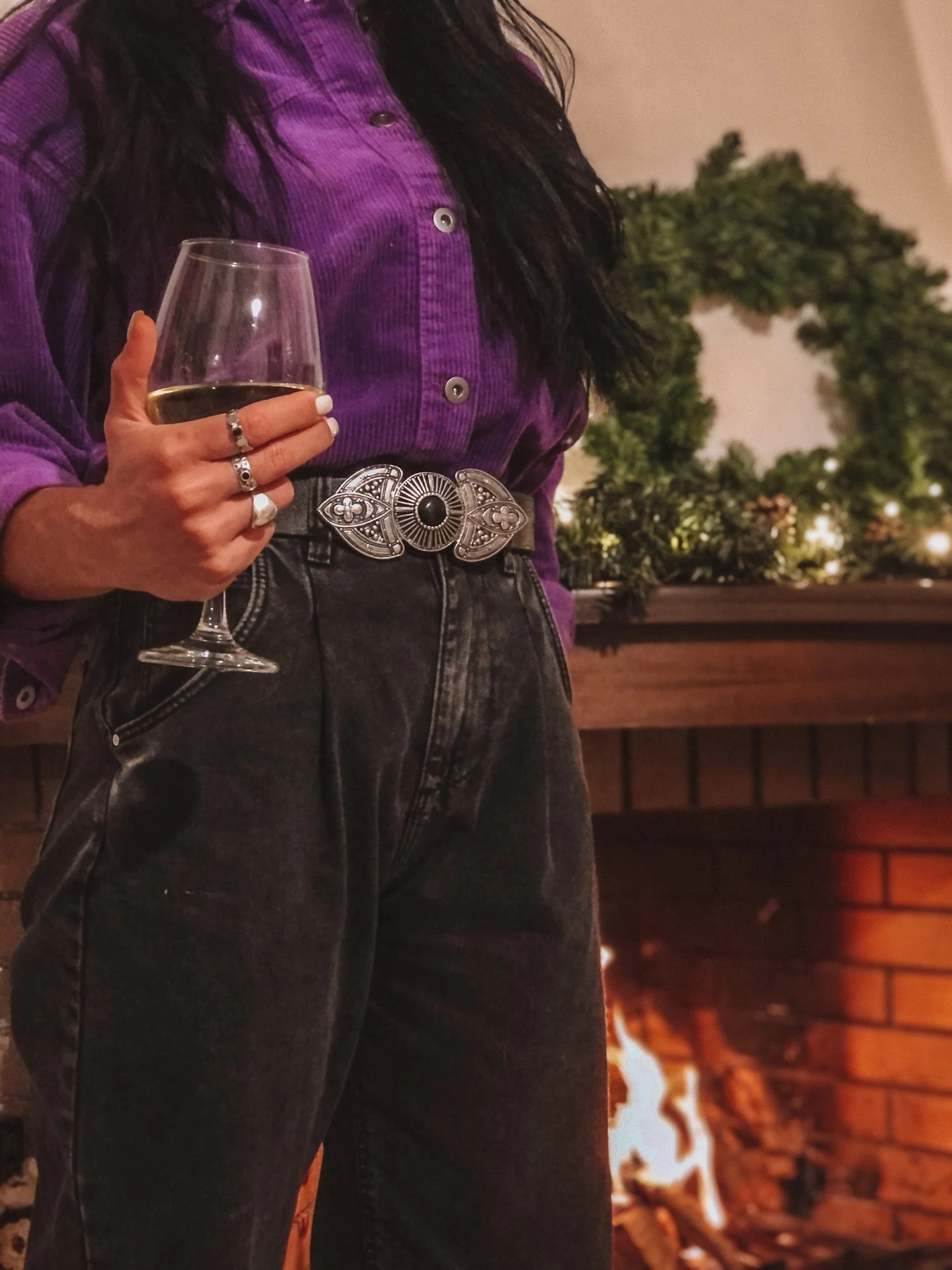 Retro Party Style: Paired with a velvet top and wide-leg pants, the vintage charm of the distressed metal buckle contrasts with the opulent texture of velvet, creating a retro and eye-catching look for parties and get-togethers.