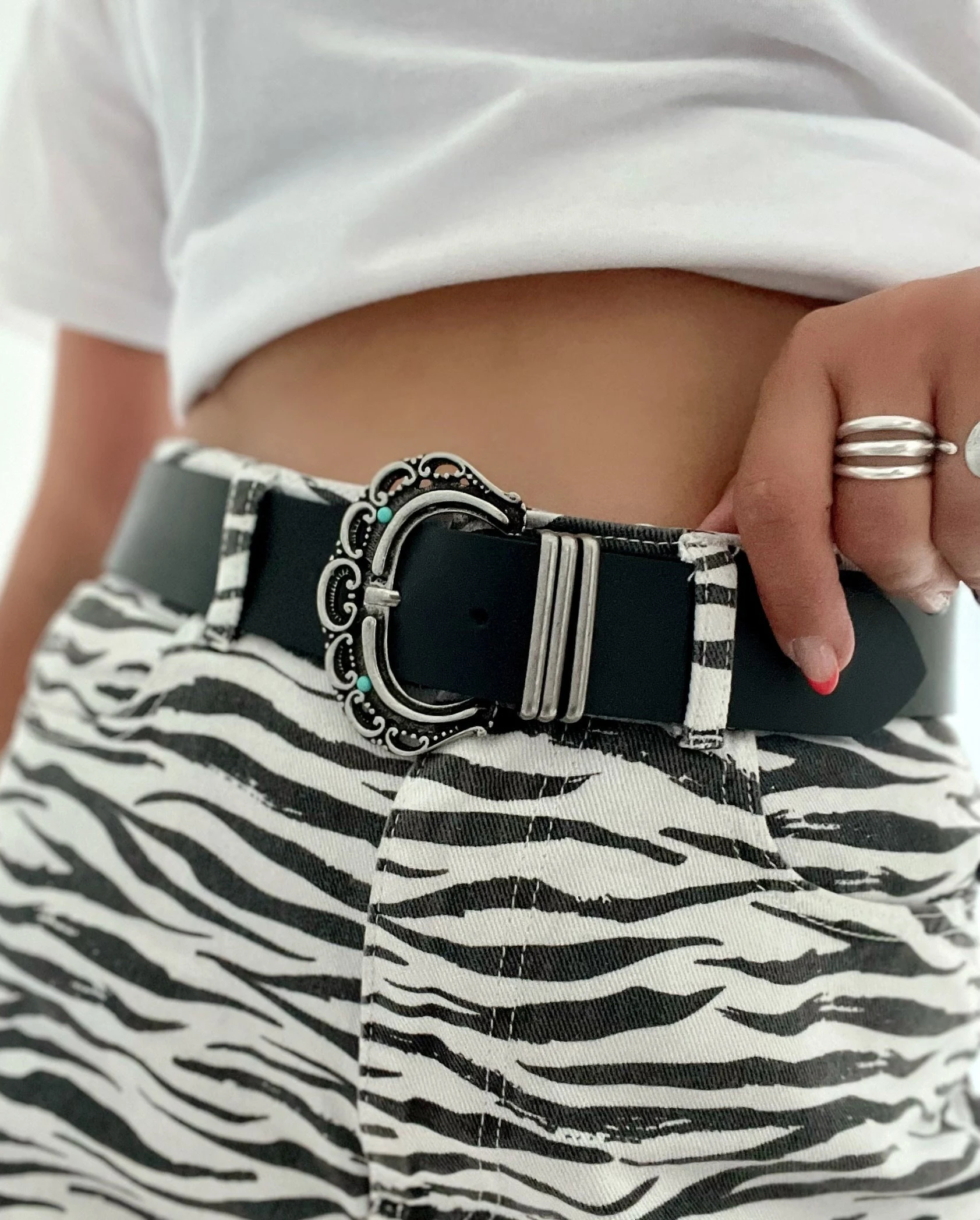 Vintage silver buckle x colorful ornament combination: The core design is an embossed silver buckle + a small blue charm. The embossed buckle conveys a vintage artistic vibe, while the small blue charm injects a vibrant bohemian vibe. Combined with the black belt, the belt elevates from a basic accessory to a statement piece, adding a striking retro touch to any zebra-print or solid-color outfit (as shown with zebra-print pants).