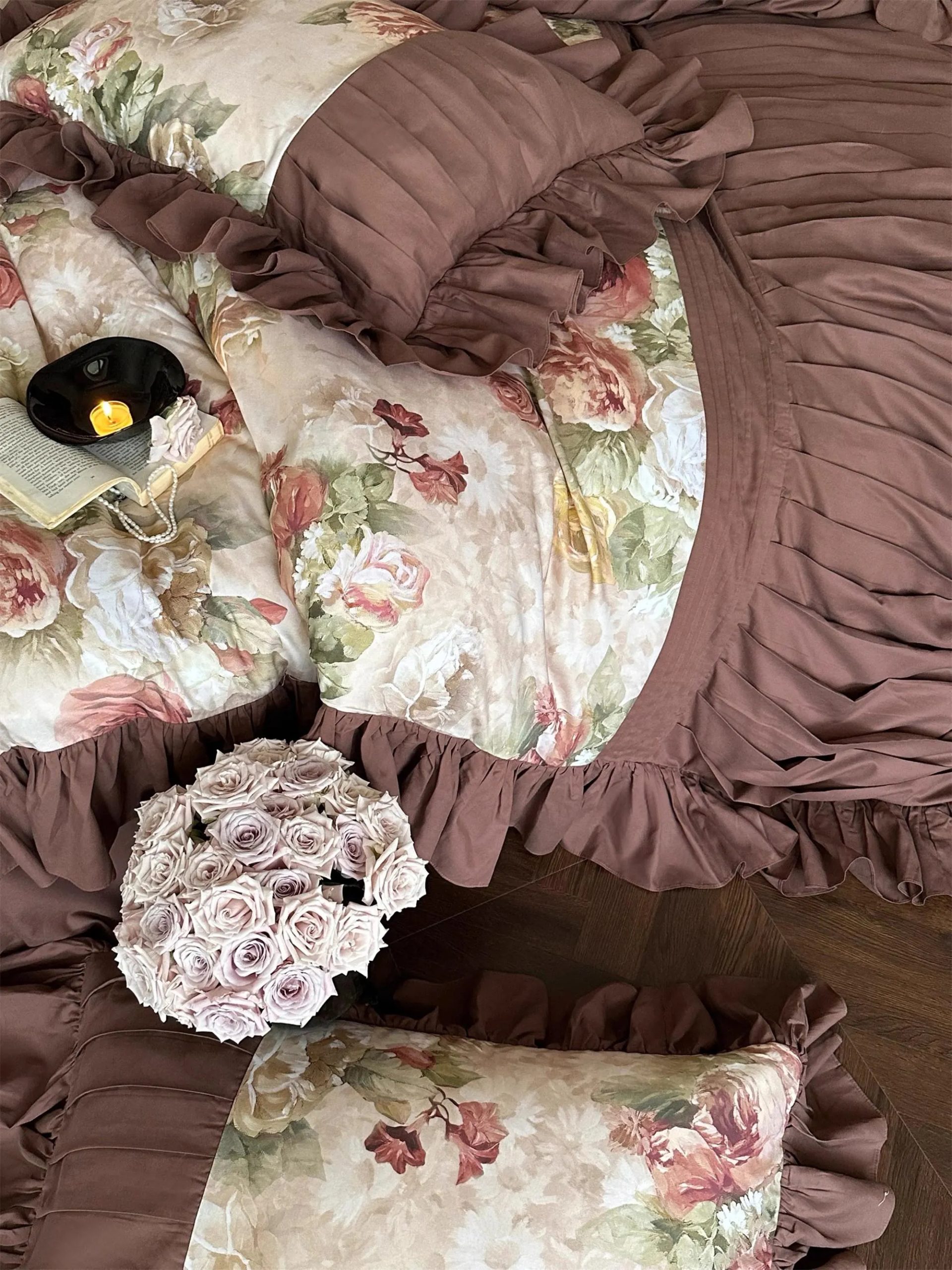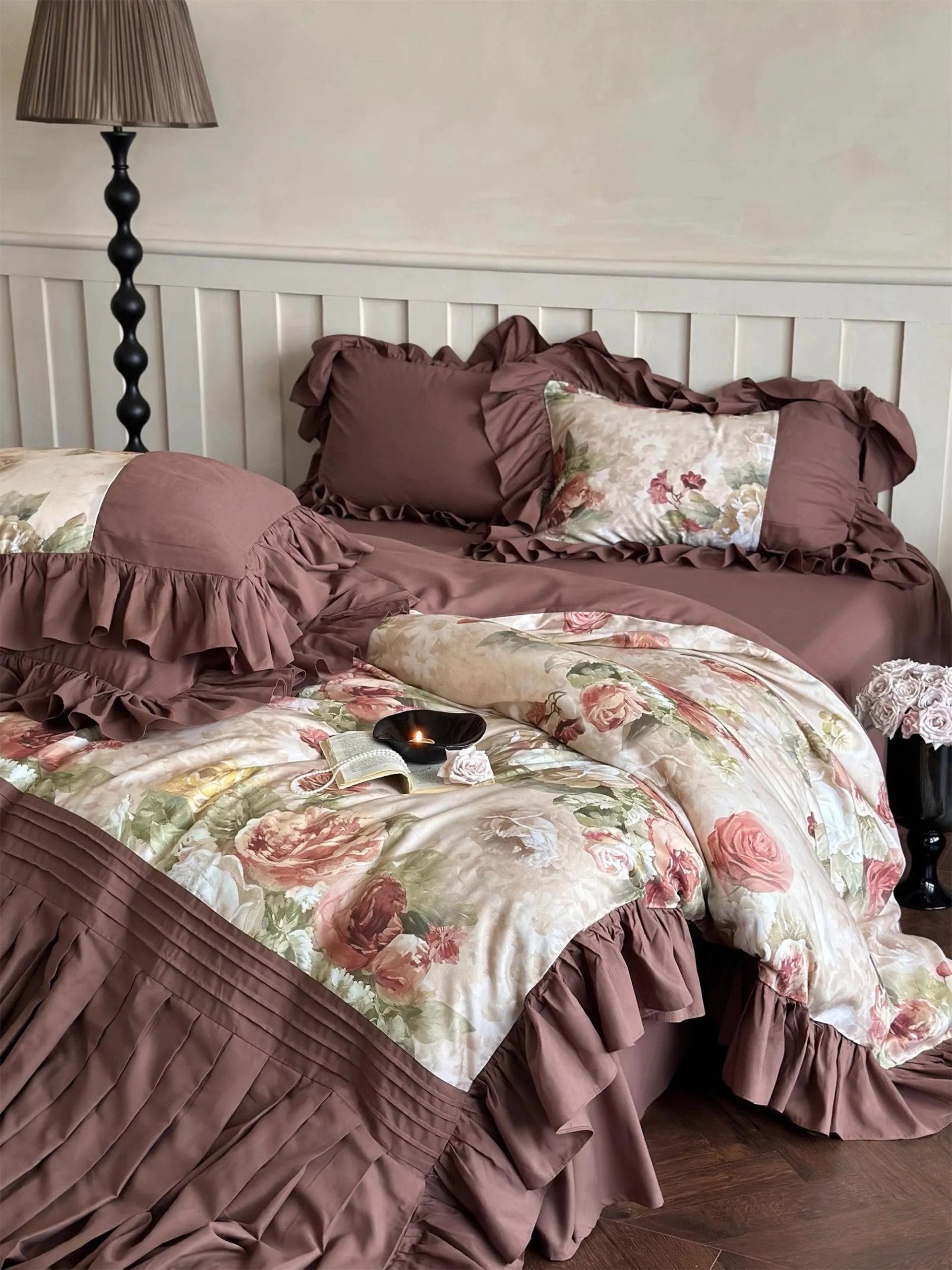 Combining the romantic and carefree charm of French retro style with the artistic texture of floral oil paintings, this ensemble features a coffee-colored base, a large floral print, and layered ruffles, creating a cozy bedroom reminiscent of a vintage oil painting. Every floral print and pleat evokes the ritual of artistic living, transforming sleep into an immersive, vintage aesthetic experience.