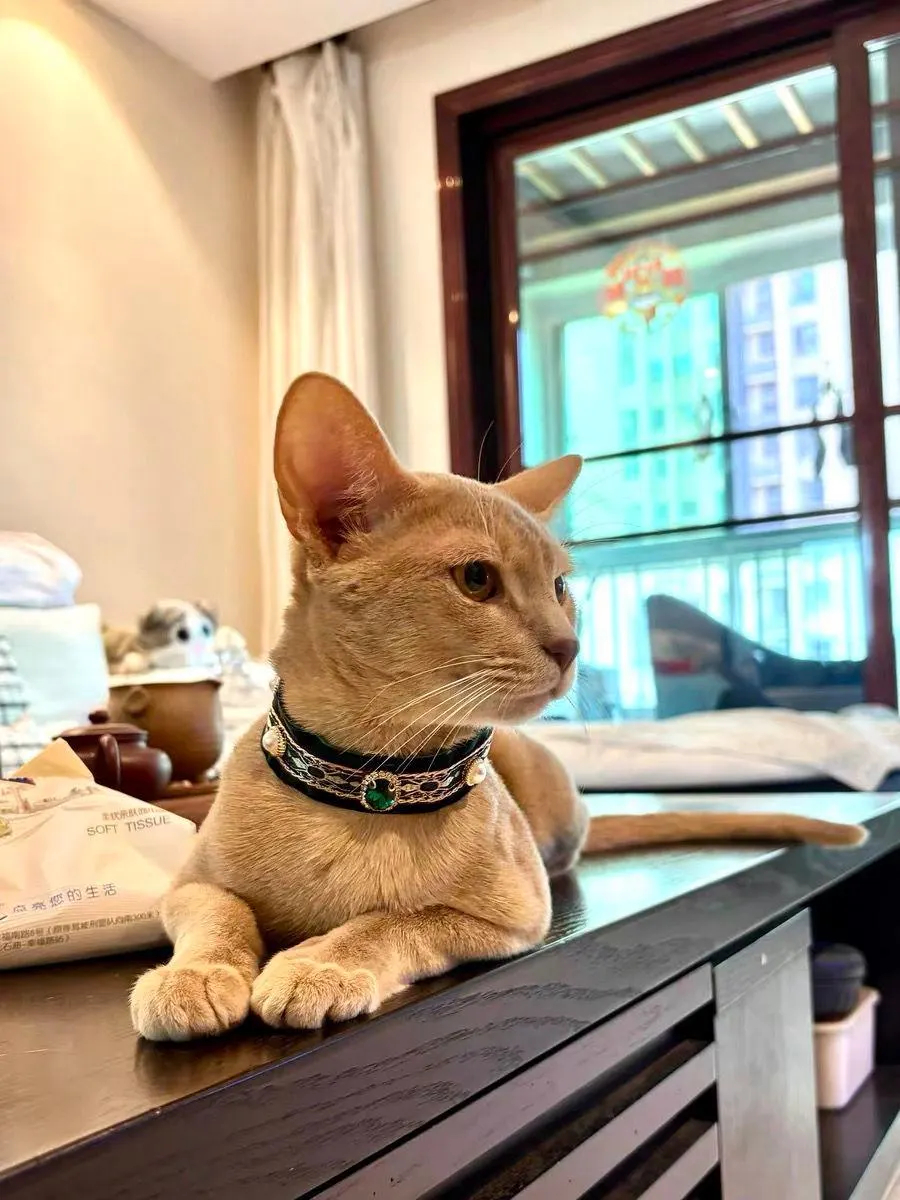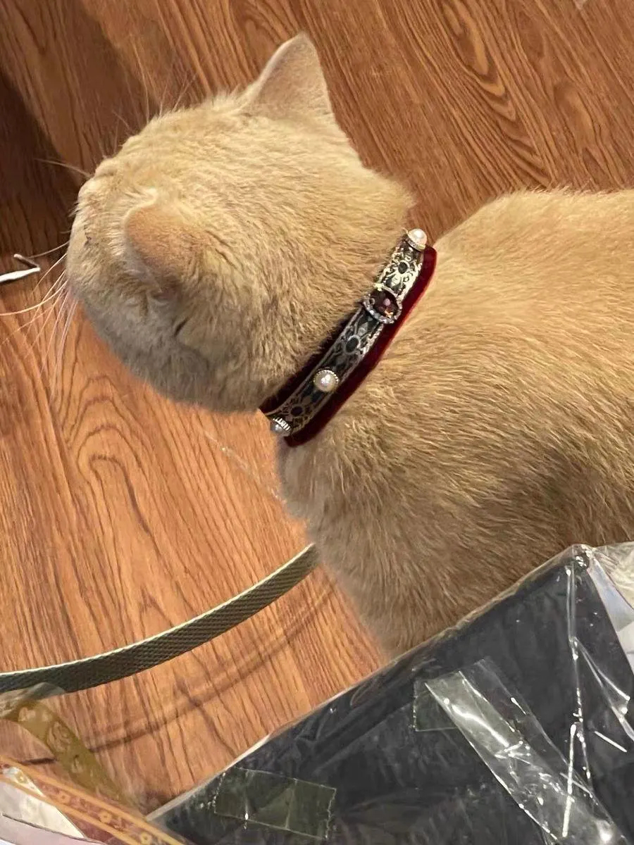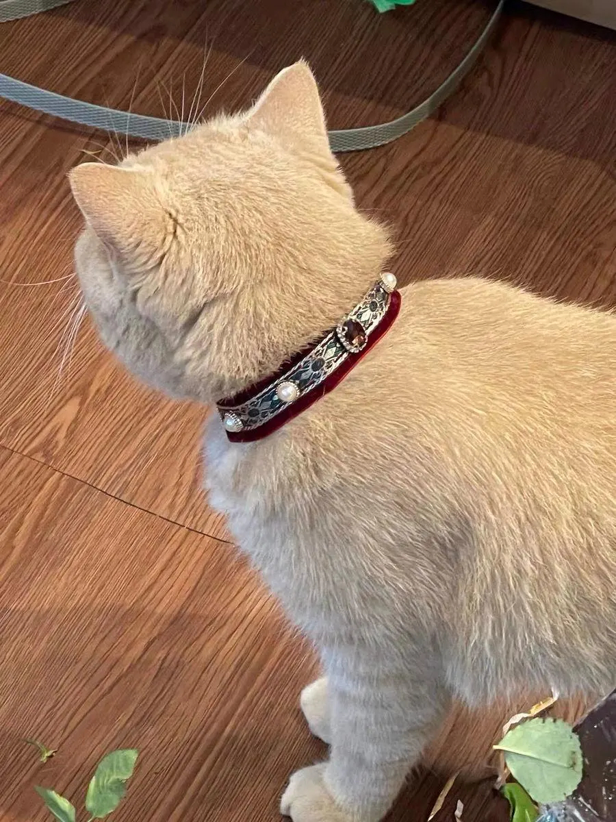 The collar’s edges are softened, its curve perfectly conforming to the cat’s neck curve: when an Egyptian Mau wears it, its slender body against the black pattern, the emerald green glimpsed through its fur, the collar swaying gently with each paw movement, like a “little master just stepped out of a court portrait”; when it tilts its head to look at you, the gemstone’s luster and the cat’s eyes overlap, even its “daydreaming” becomes an adorable “noble contemplation,” making every snapshot a masterpiece worthy of a vintage-style photo album.
