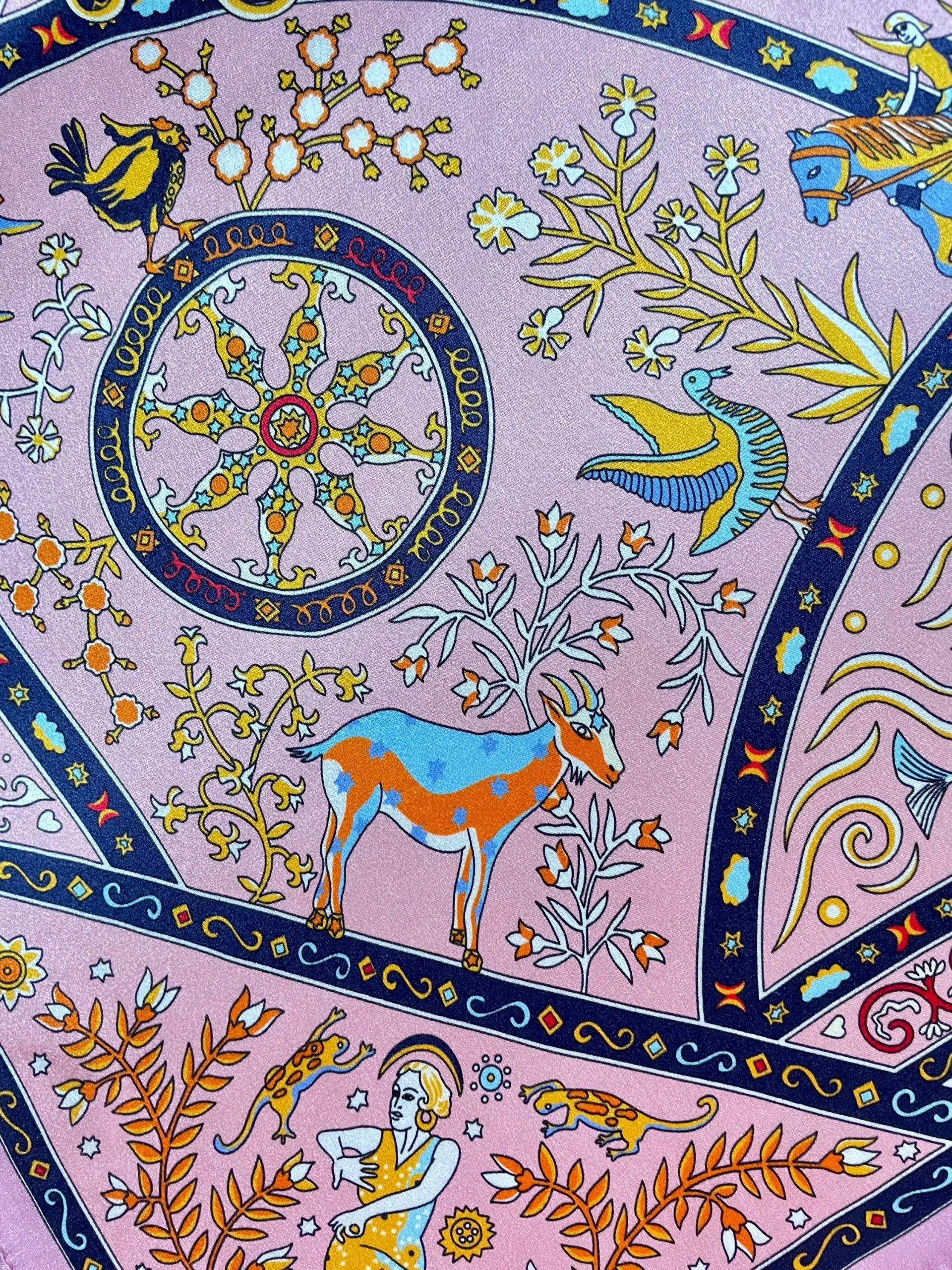 Detailed design: The scarf’s edges are bound in a dark color, the subdued tone softening the visual tension of the patterns. This strengthens the outline of the designs while maintaining an overall style that is “romantic without being ostentatious,” suitable for a variety of retro looks.