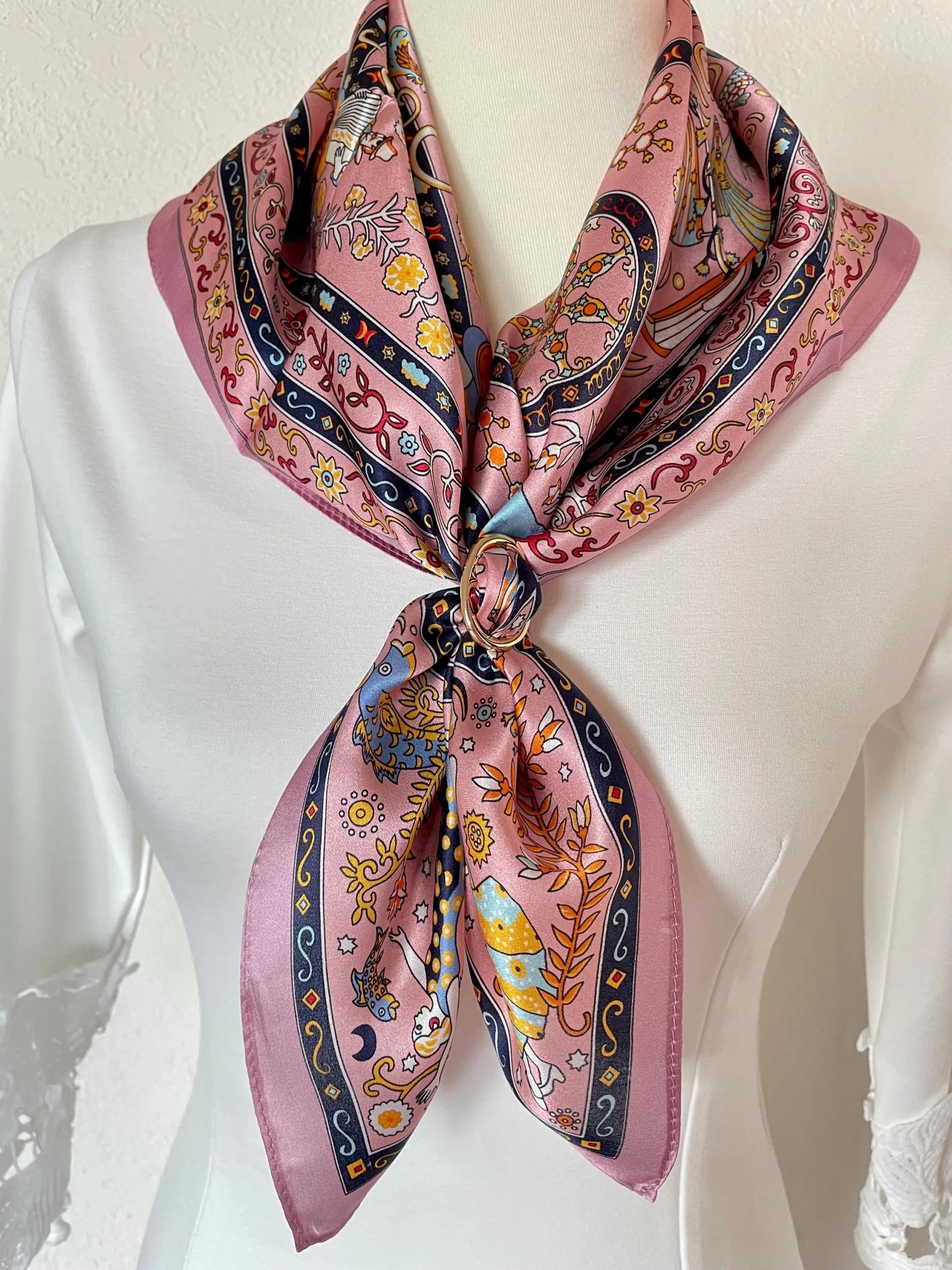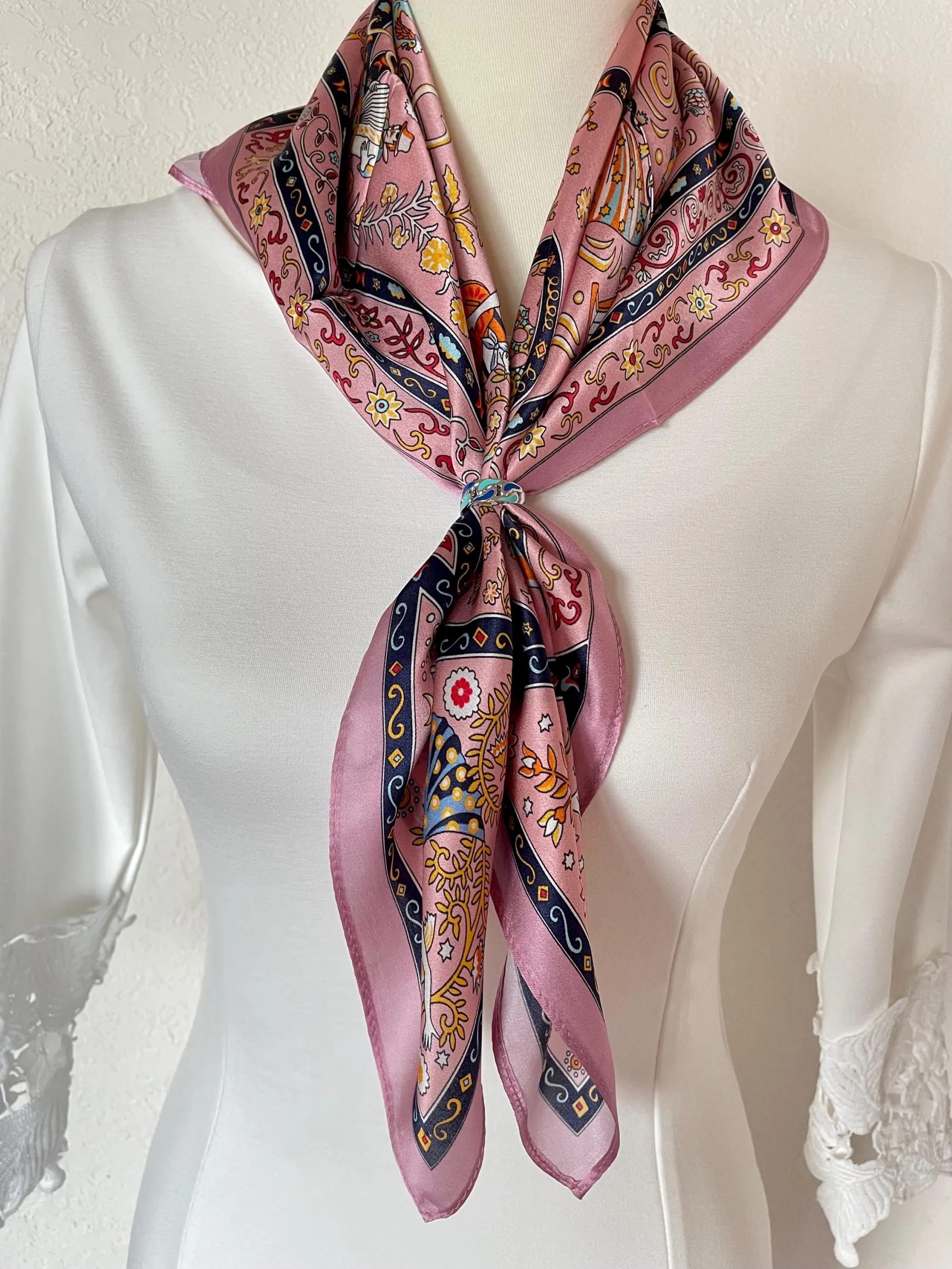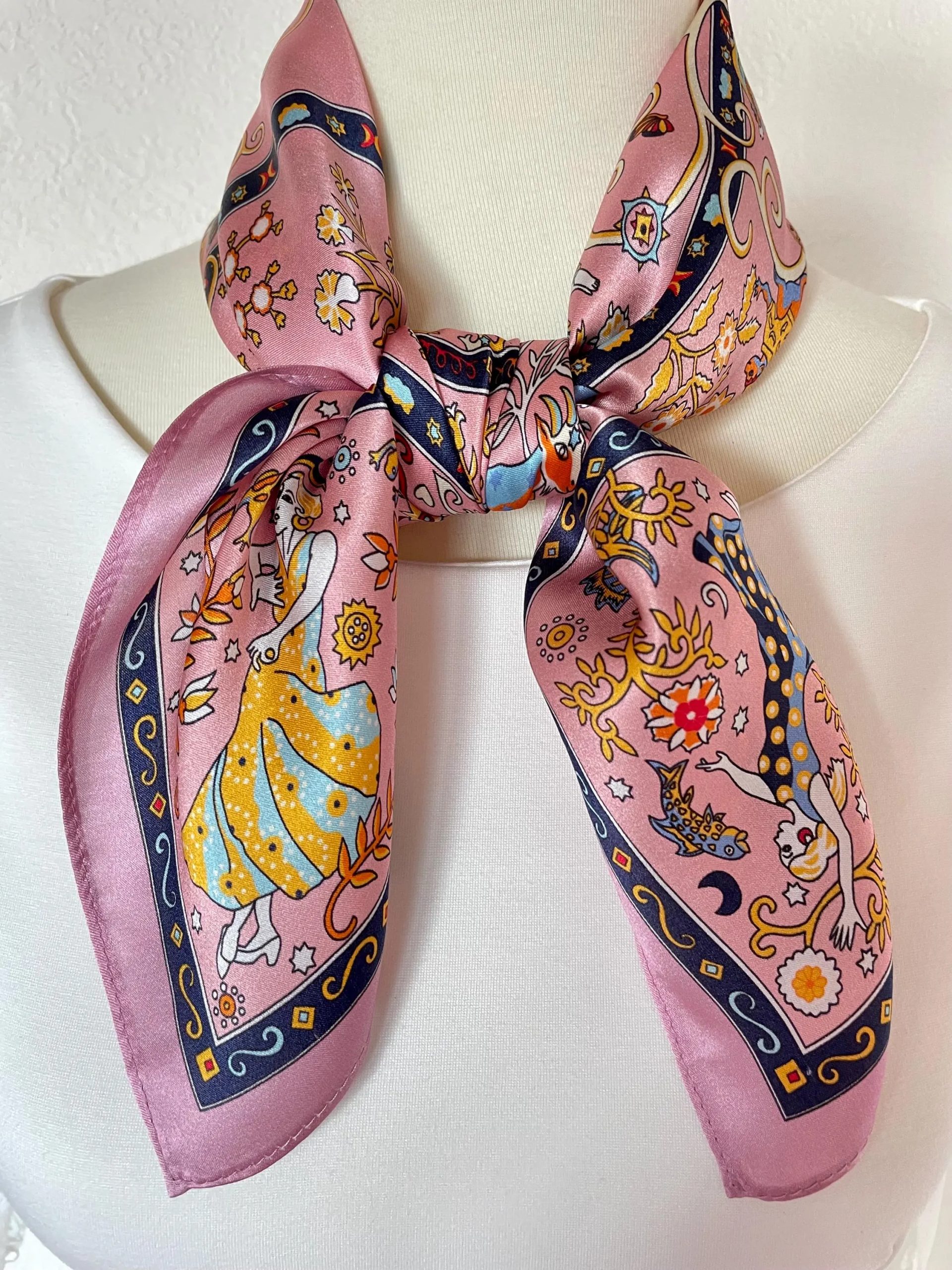 **Light Vintage Draped Knot:** Fold the scarf in half into a triangle and tie it behind your neck, allowing the front to drape naturally to your chest. Pair it with a light-colored dress to create a romantic atmosphere with its vintage courtly pattern.