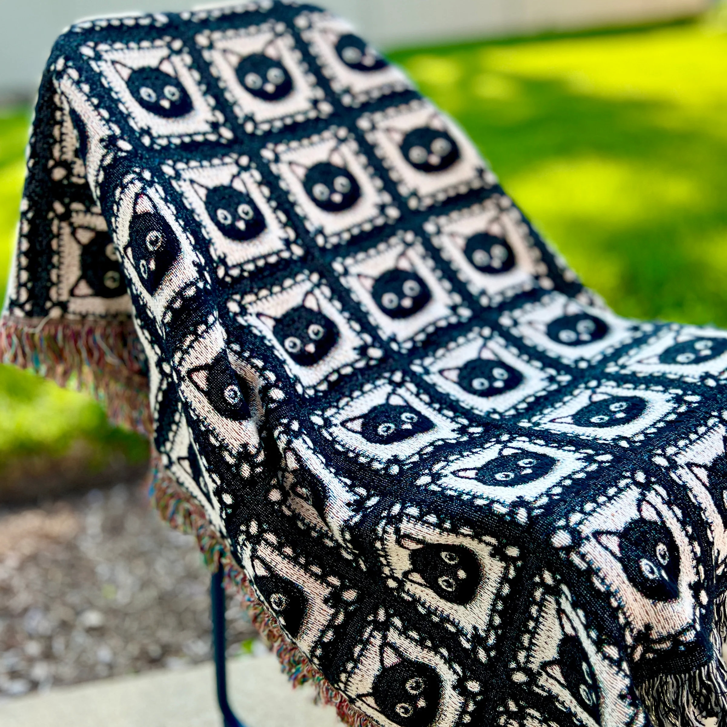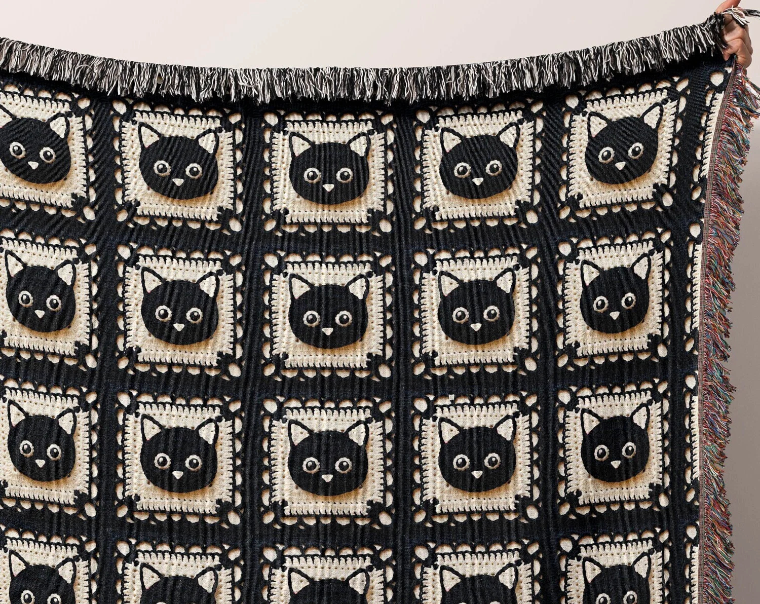 Cute Black Cat Pattern: Contrasting black and white create a vibrant collection of black cats, each with playful eyes, ready to meow. The retro grid layout creates a touch of vintage charm within a cute throw. This is a favorite among cat lovers, embodying their pampering with cats as intimate companionship, creating a comforting feeling surrounded by their felines at home.