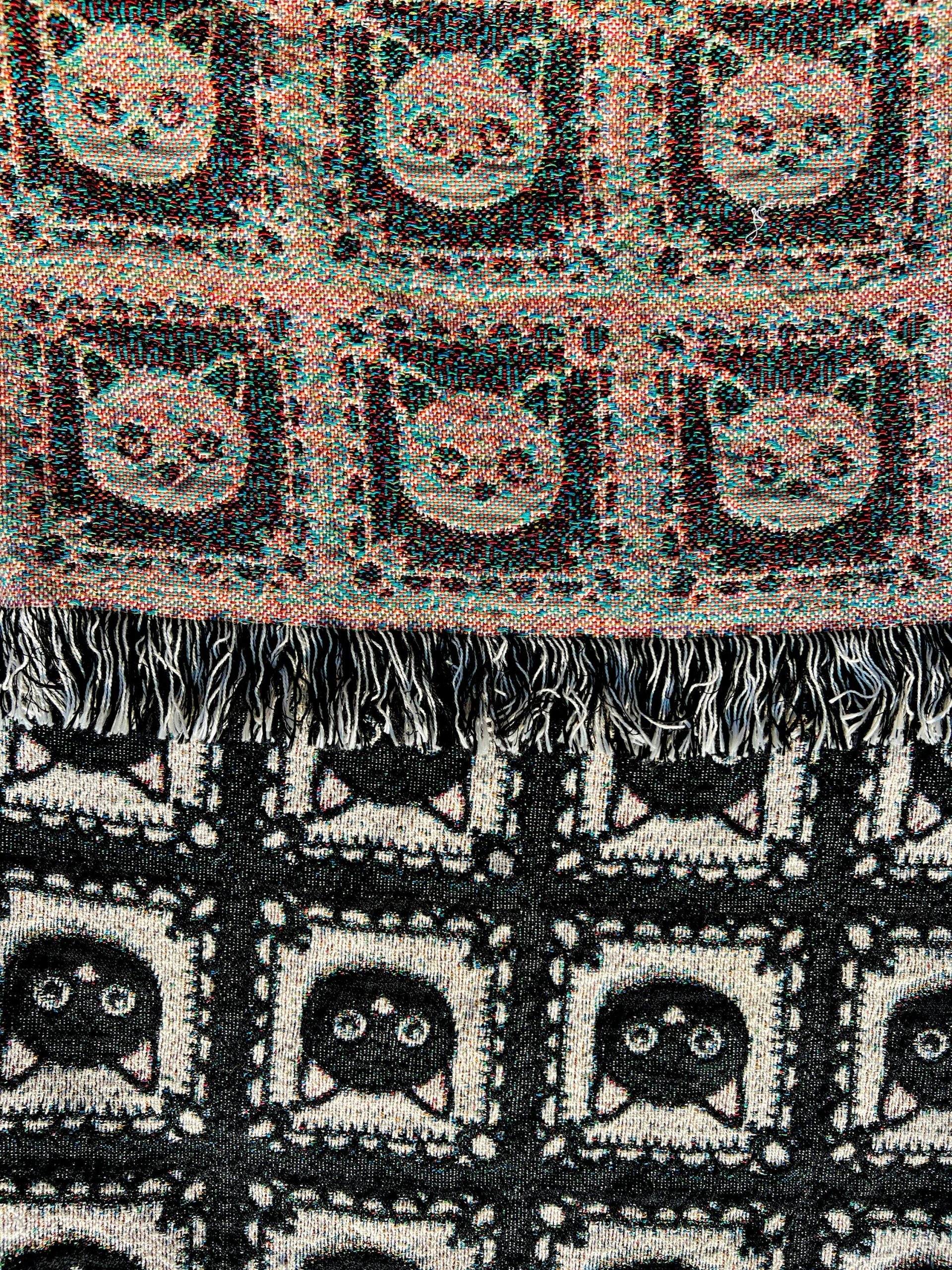 Handmade Tassel Edge: The multicolored handmade tassels embellish the edge of the blanket, creating a casual, retro feel that contrasts beautifully with the cute black cats. The gently swaying tassels add a layer of cute detail, elevating the blanket from a practical piece of fabric to an eye-catching “cat art blanket.” Every detail showcases meticulous attention to detail.