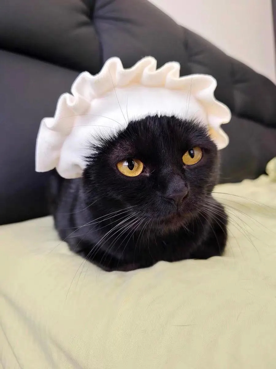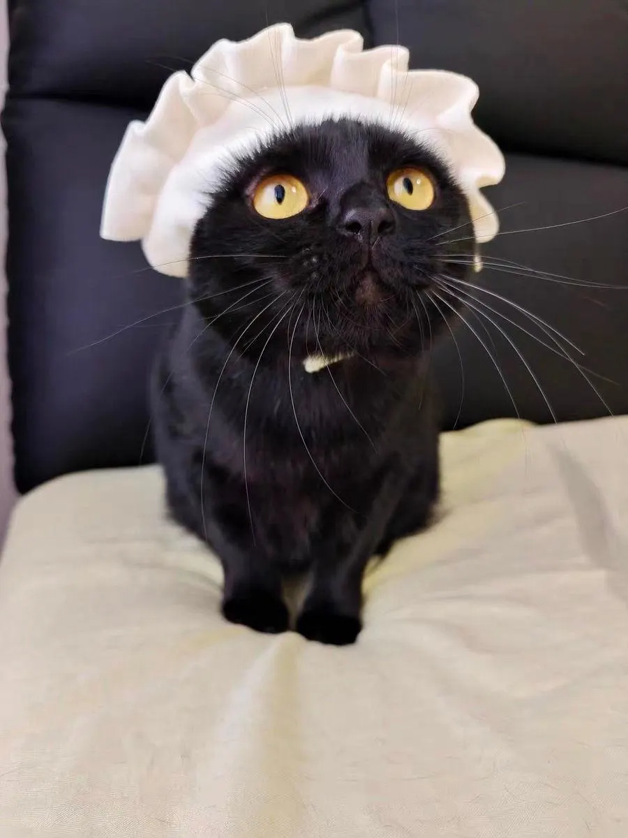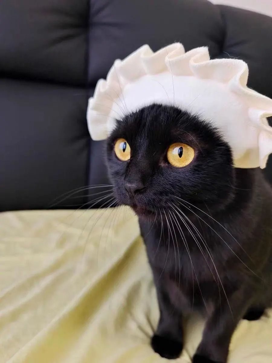 The headdress is crafted entirely from smooth, skin-friendly soft cotton fabric, with a texture so soft and delicate it’s irresistible to gently touch. The main fabric feels as light and breathable as a cloud, without any rough edges or burrs. It won’t cause itching or scratching when worn against the delicate skin around a cat’s ears and scalp, making it comfortable even for short-haired black cats with sensitive skin (such as Bombay cats). The lace trim features fluffy, pleated details, maintaining a vintage maid-like elegance without being too heavy or stuffy. It won’t make your cat feel constricted even after extended wear indoors or in spring and autumn.