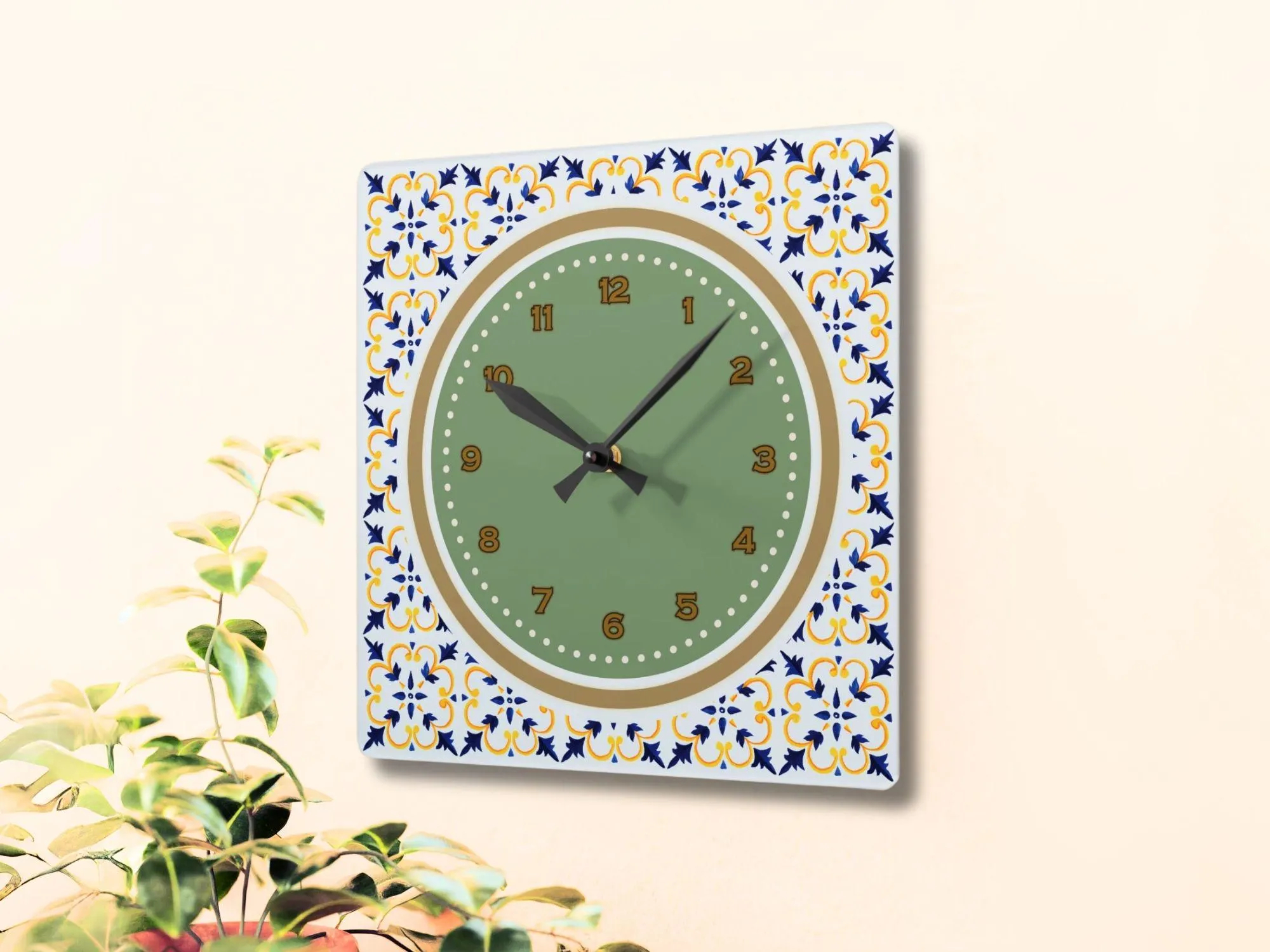 This clock features a Mediterranean floral tile style as its core design element, with a light green background adorned with blue and yellow floral patterns. It serves as both a practical timekeeping tool and a gentle decorative piece, injecting a fresh, vintage feel into any space.