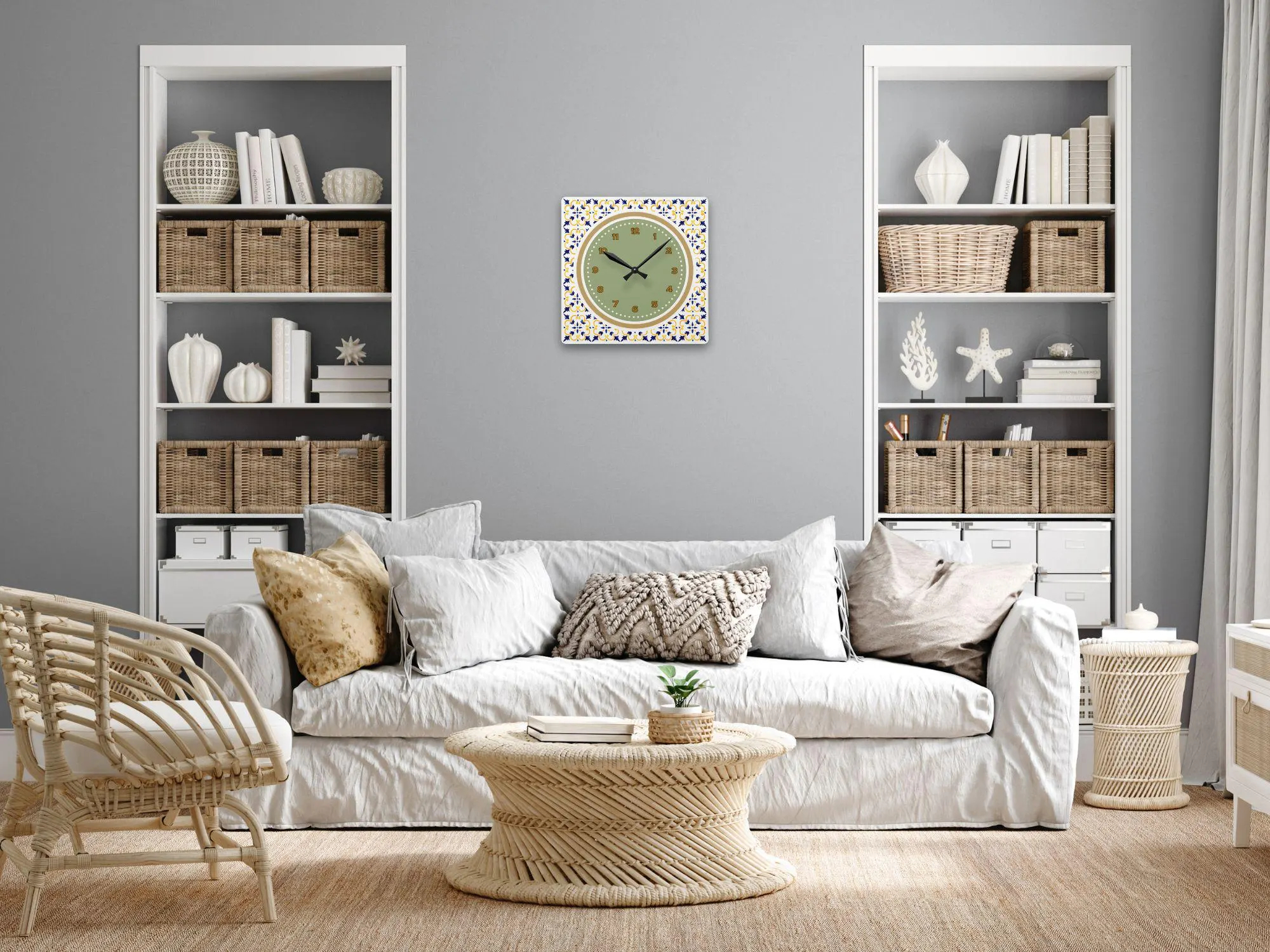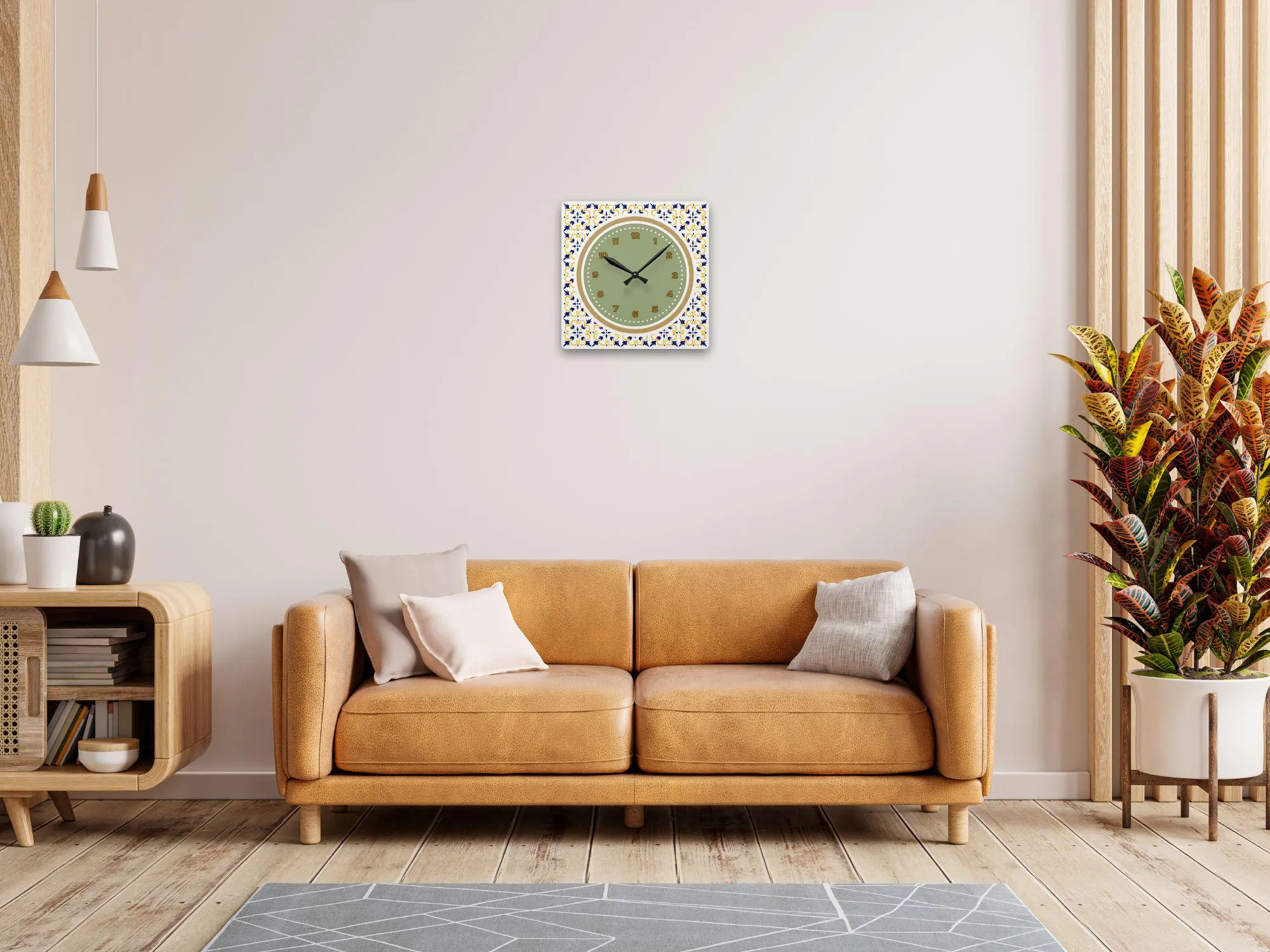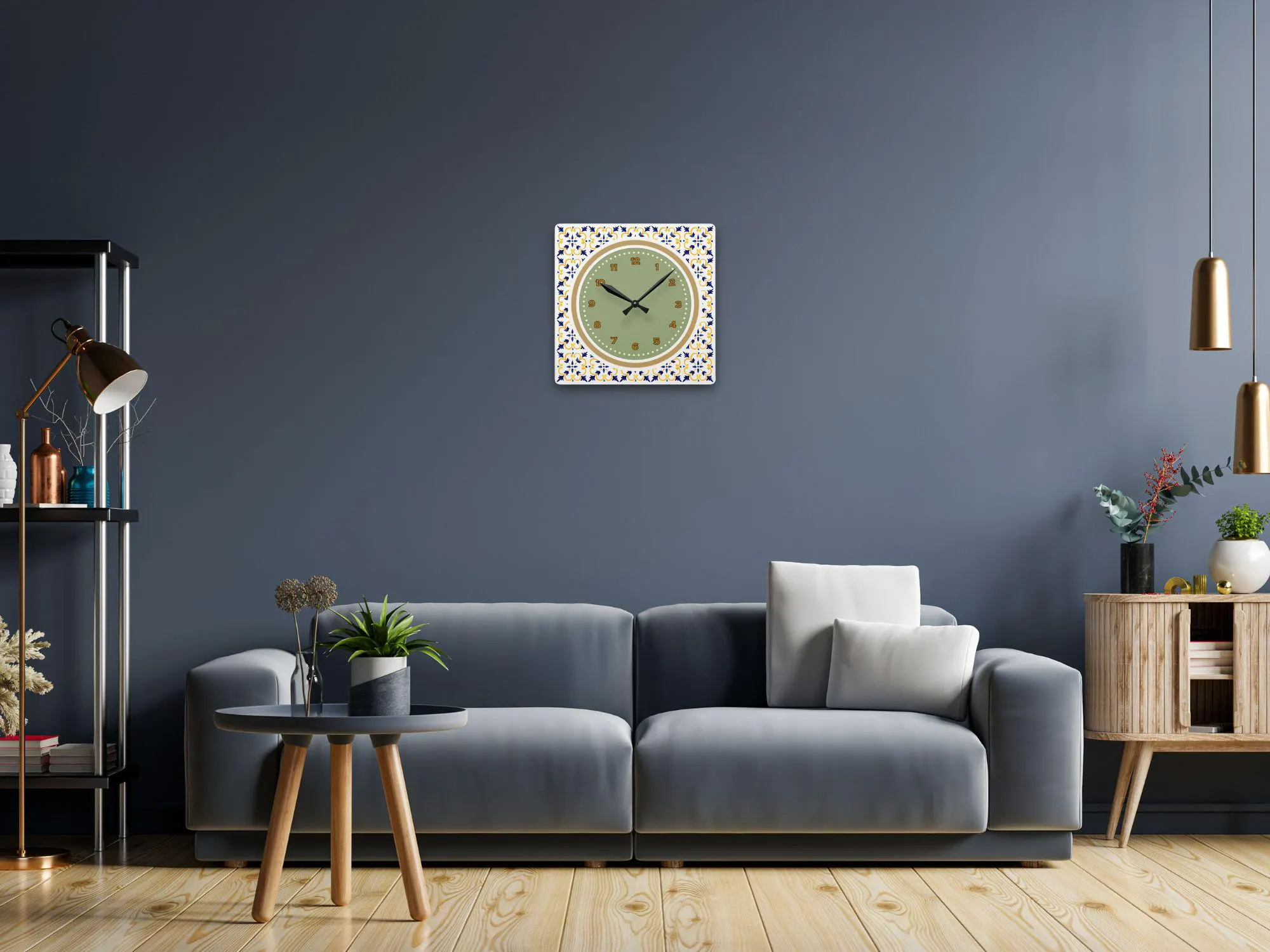 The outer frame decoration is the core highlight of this clock’s design: the square frame is adorned with a classic Mediterranean tile pattern, the symmetrical pattern outlined with fresh and lively blue and yellow lines, a signature element of the Mediterranean style; the delicate pattern contrasts with the simple dial, making the clock resemble a miniature vintage tile decoration, pleasing to the eye from afar, and revealing exquisite details upon closer inspection.