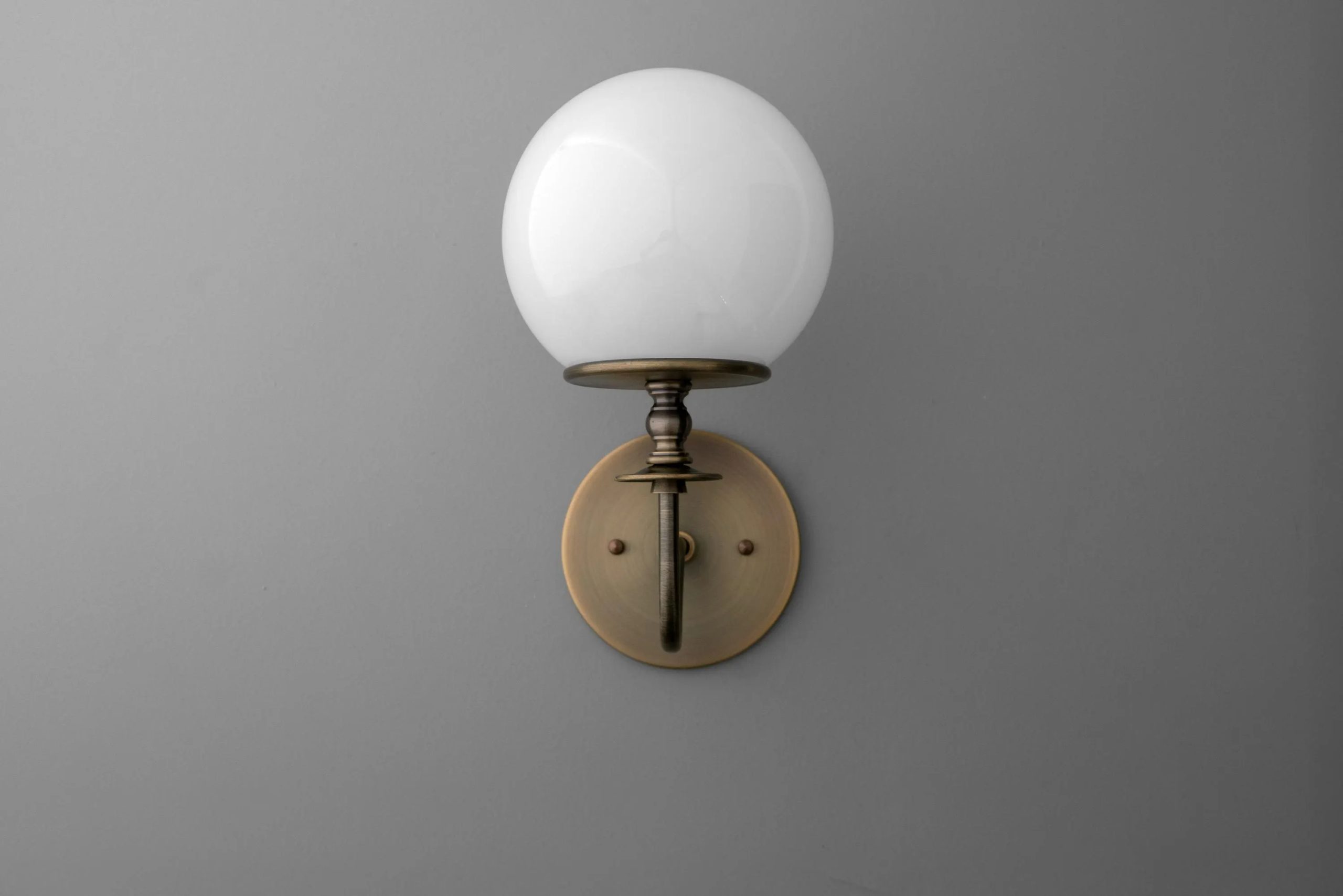 A perfect blend of classic and modern: The milky white opal sphere rests atop a machined candlestick-style lamp post and curved arm, exuding timeless elegance and versatility.