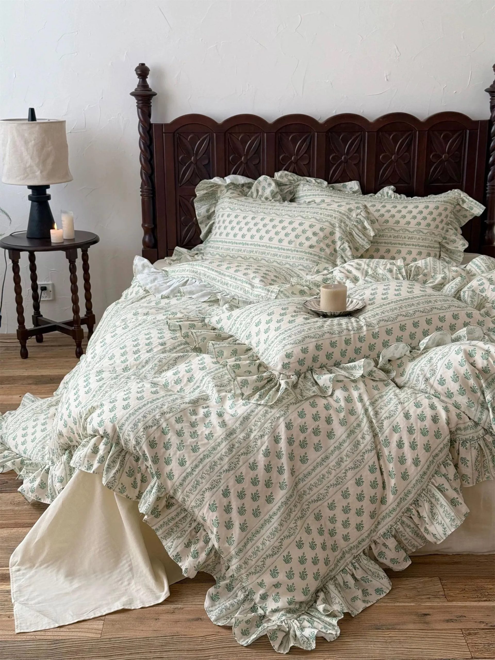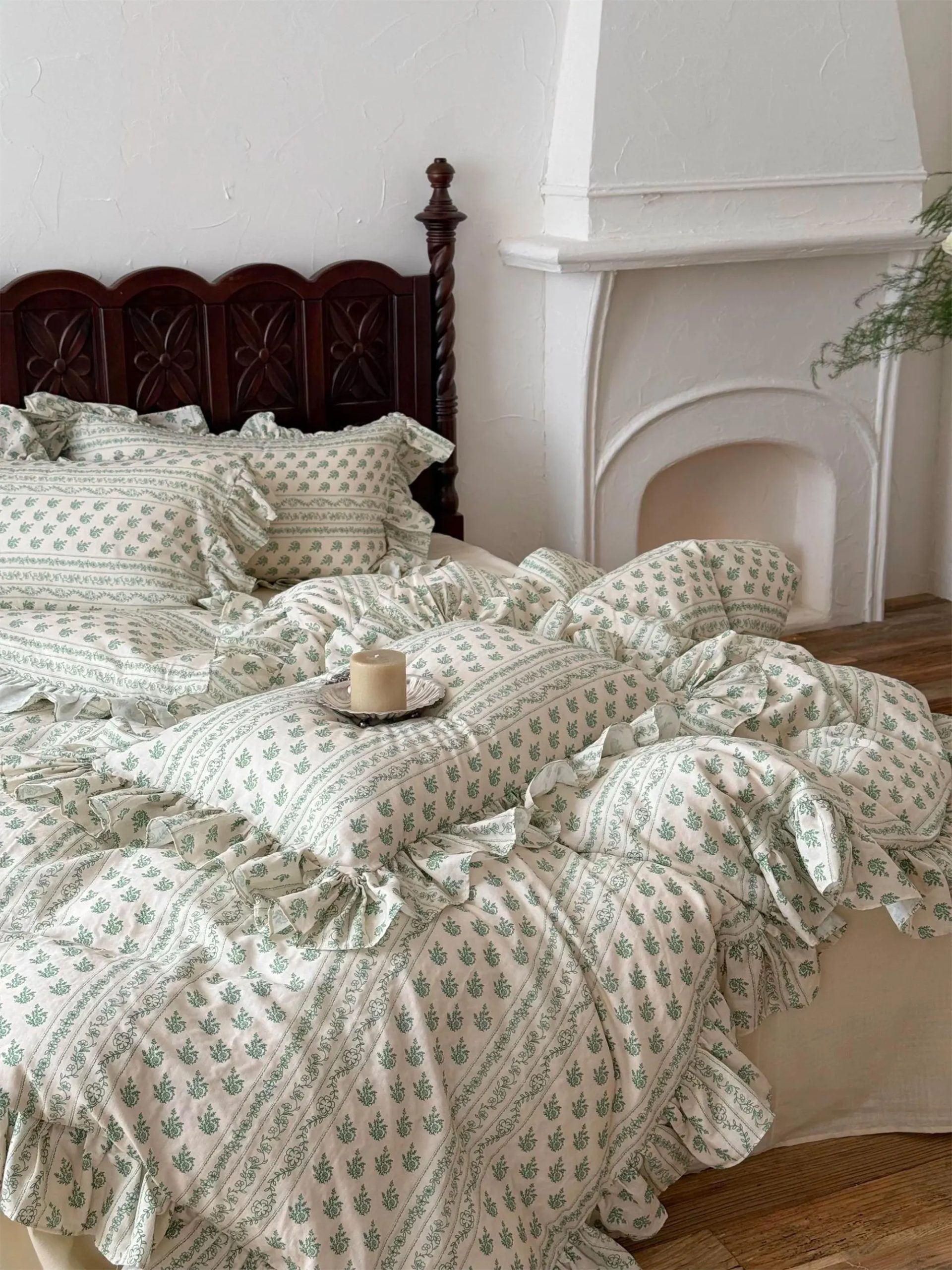 Multi-layered ruffle craftsmanship: The bed skirt and pillowcase feature hand-layered ruffles, creating vibrant, dynamic pleats that imbue the bedding with the romantic, soft beauty of French country living, exuding a refined craftsmanship within its rustic elegance.