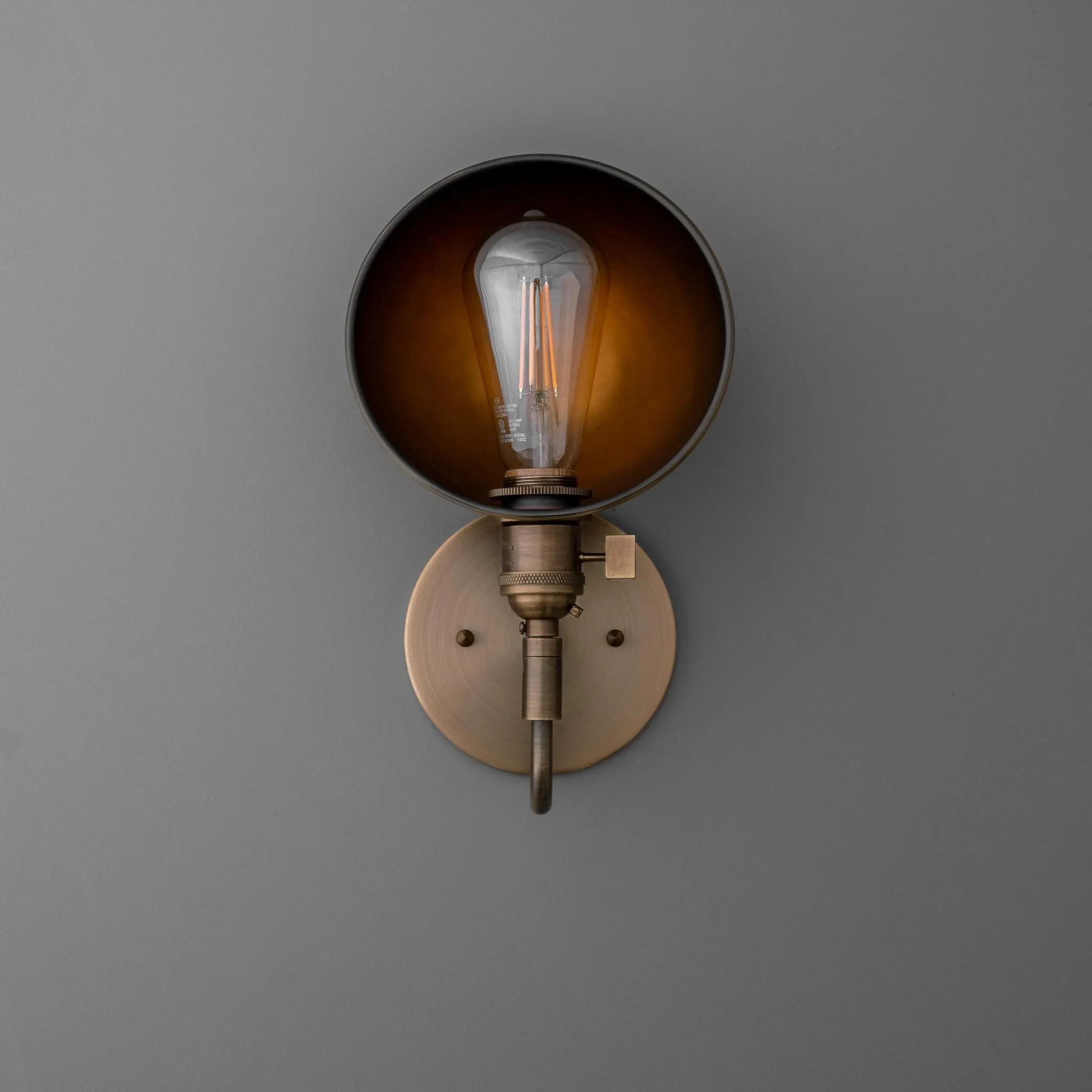 A distinctive silhouette: A shallow, bowl-shaped reflector sits behind the bulb, supported by a short gooseneck arm—compact, sculptural, and eye-catching.