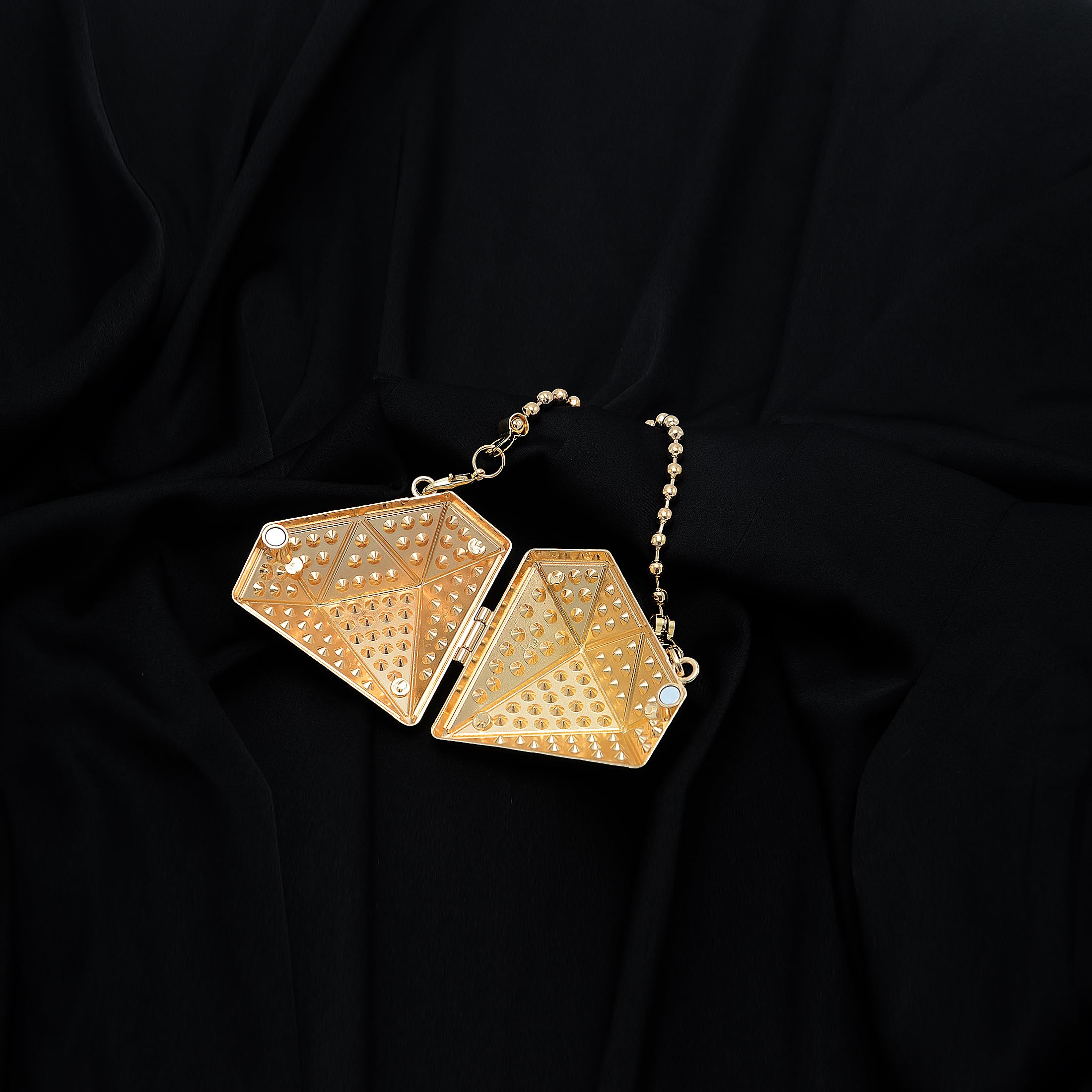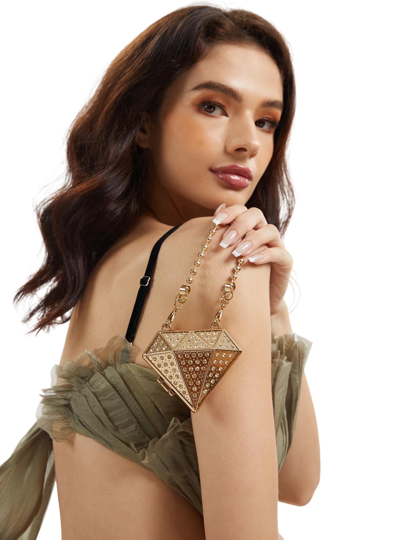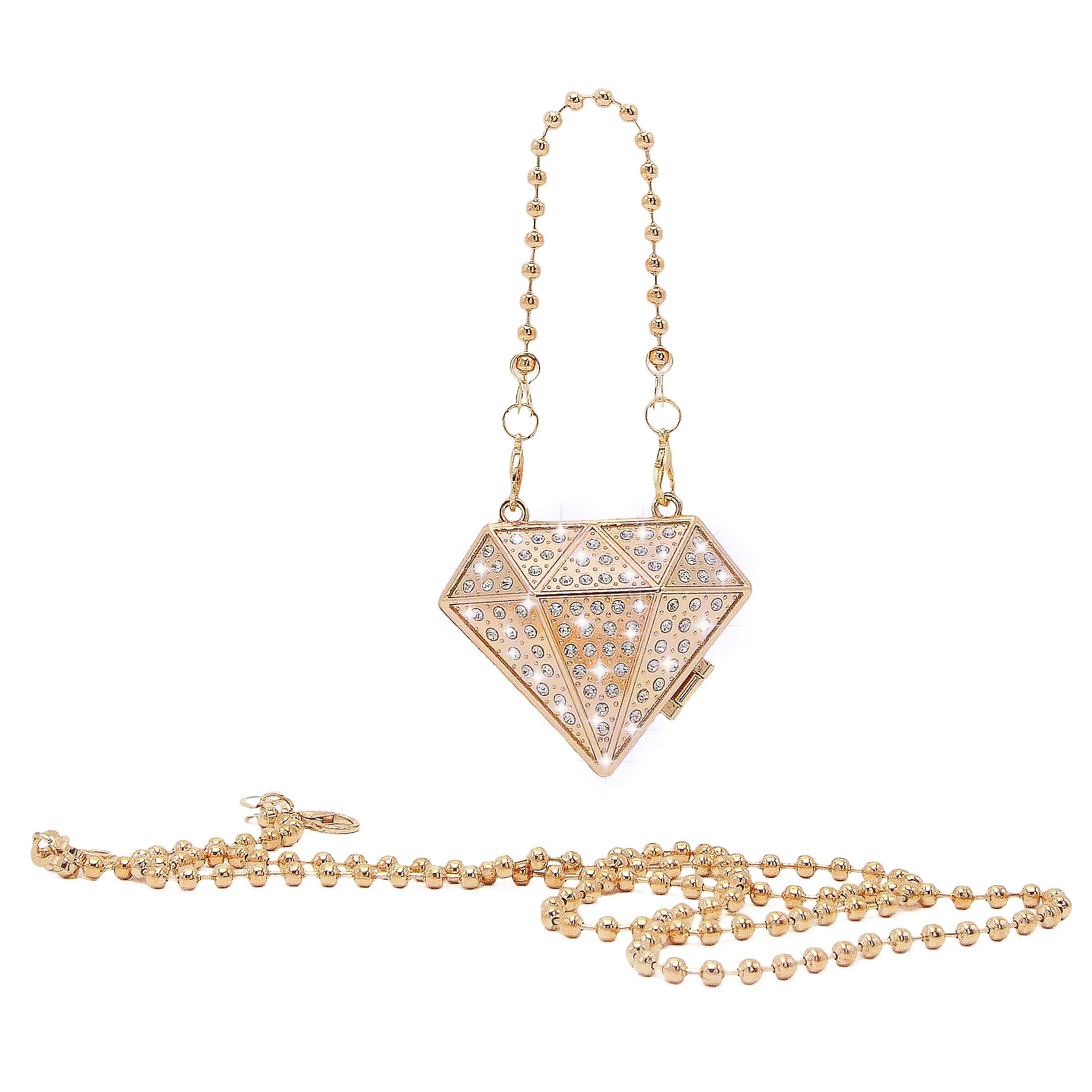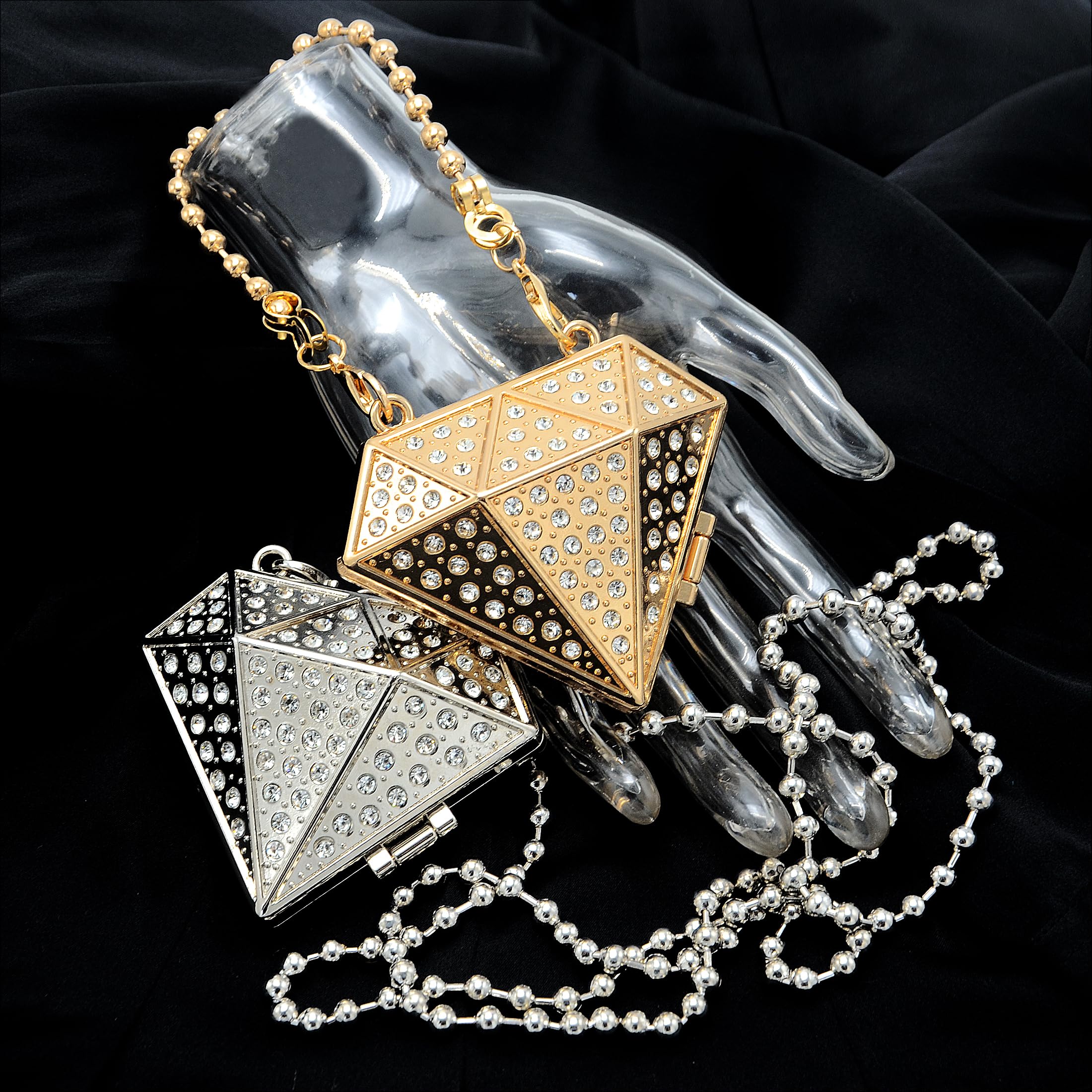 Shine from every angle with this diamond-shaped mini clutch, designed with geometric facets and all-over rhinestone sparkle. The sculptural hard-case silhouette looks like jewelry, making it the perfect statement accessory for parties, weddings, and night-out outfits. Comes with both a short and long chain so you can style it as a handheld mini bag or a shoulder/crossbody piece.