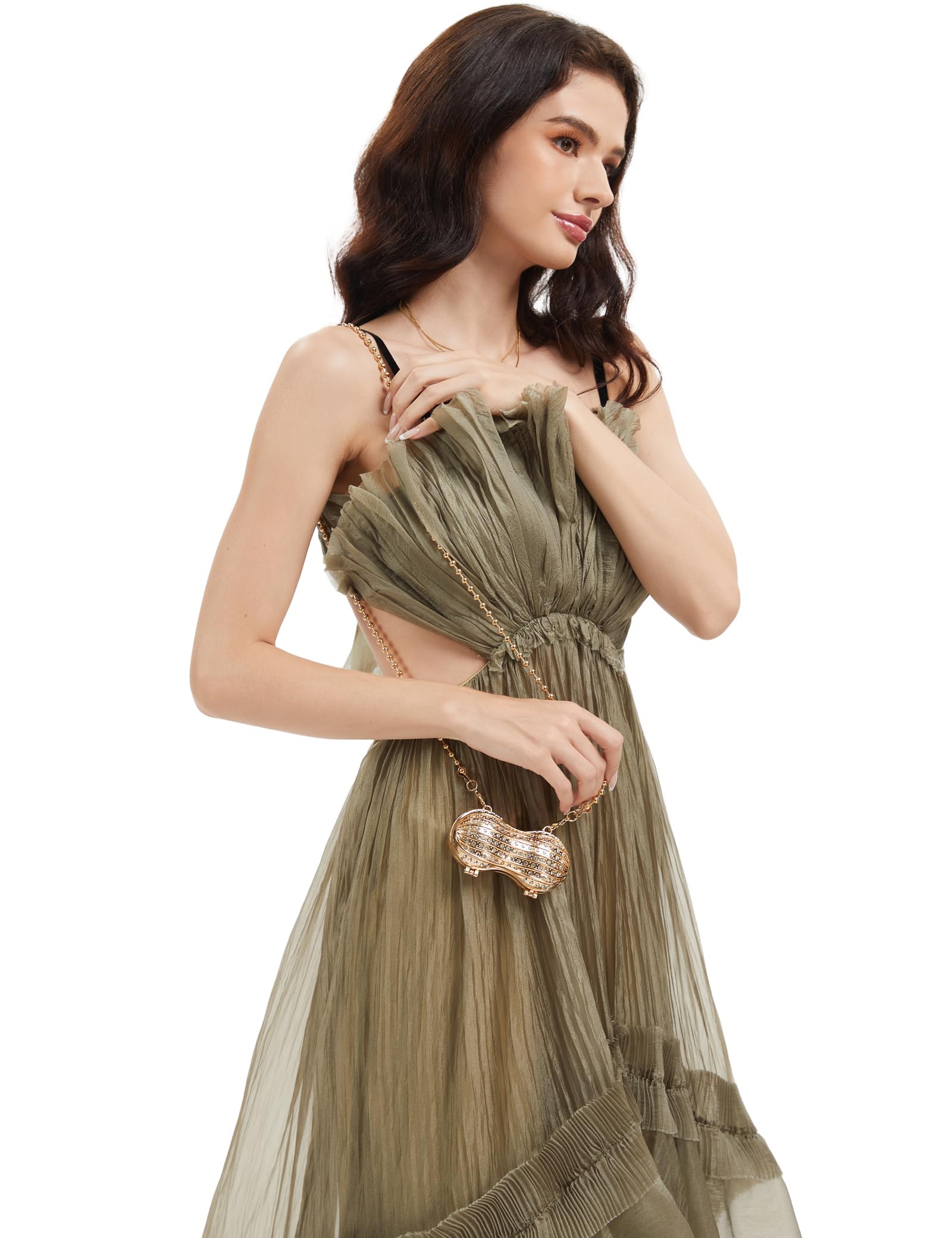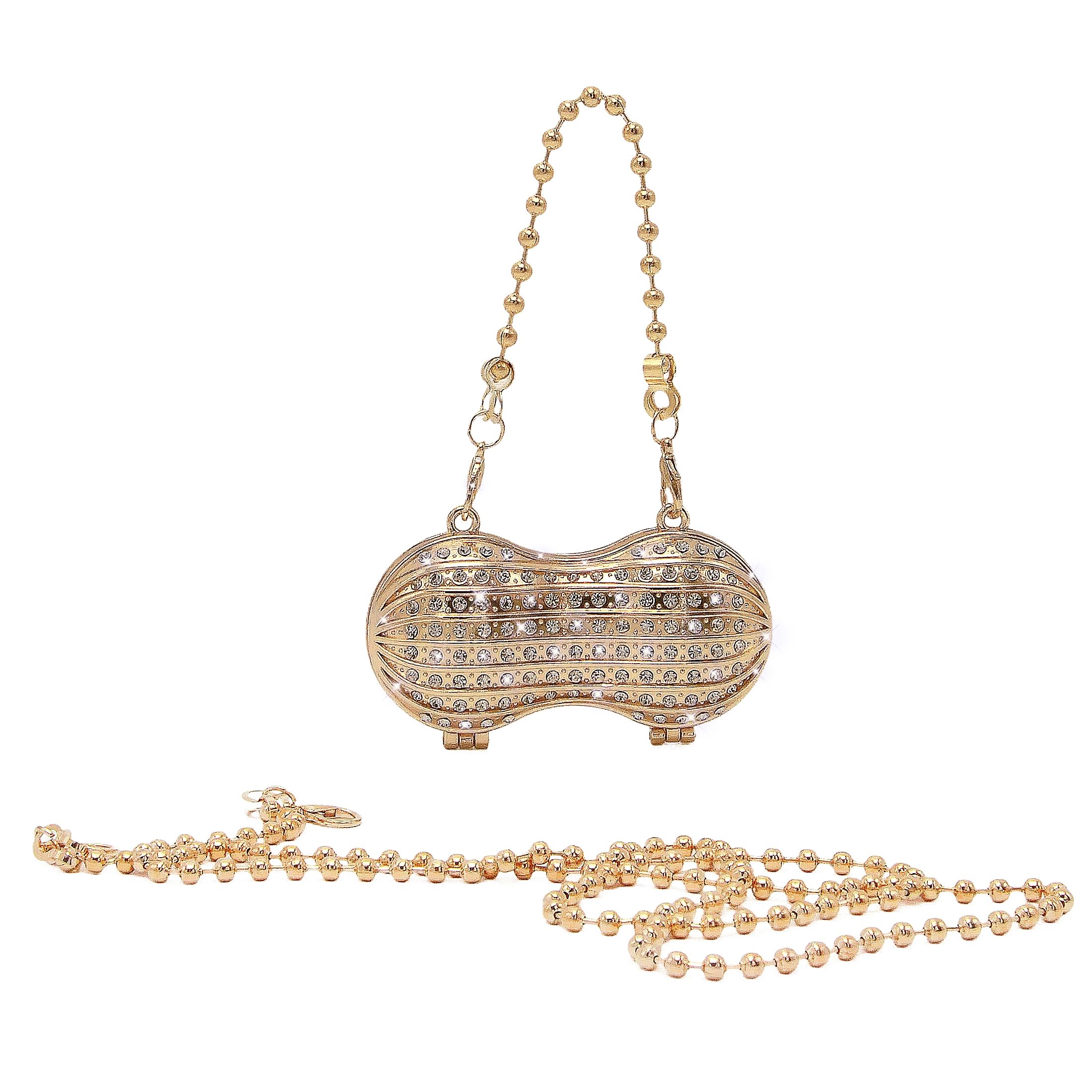 Add a playful touch of glamour to your look with this peanut-shaped mini clutch. Designed with a structured hard-case silhouette and all-over rhinestone sparkle, it shines like jewelry in the light. Comes with both a short and long chain, so you can style it as a handheld mini bag or wear it on the shoulder/crossbody for special nights out.