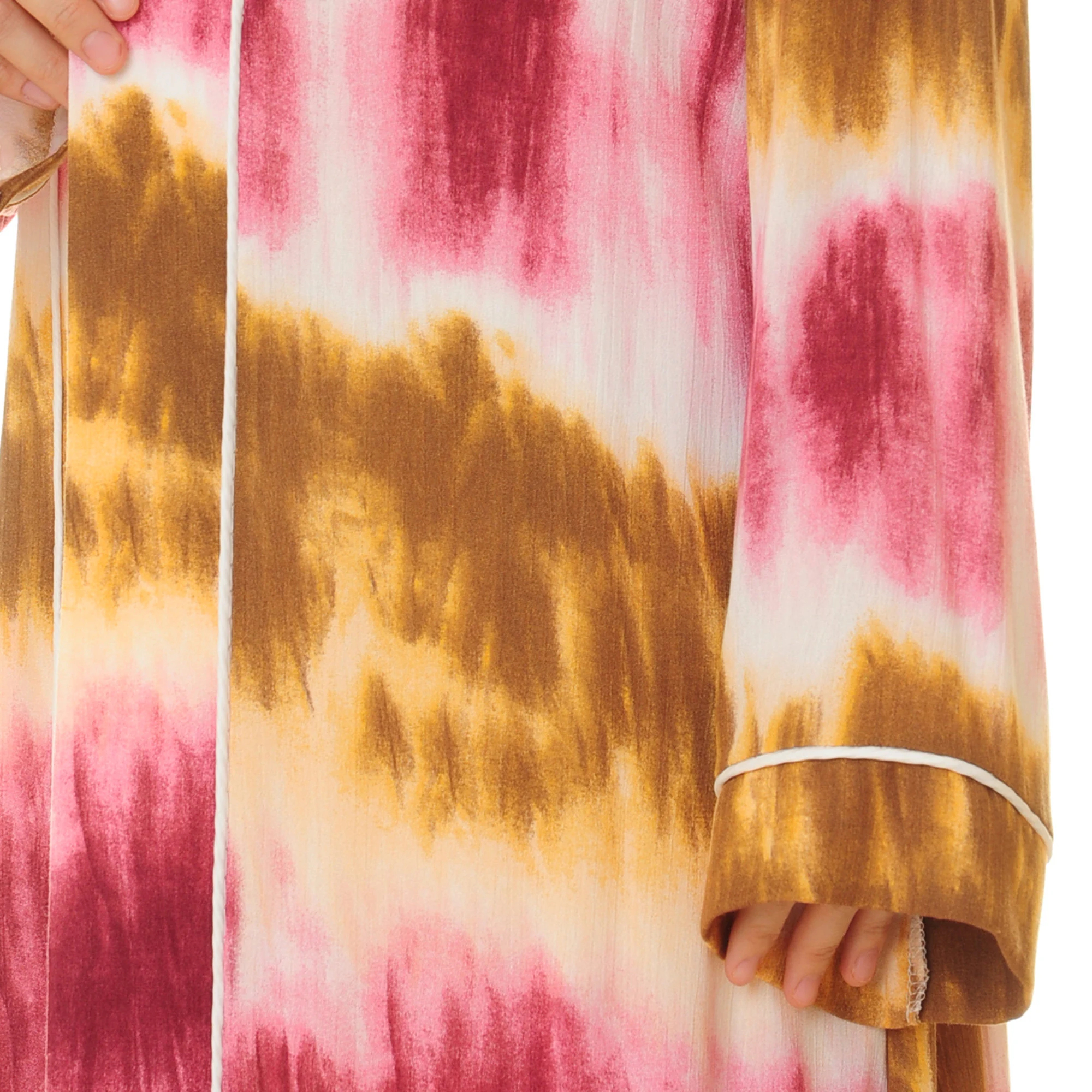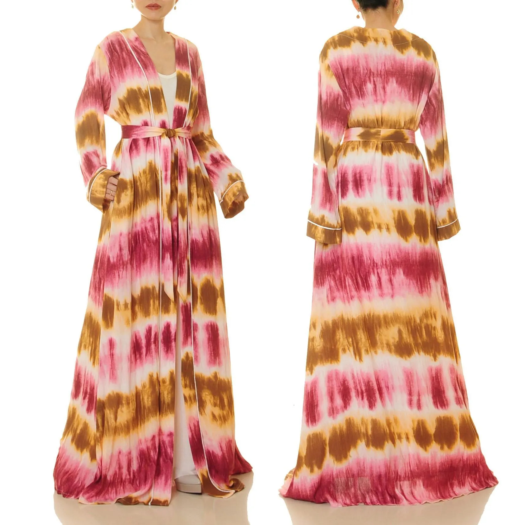 This robe, in a minimalist wrap silhouette, features vibrant tie-dye: rose pink and honey brown are applied in sections on a white background, creating a vibrant, flowing color with each step. The V-neckline flatters the neckline; the matching fabric belt buckles for added stability and an adjustable fit. The flowing, floor-length hem and smooth fabric create a slender silhouette. Throw it loose for a relaxed look, or cinch it with the belt for a refined look.