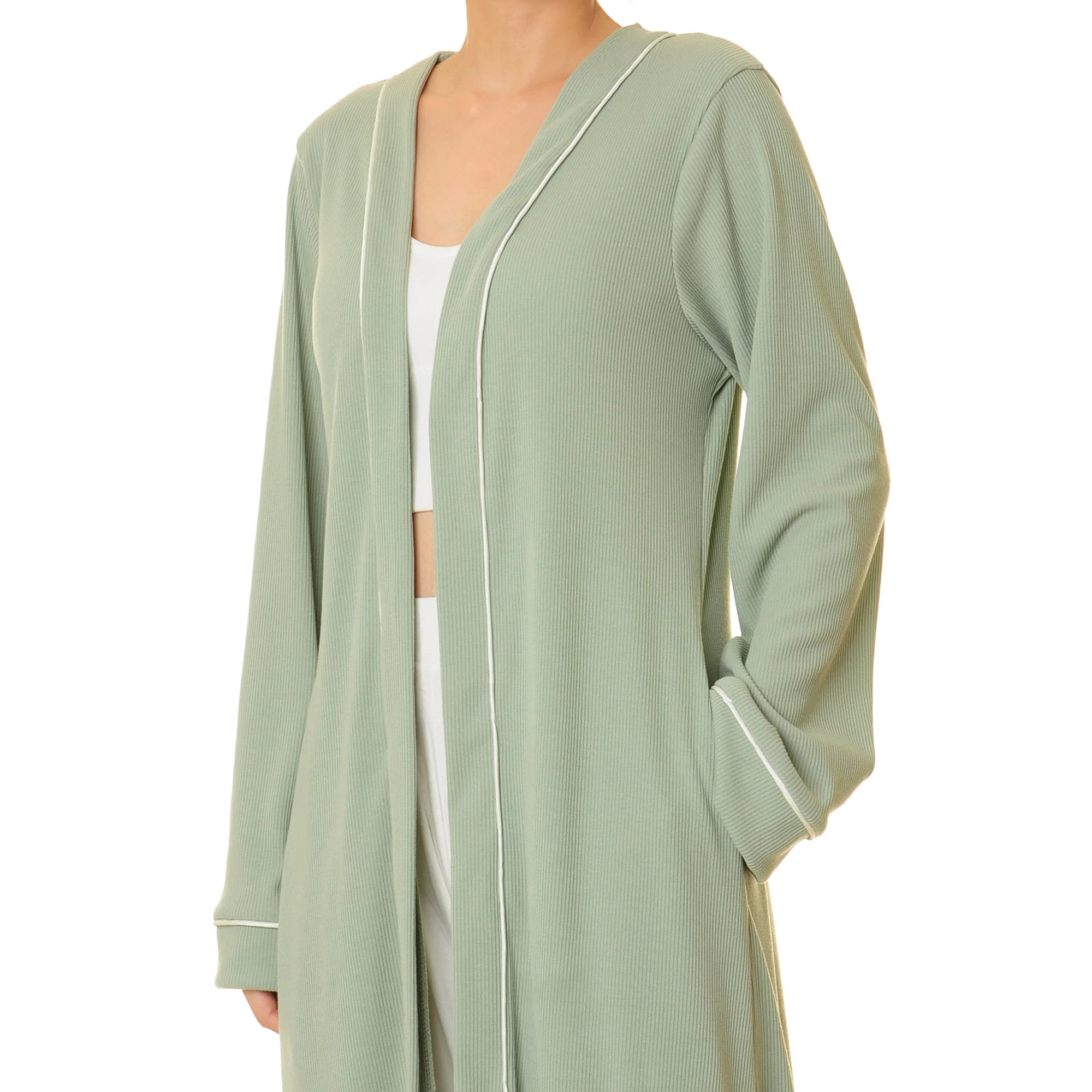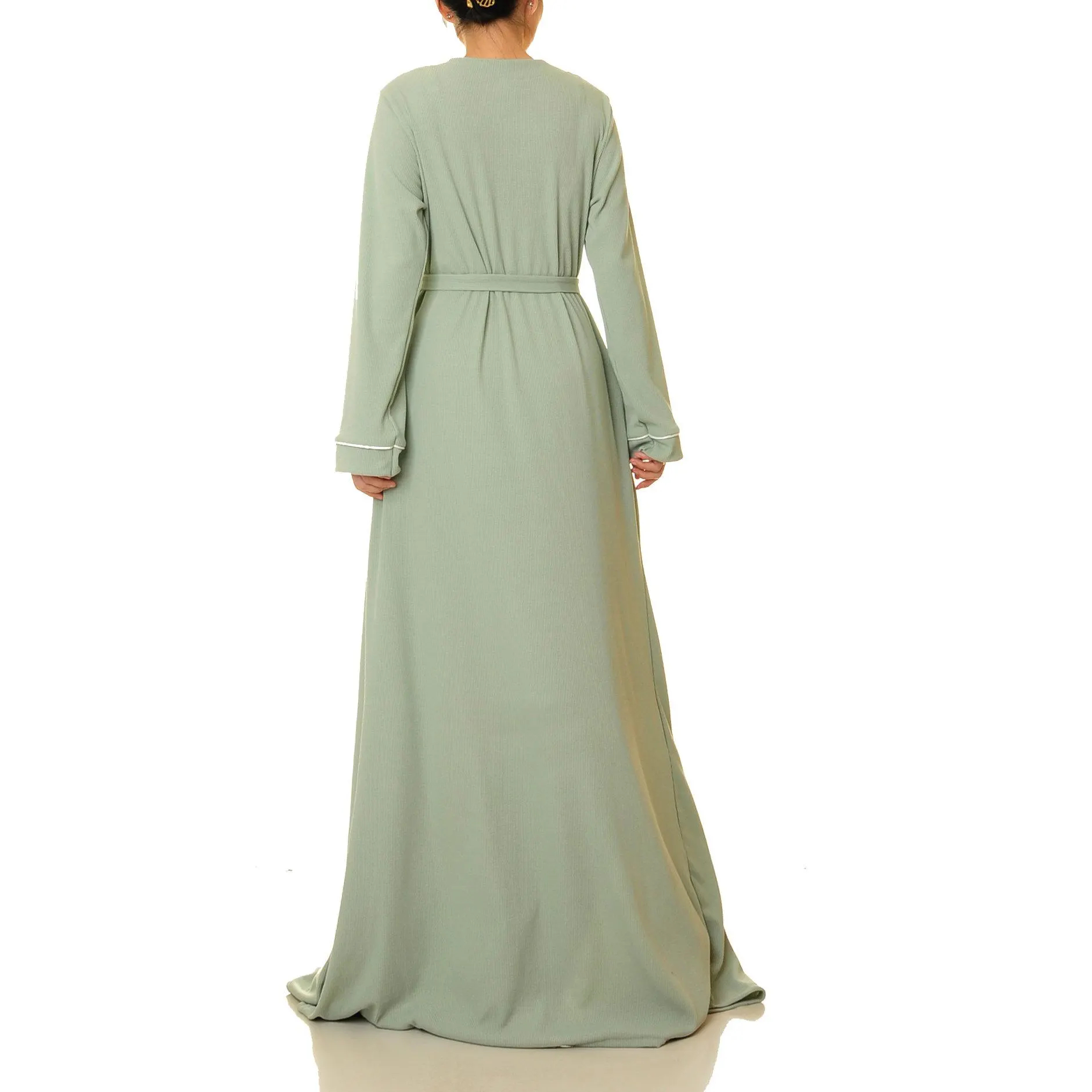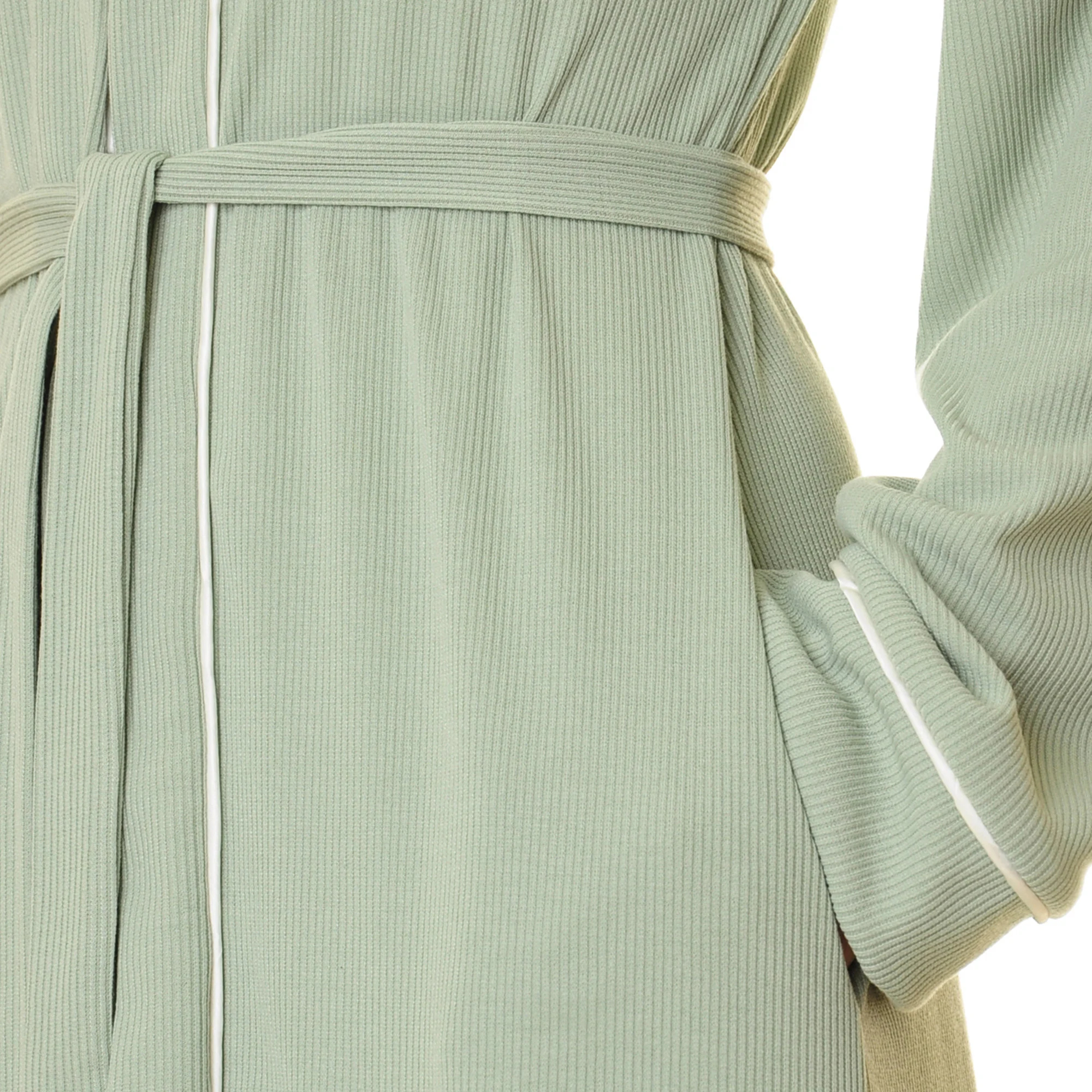 This soft sage wrap robe features clean white piping. Tie it once for a naturally fitted silhouette—long sleeves, a flowing hem, and pockets make it easy to go from home to the street.