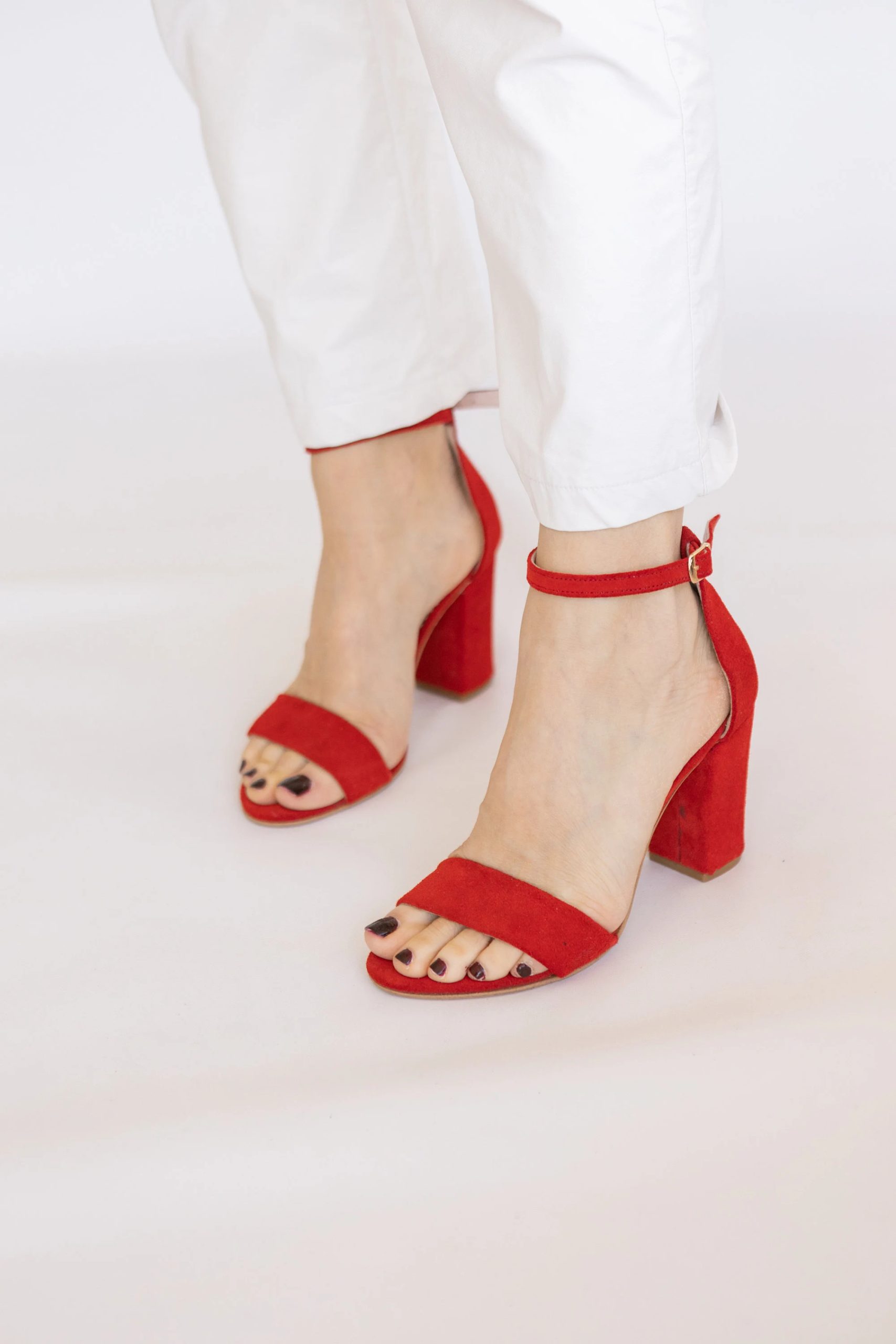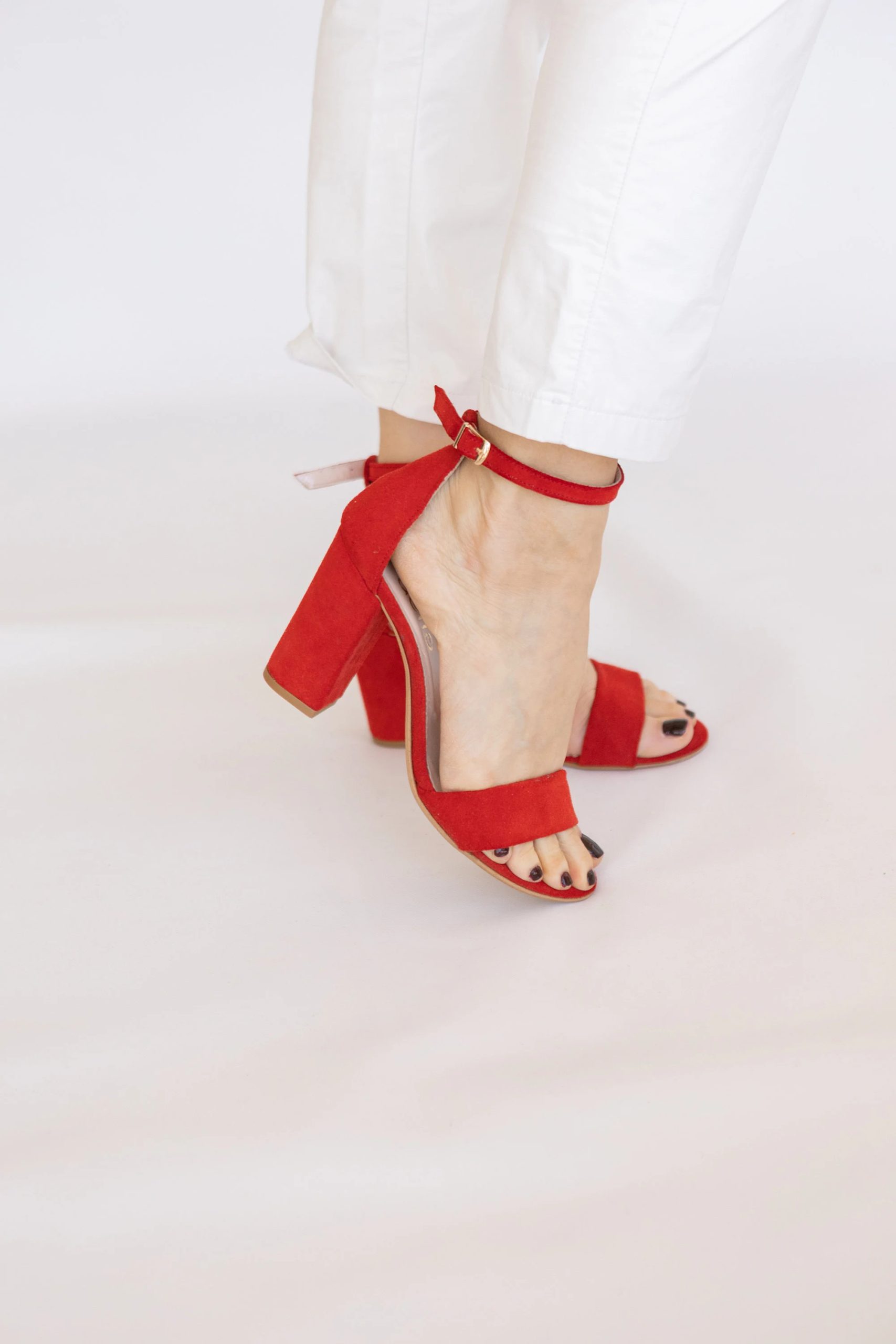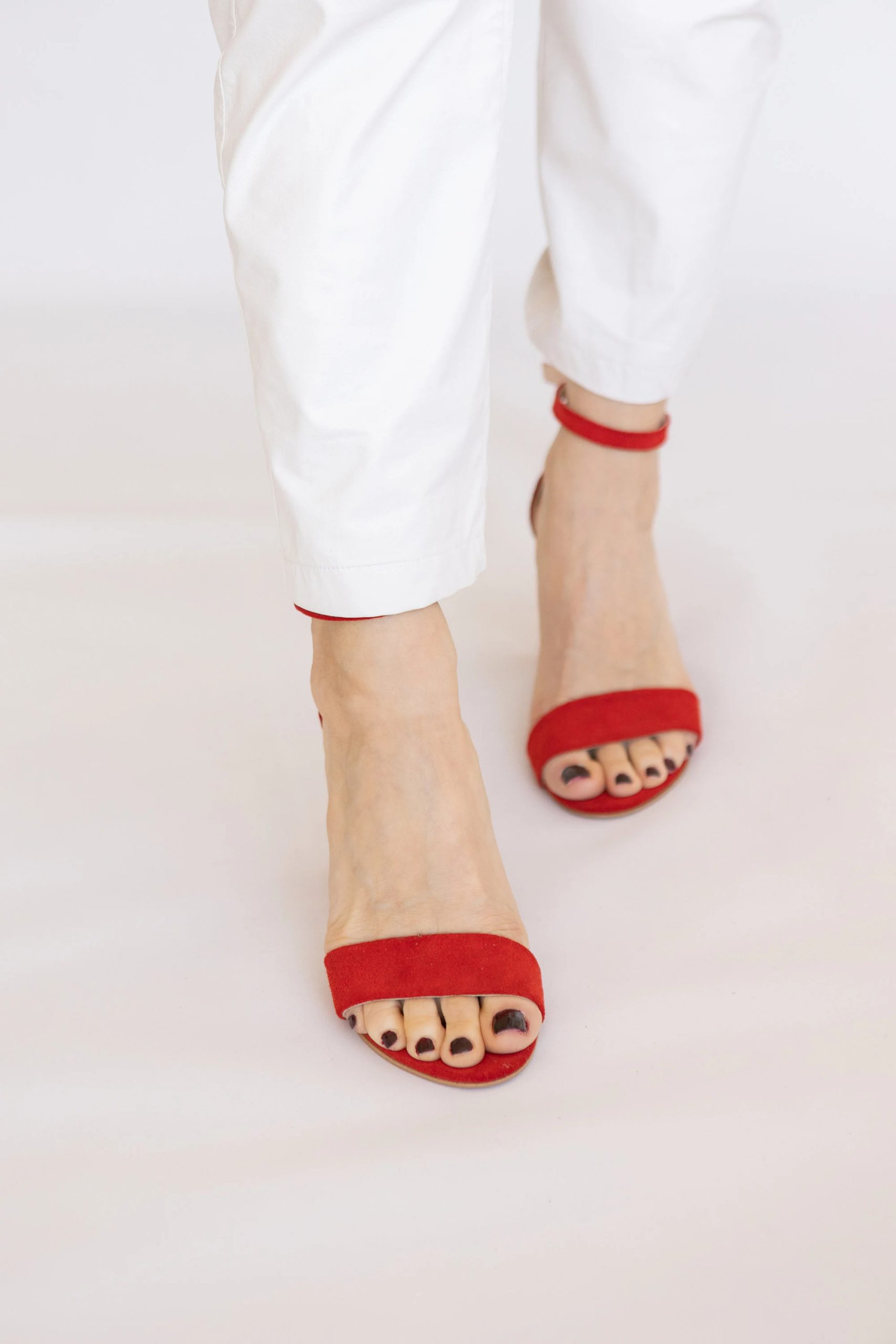 These minimalist chunky-heeled sandals feature a velvety scarlet suede finish for a soft and sophisticated look. A wide single-toe strap elongates the foot, while a thin, adjustable ankle strap ensures a comfortable, snug fit without bulk. The balanced chunky heel enhances the silhouette while ensuring stability with every step—perfect for weekdays, date nights, or any other occasion.