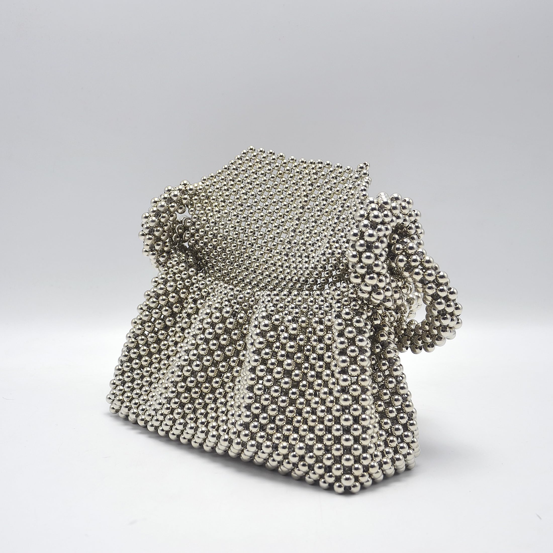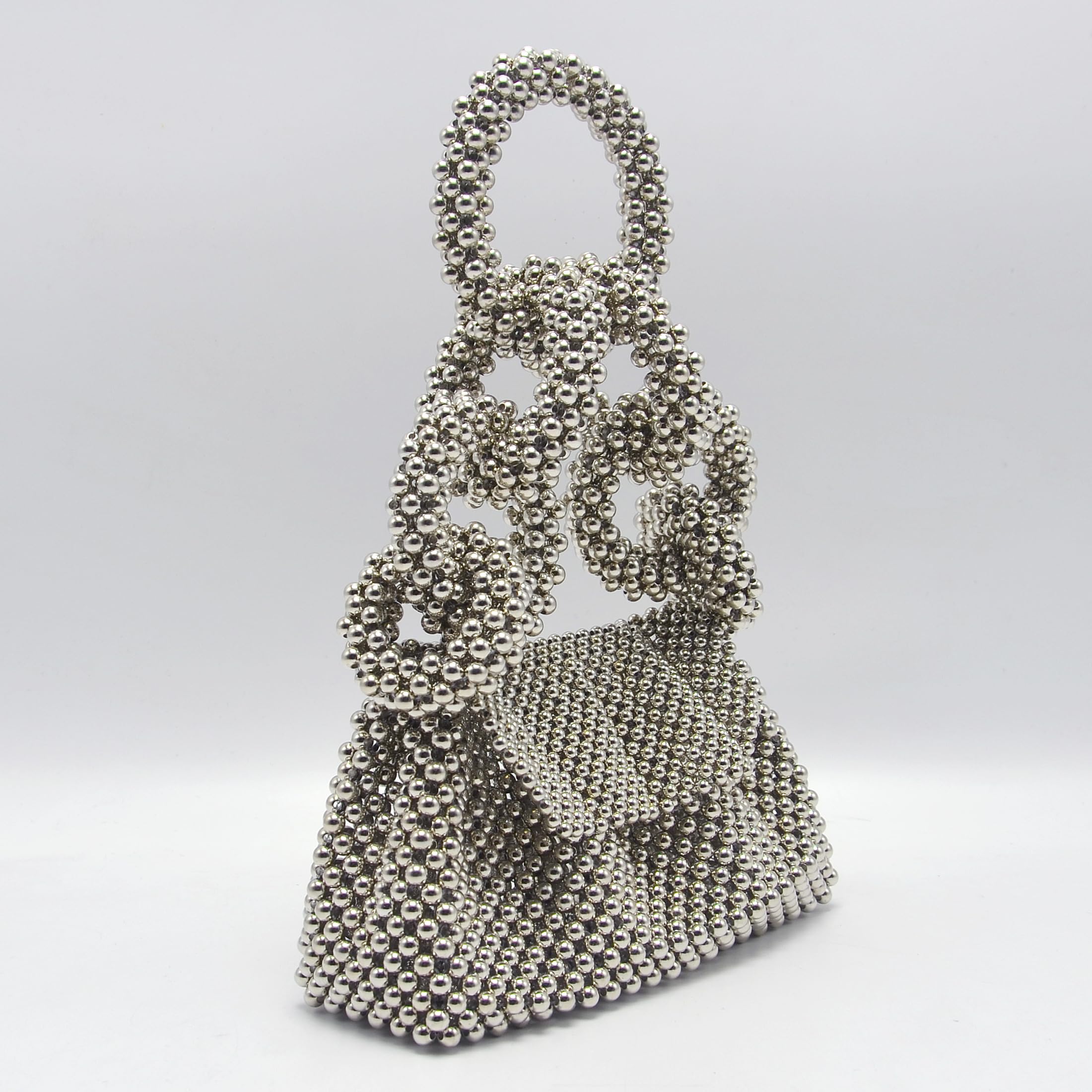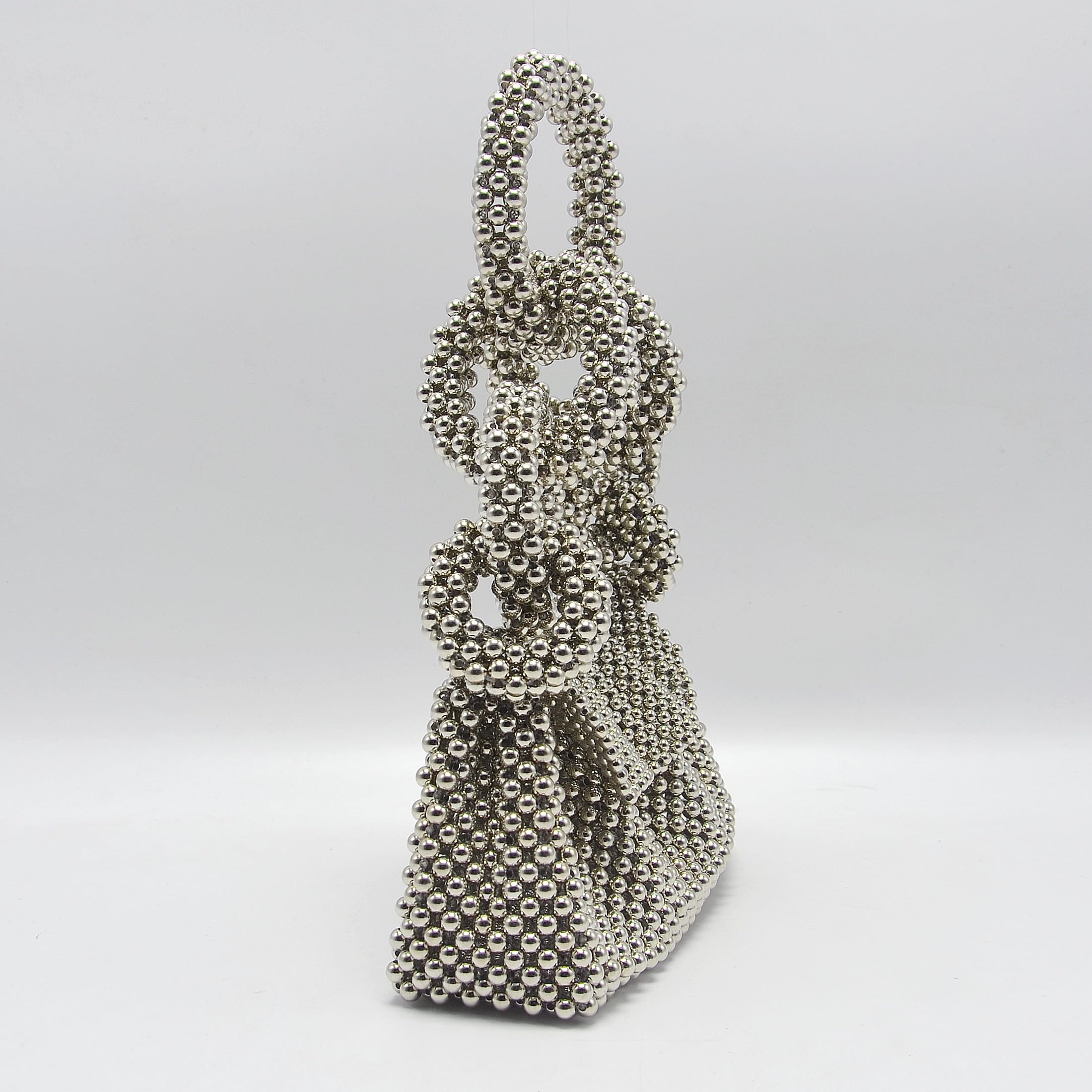 Striking and artistic, this statement handbag is crafted from glossy metallic beads in a sculptural knot design that looks like wearable jewelry. The structured beaded body holds its shape, while the dimensional bow-like details and beaded top handle create a high-fashion finish—perfect for parties, weddings, dinners, and photo-ready styling.