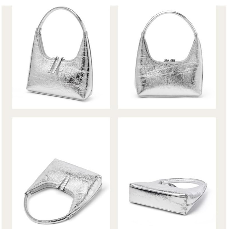 A uniquely styled mini shoulder bag with a dazzling, glossy metallic pleated finish.