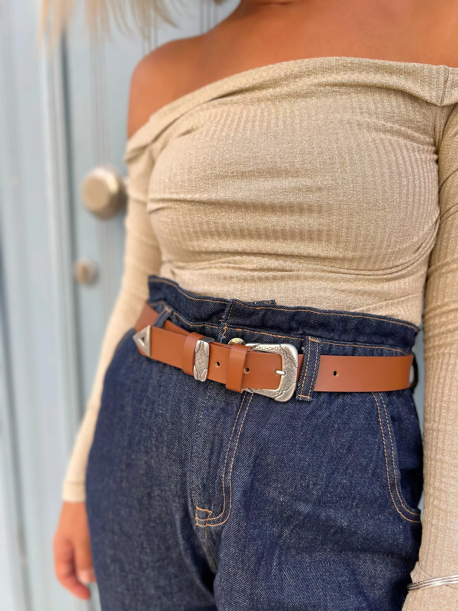The belt’s perfect width neatly cinches the waistline of high-waisted jeans (paired with dark blue denim, as shown, to achieve the perfect “narrow at the top, wide at the bottom” ratio) without appearing too wide or bulky. Brown is a versatile color that complements a variety of styles, from Western to retro and casual.