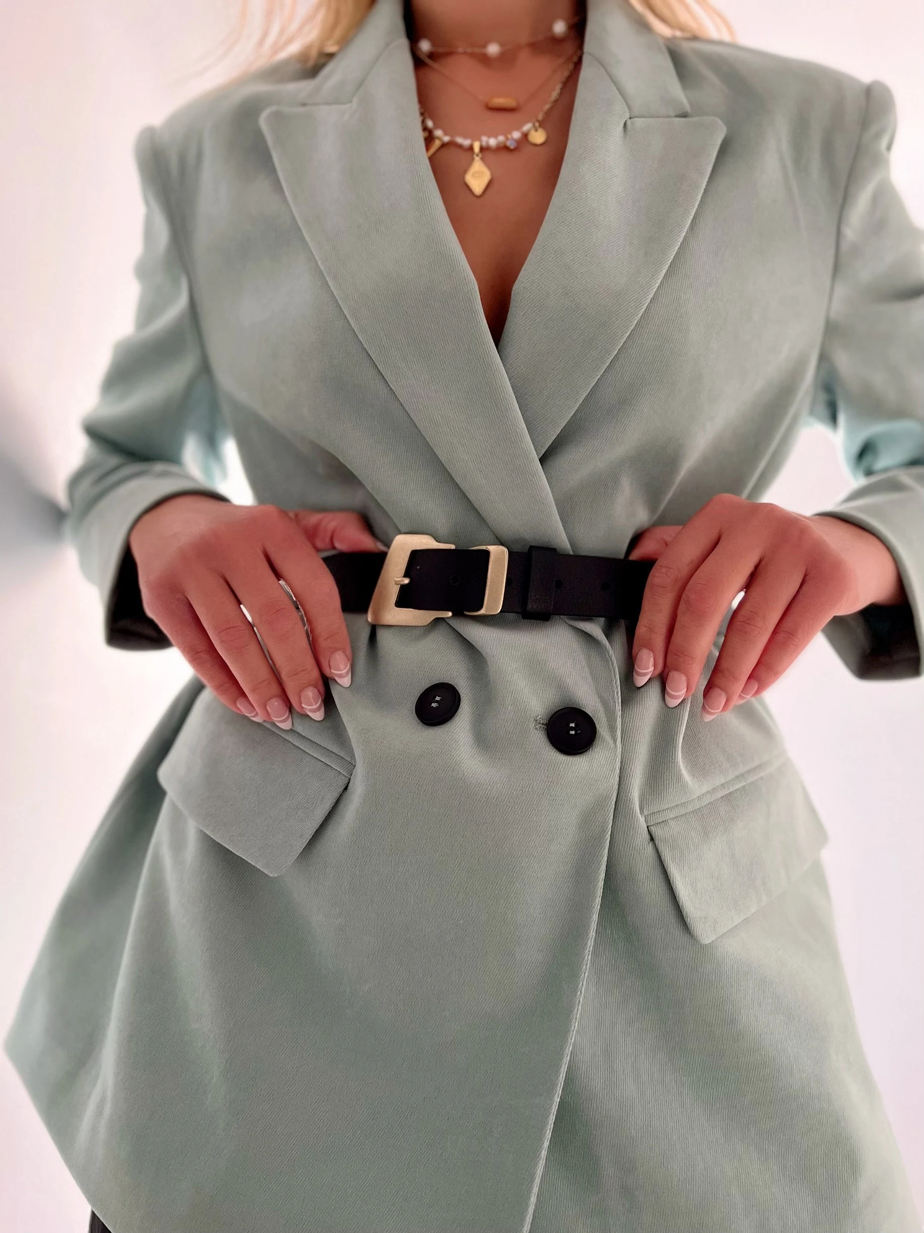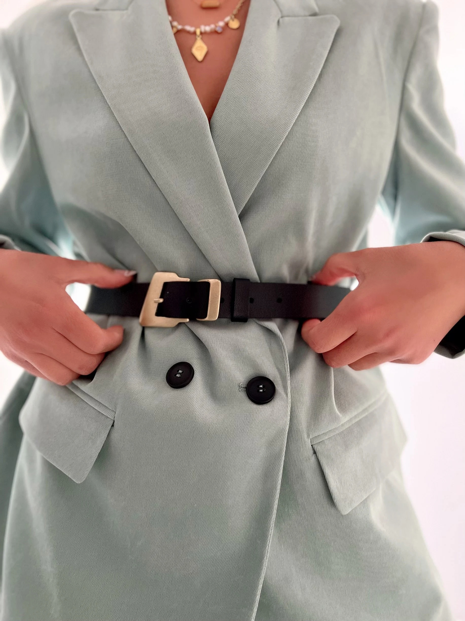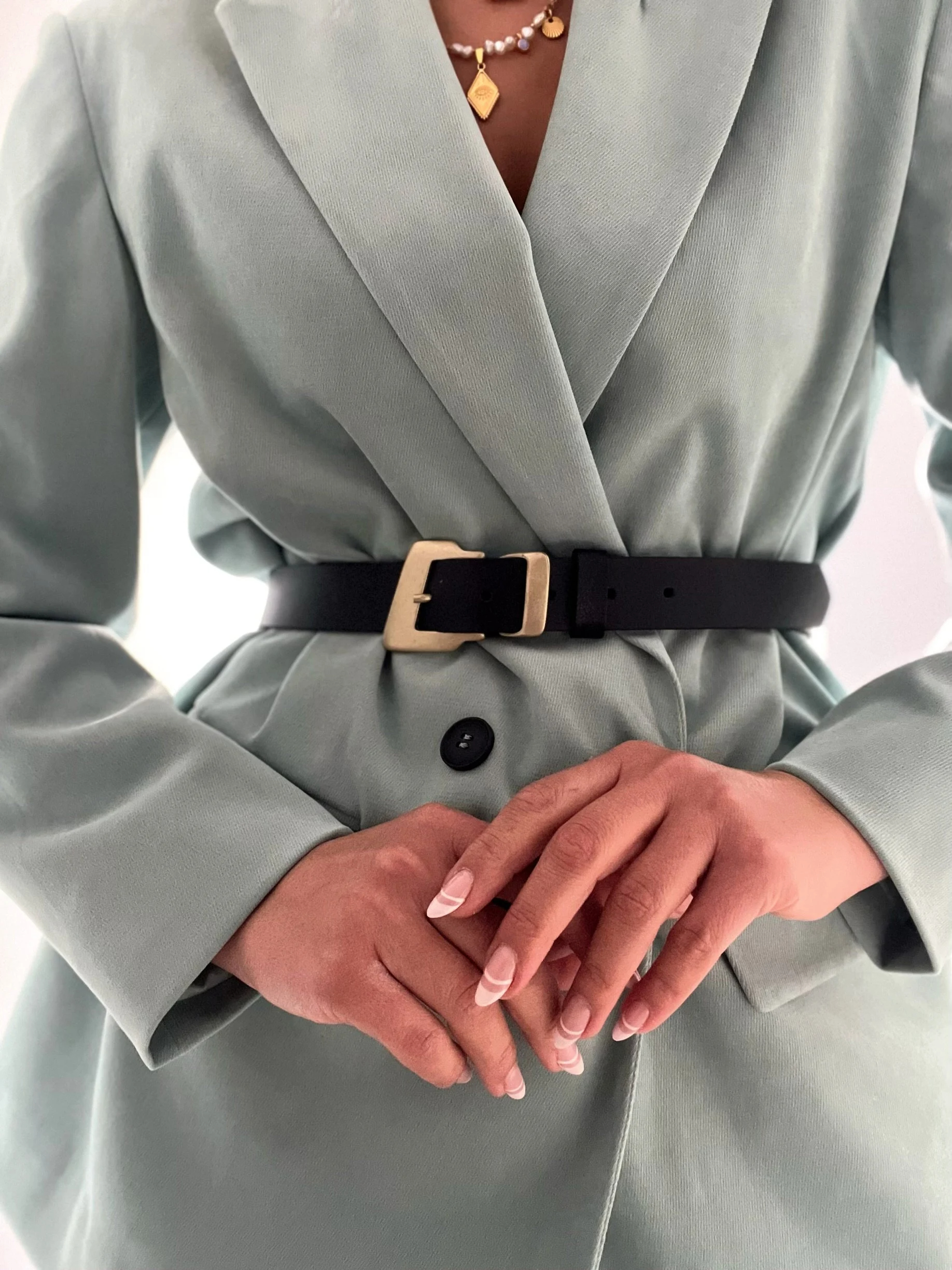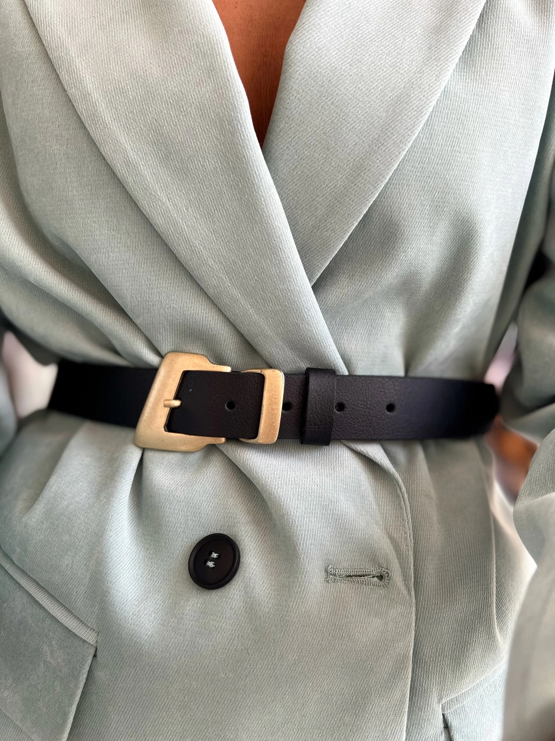 Everyday Relaxed Look: Paired with jeans and a basic T-shirt, the gold buckle adds a finishing touch to a casual look, instantly elevating the overall look. Whether you’re out and about or exploring a coffee shop, you’ll create an effortlessly sophisticated look, making any photo a stunning example of a stylish woman.