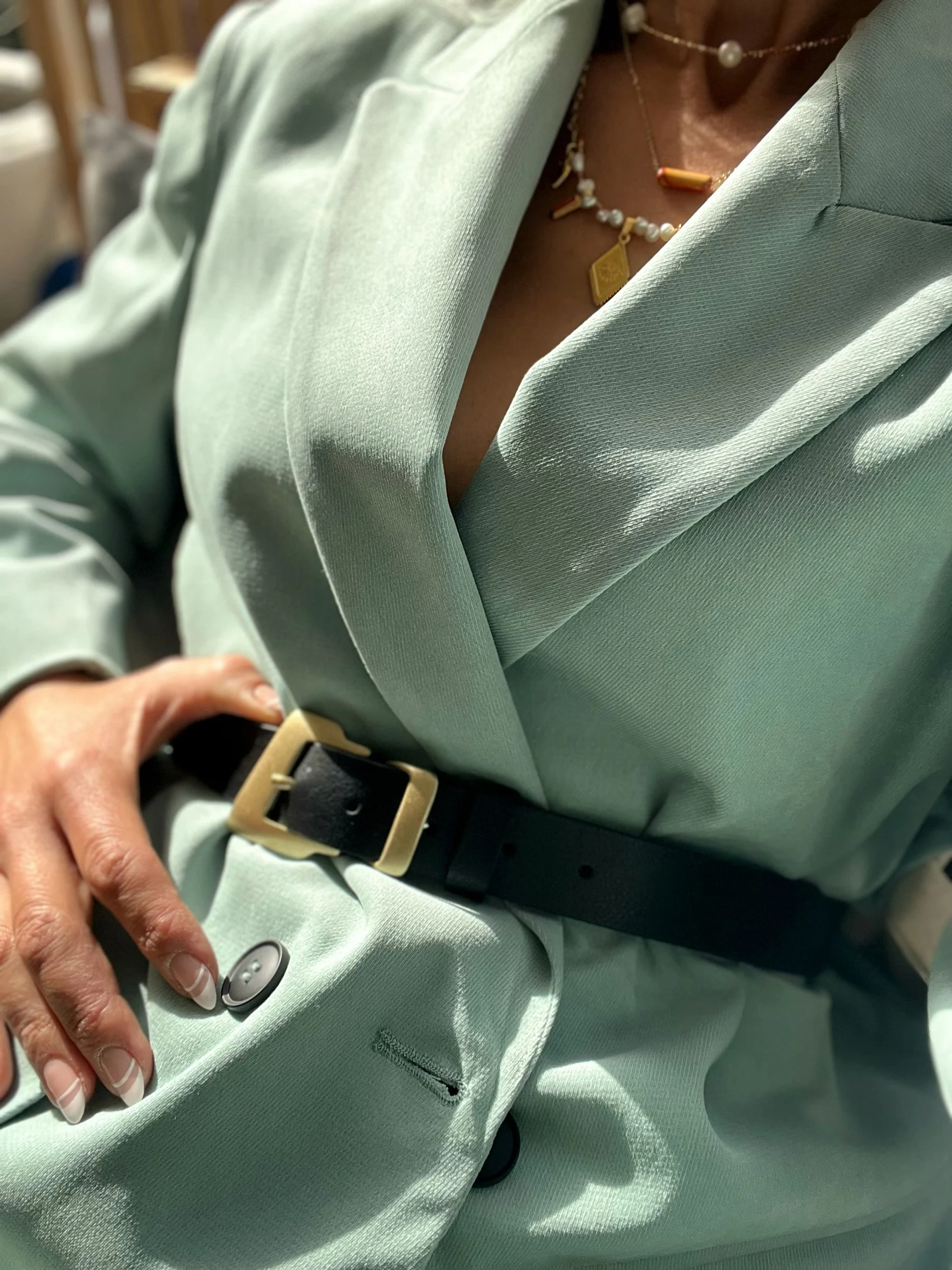Autumn/Winter Layering: Paired with a long coat or woolen jacket, a belt is a great layering tool. It not only defines your figure (addressing the “overcoat” issue), but also breaks up the monotony of a dark coat with the bright gold buckle, adding a touch of flair to a heavier outfit.