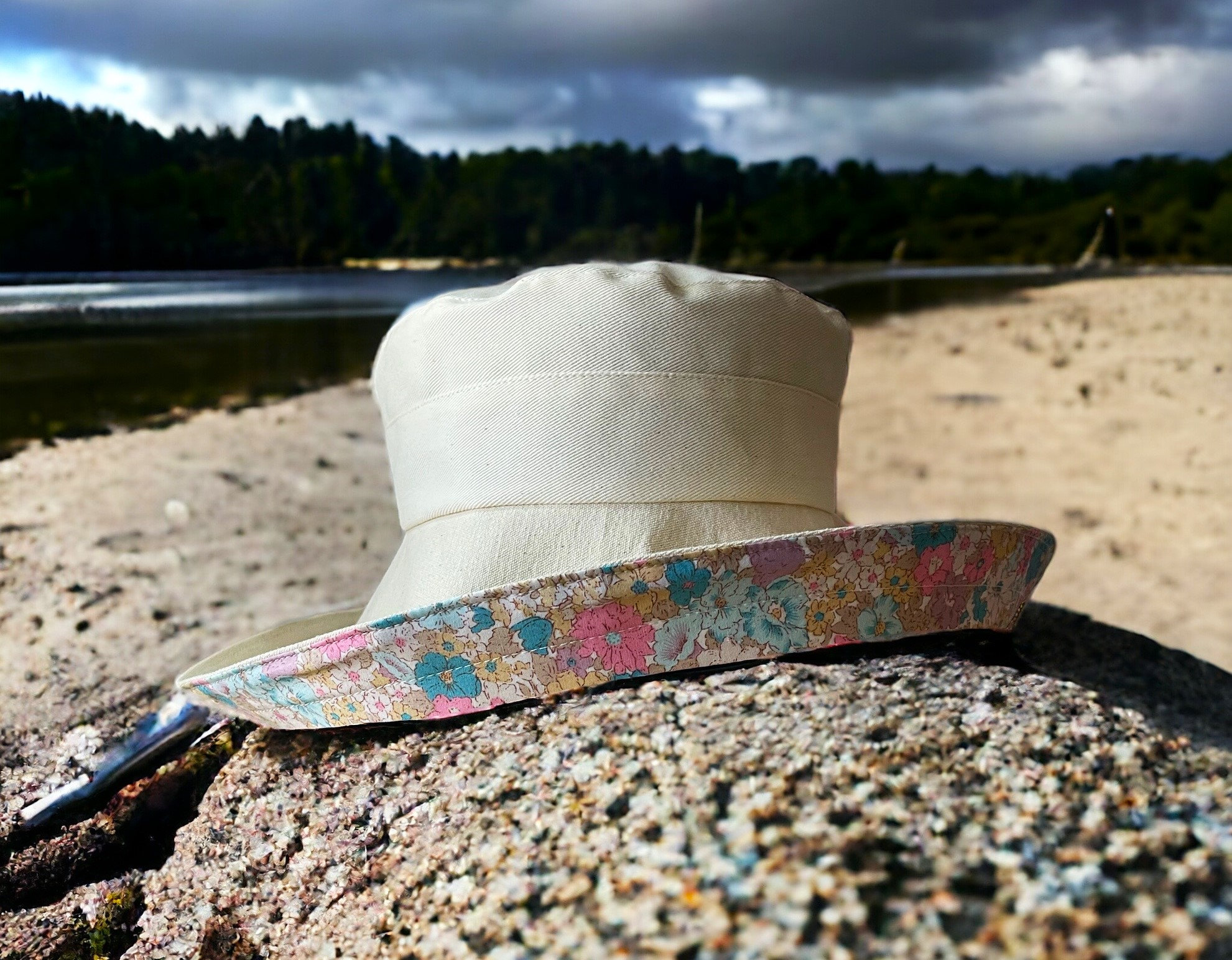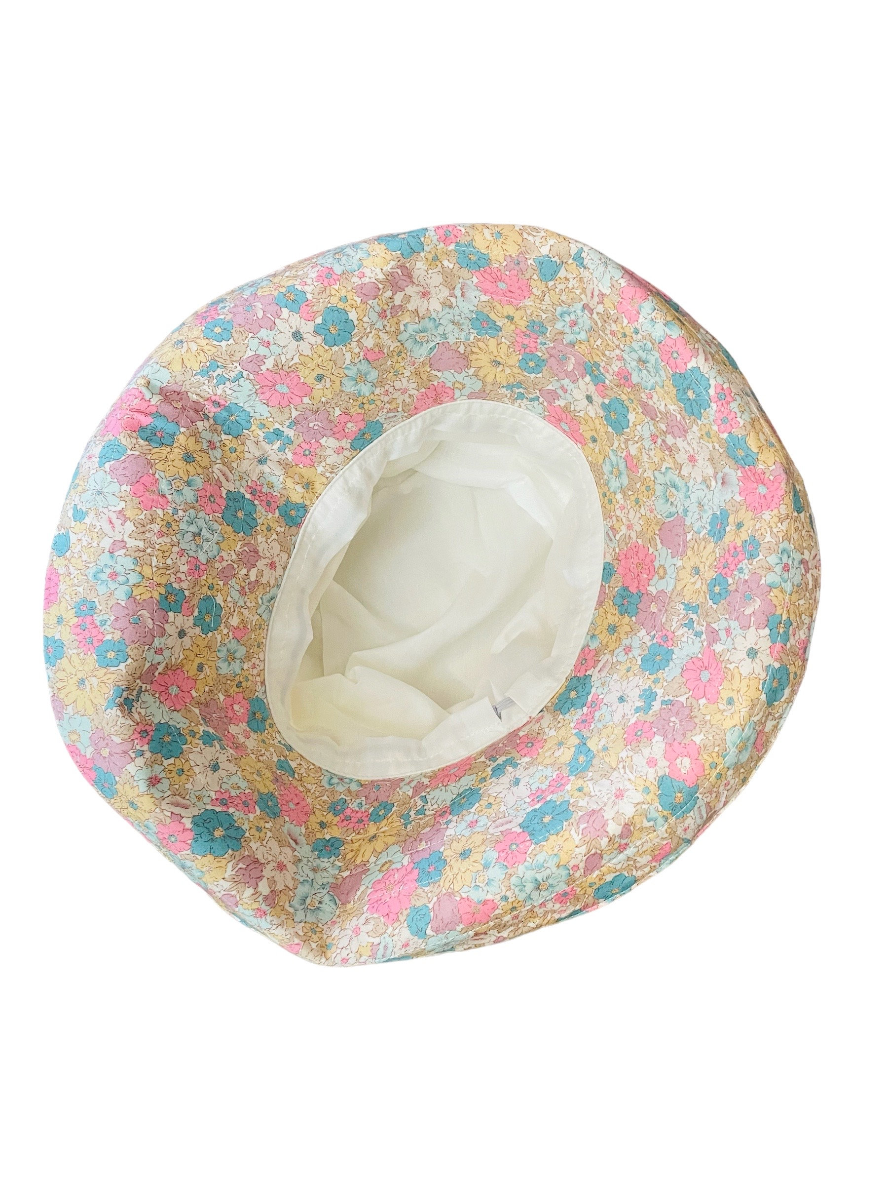 The brim is adorned with a delicate pastel floral print: soft pinks, sky blues, cream yellows, and pale greens intertwine to create a vibrant meadow of flowers. The print is light and romantic, like a watercolor garden at sunrise. The wide, slightly flared brim provides easy sun protection while adding a touch of sweet femininity to your summer look.