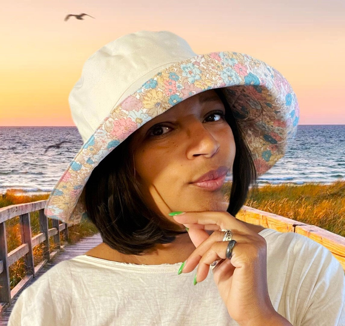 Lightweight and comfortable, this hat is easy to pair with dresses, linen tops, beachwear, and casual outfits, making it ideal for vacations, beach walks, weekend outings, picnics, afternoons in the garden, and everyday summer wear. The combination of soft neutral tones and pastel floral patterns makes this hat both charming and versatile.