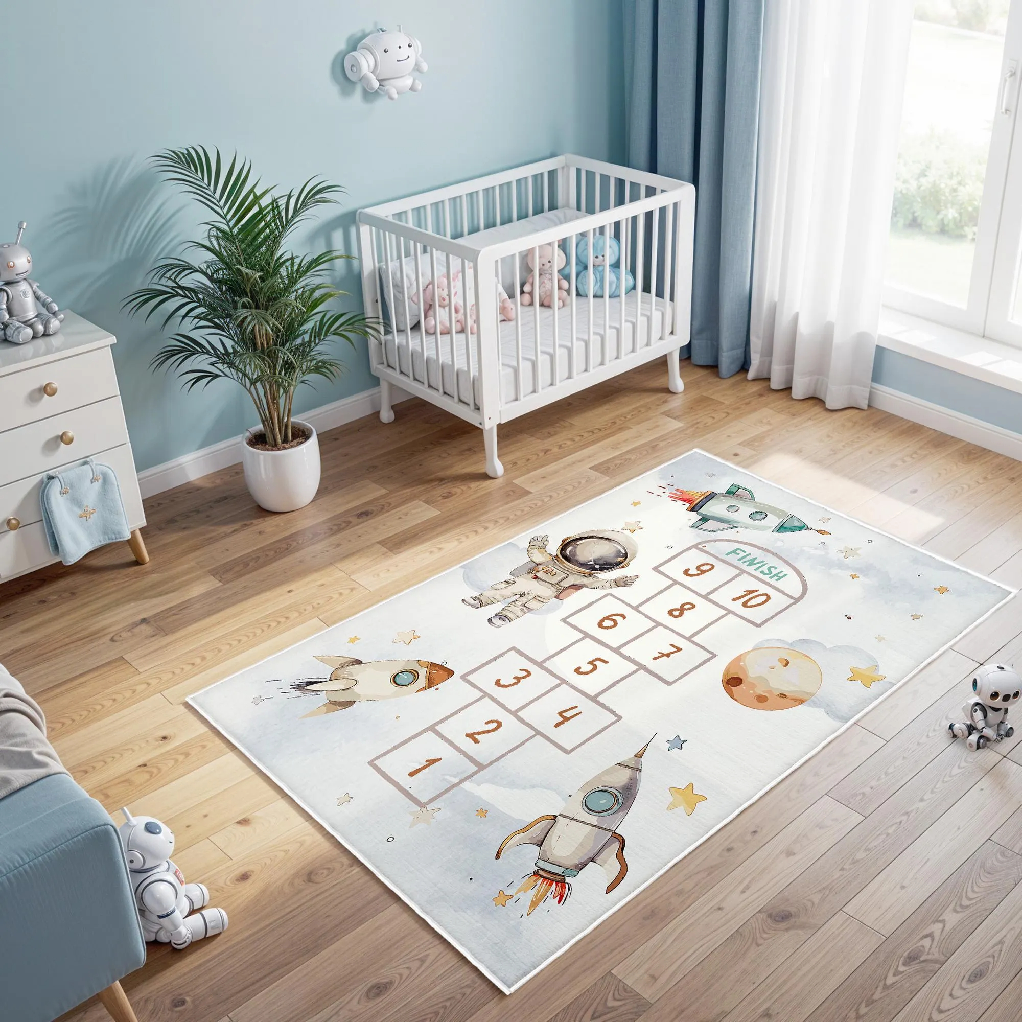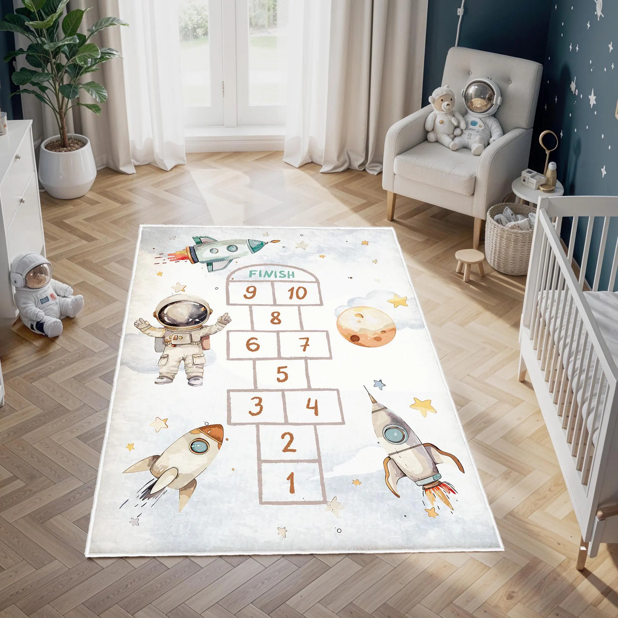 Focusing on “space adventure-style growth,” this rug deeply integrates digital cognition, physical movement, and cosmic fantasy. While playing hopscotch, children develop balance and numerical logic while weaving space dreams amidst scenes of rockets and planets. This enriches early childhood education with a sense of science fiction and creativity, instilling a love of space exploration from a young age.