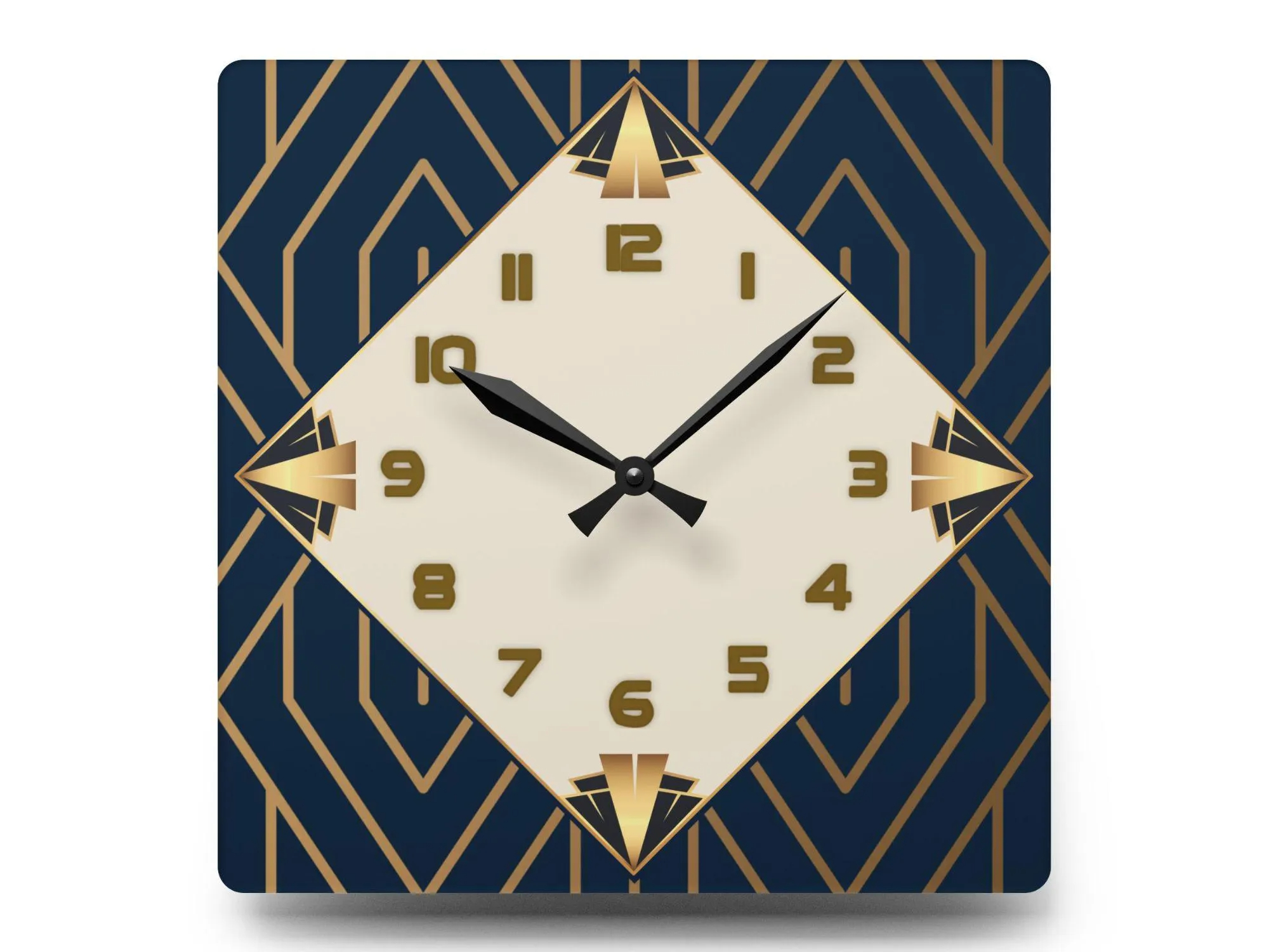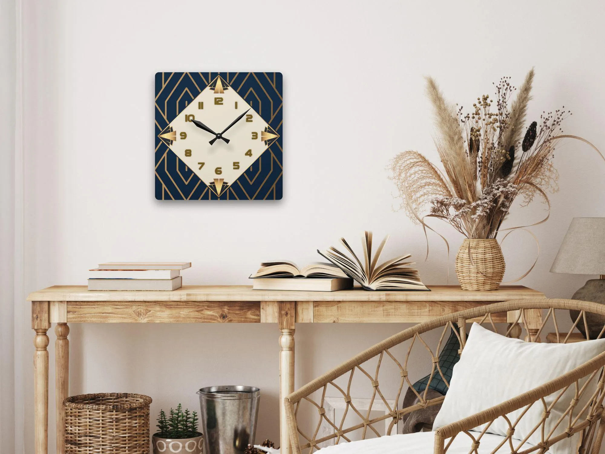 This clock, with its Art Deco style at its core, blends a navy blue base with gold geometric fan-shaped patterns. It serves not only as a precise timekeeping tool but also as a luxurious vintage-inspired decorative piece.