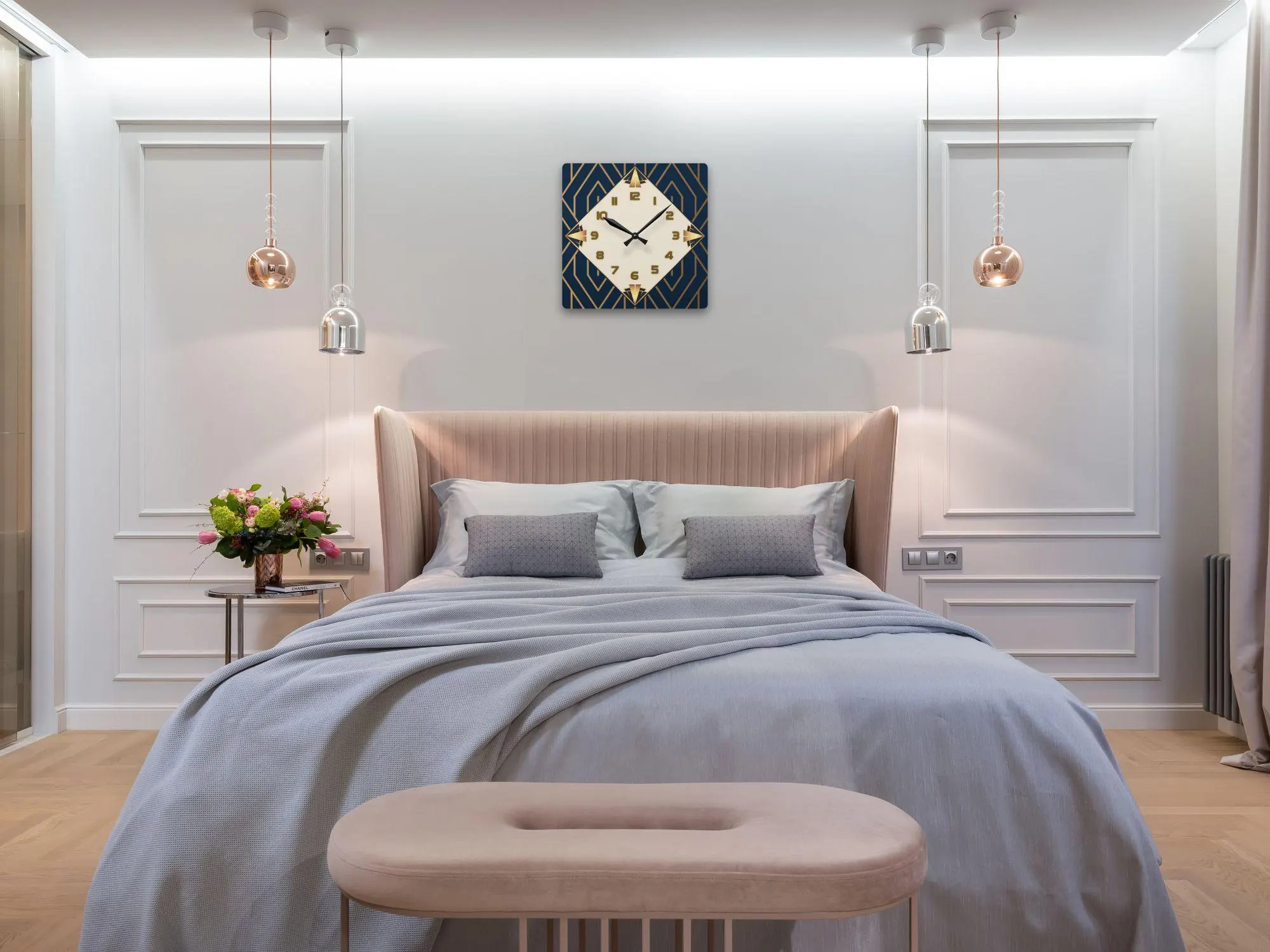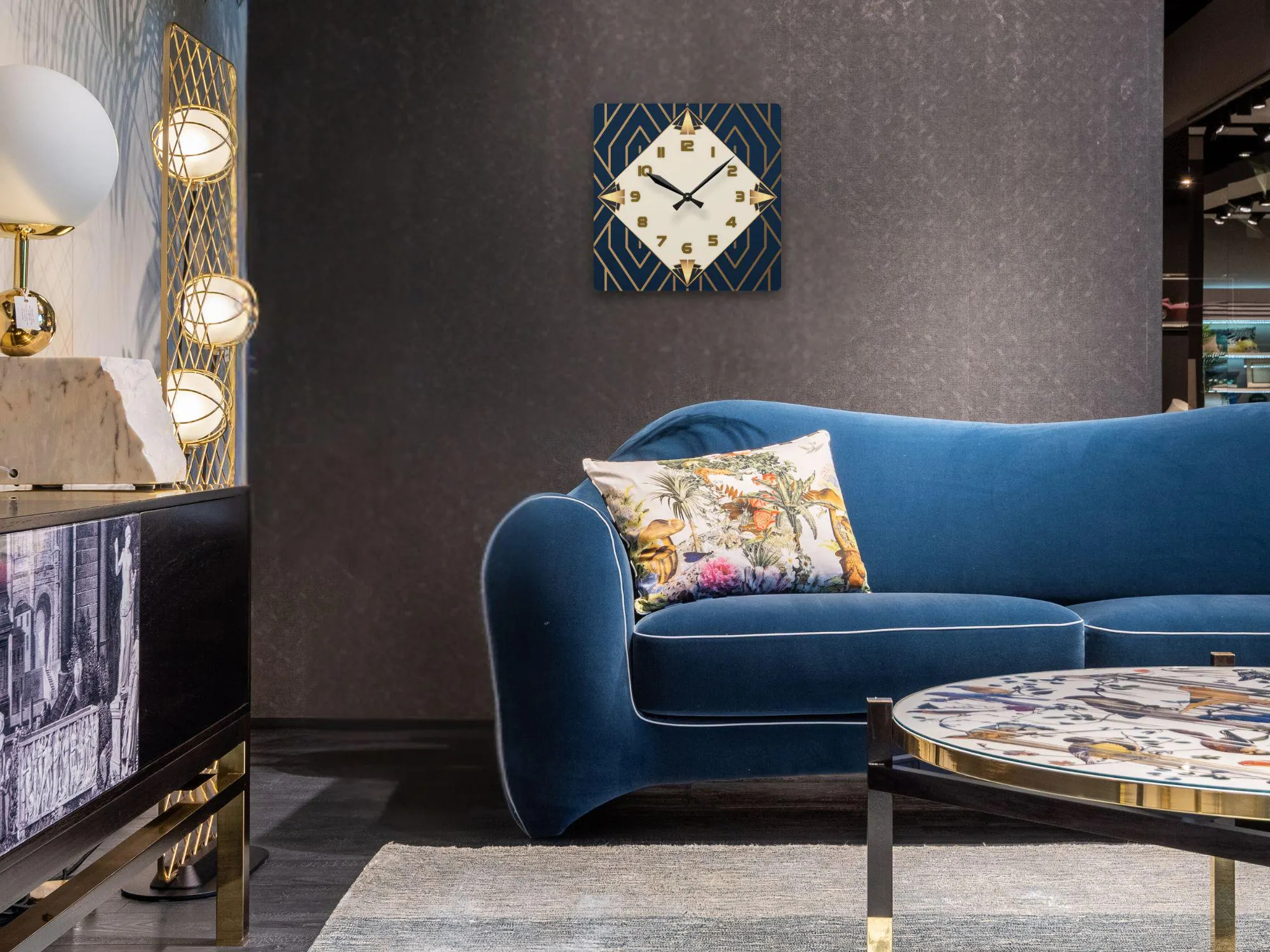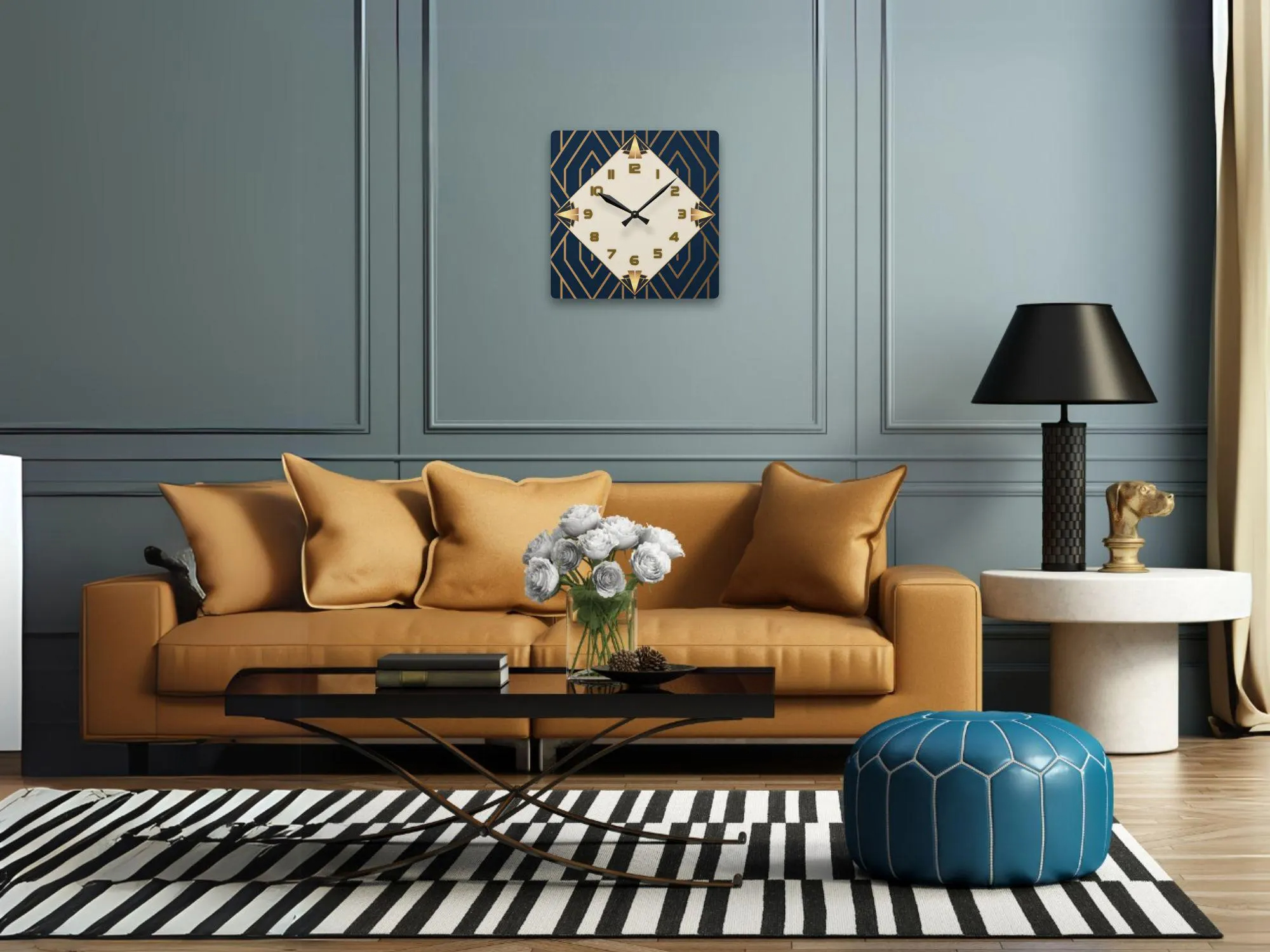 The color scheme follows a luxurious vintage theme: a deep navy blue as the main frame color, paired with striking gold for geometric fan-shaped patterns and numeral decorations, creating a layered “navy blue-gold-beige” combination with the light beige dial. The richness of the navy blue accentuates the opulence of the gold, while the light beige adds a refreshing touch to the dial, retaining the luxurious character of Art Deco while aligning with contemporary vintage-inspired home aesthetics.