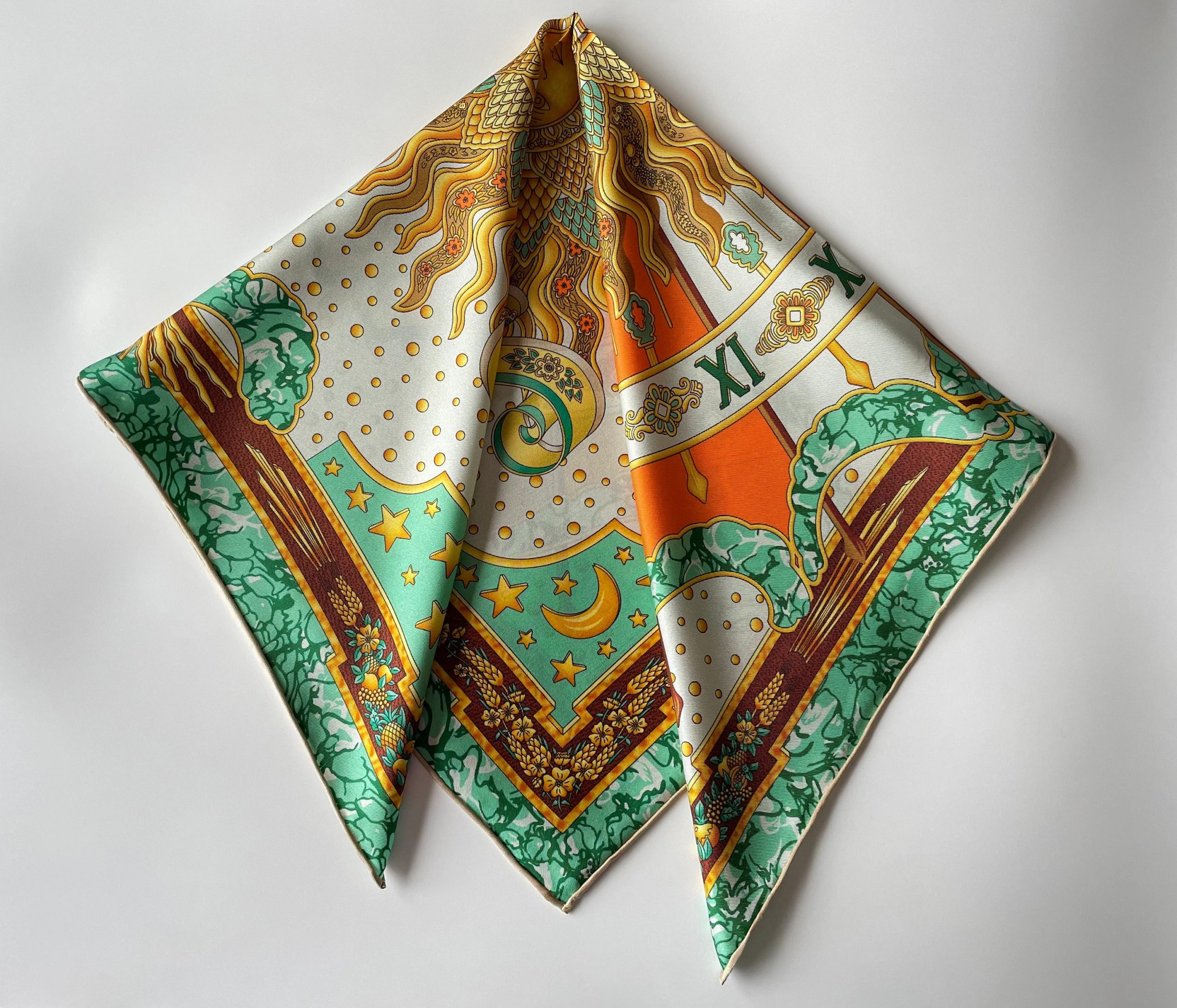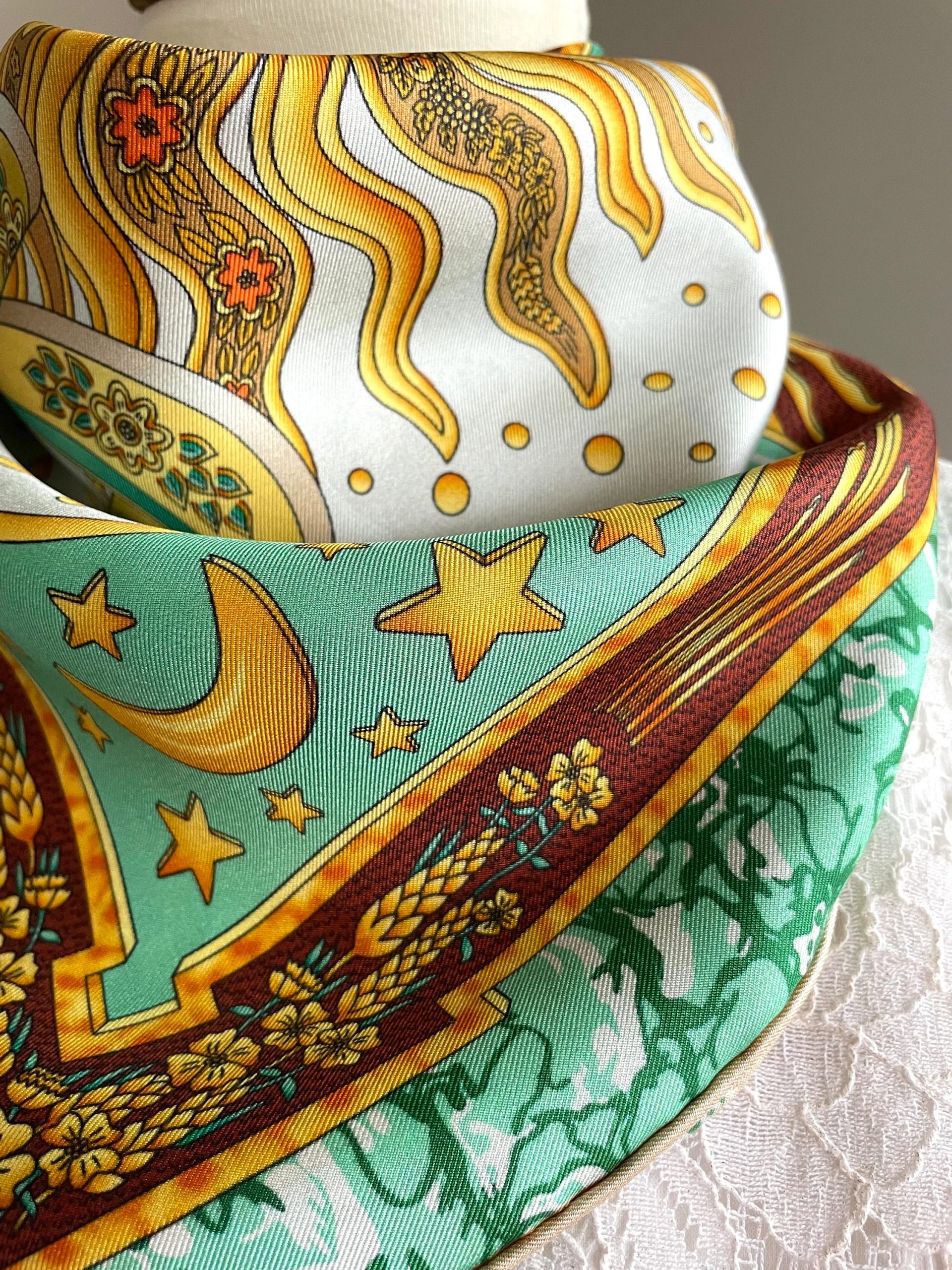 Crafted from premium 6A grade mulberry silk satin fabric, this scarf boasts a soft, dreamy pearlescent sheen—perfect for a starry night theme. It clearly showcases the delicate details of the starry moon and starry sky patterns, capturing their fantastical color gradations without overpowering the romantic essence of the design. The fabric is cool and smooth against the skin, breathable and comfortable for summer wear, and its drape allows the starry moon and starry sky patterns to flow naturally, creating a romantic yet uncluttered visual effect with the green-brown base and fantastical elements.