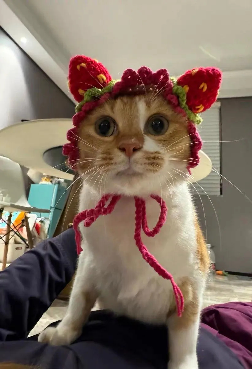 A fusion of cat ears and strawberries: The hat itself features the outline of a cat’s upright ears, adorned with three-dimensional red strawberries and green stems. From the front, it resembles a cat “wearing fresh strawberry ears,” while from the side, it presents a round and adorable hat shape, perfectly matching a cat’s soft and cute nature;