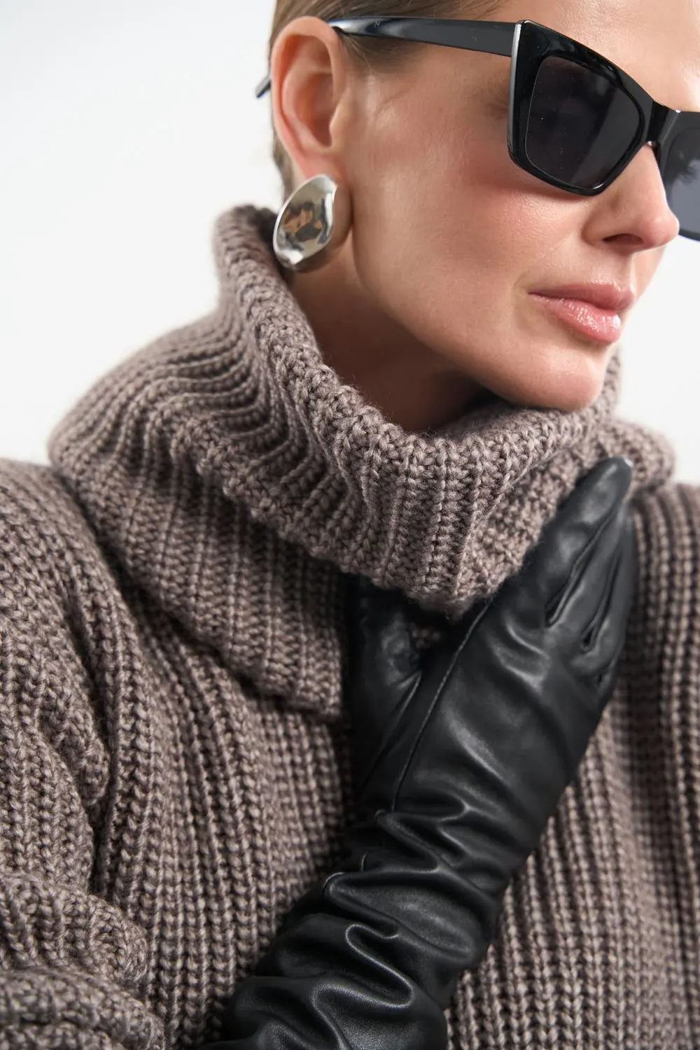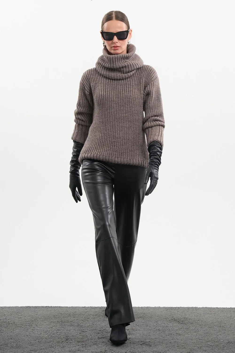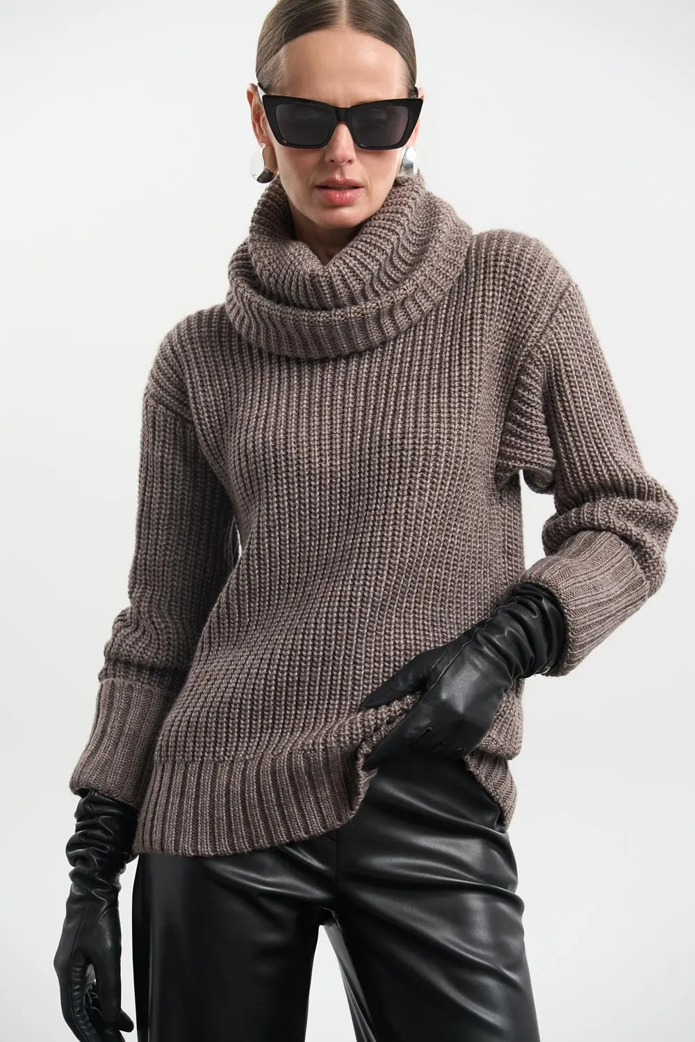 This taupe chunky knit sweater features a cozy oversized turtleneck and a richly textured ribbed construction for a warm, modern look. The soft taupe tone adds a refined neutral touch, making it easy to style with both casual and elevated outfits. Its relaxed silhouette gives the sweater an effortless feel while maintaining a polished appearance.
