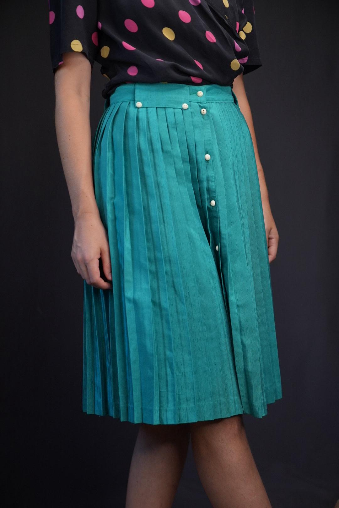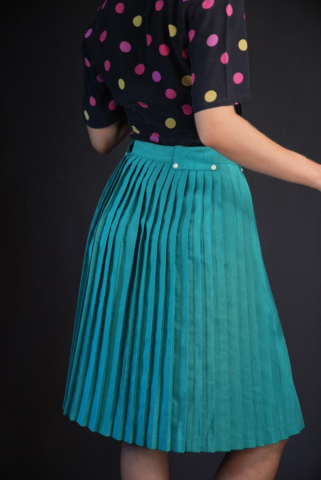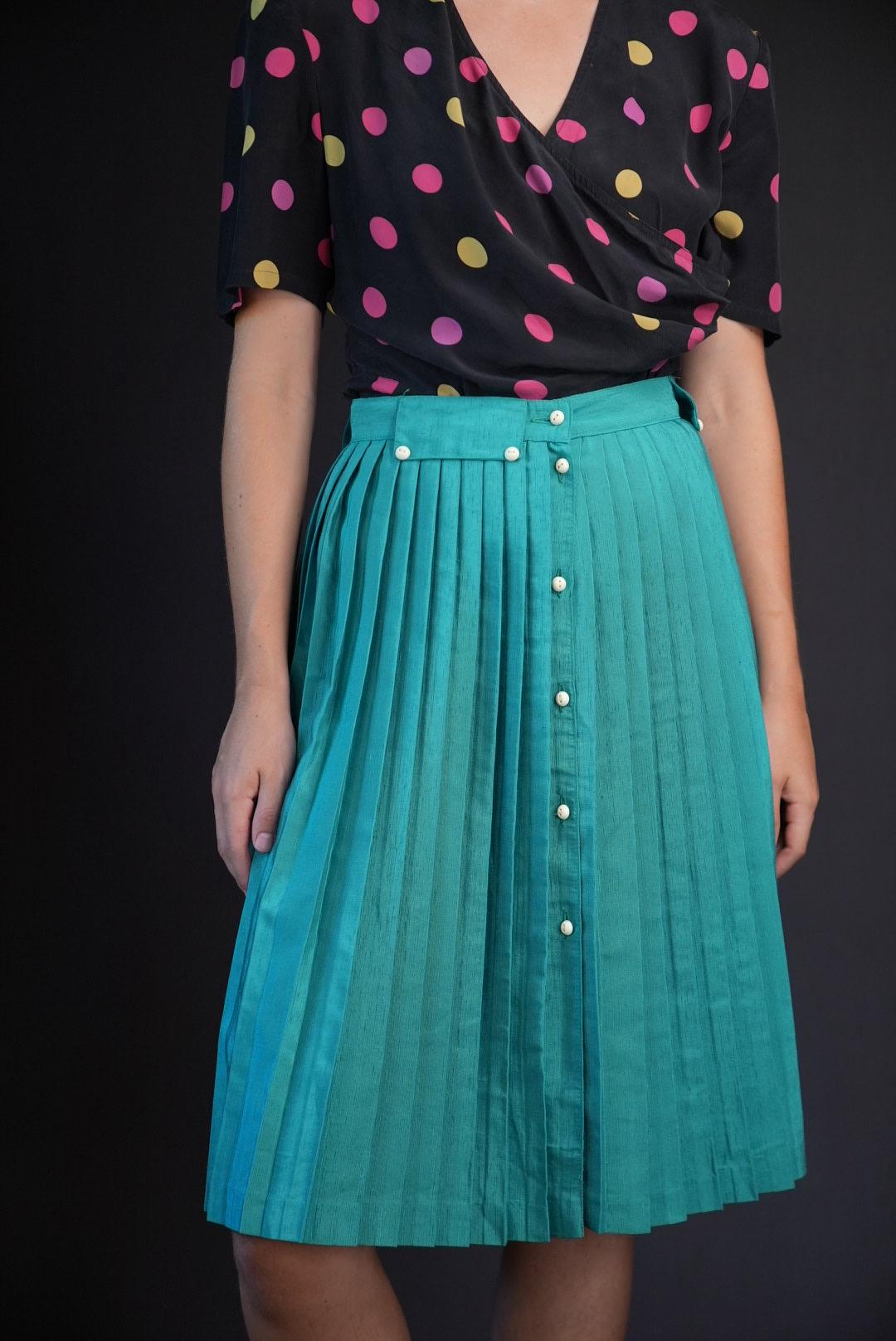 Bright, elegant, and full of movement, this teal pleated midi skirt brings fresh color and retro charm to your wardrobe.