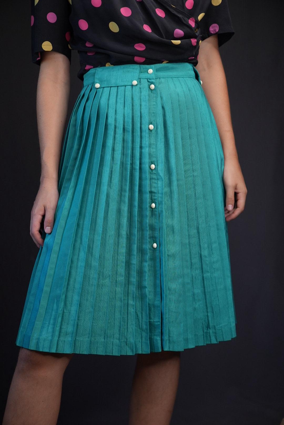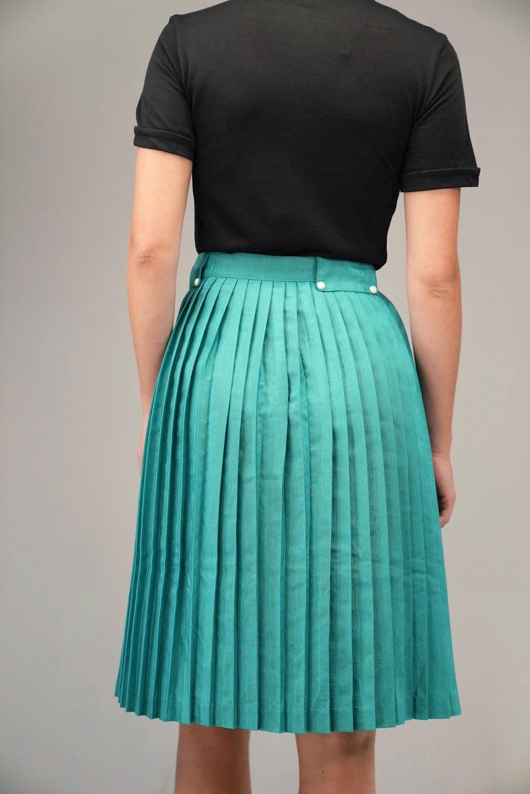 The skirt sits comfortably at the natural waist and falls into a soft, flared hem that moves easily without feeling bulky. The pleats hold their structure while still allowing fluid motion, creating a feminine, swingy silhouette that works for both everyday and more dressed-up looks. The solid teal color makes it a standout piece that pairs well with simple tops.