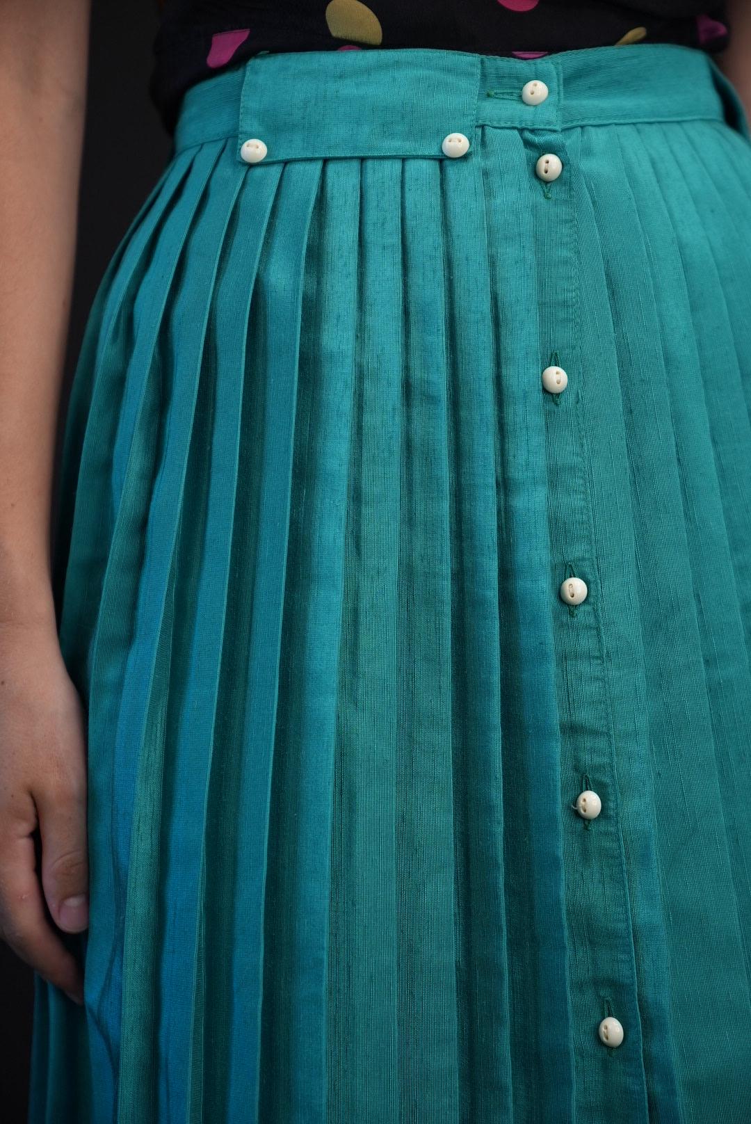 This skirt features a vivid teal shade that instantly brightens any outfit. The high-waisted cut and all-over knife pleats create a clean, vertical line that elongates the figure and adds beautiful movement with every step. A matching fabric belt cinches the waist, while the front button placket introduces subtle structure and a vintage-inspired touch.