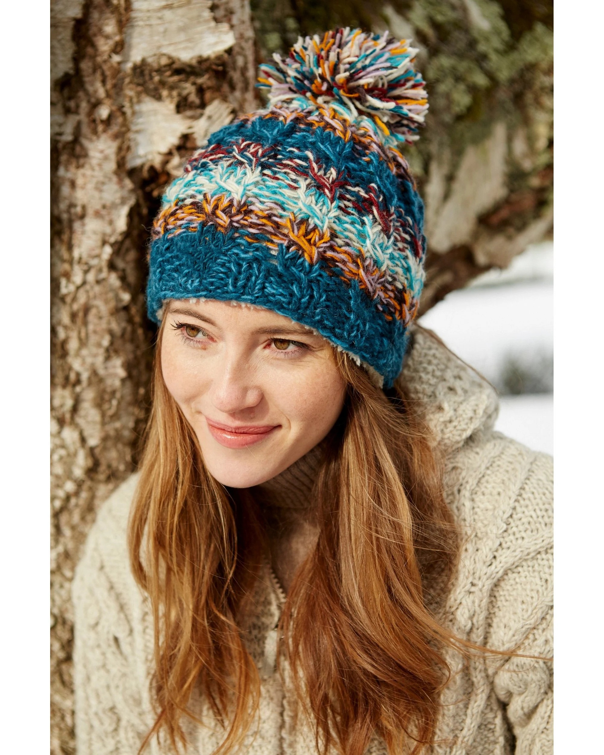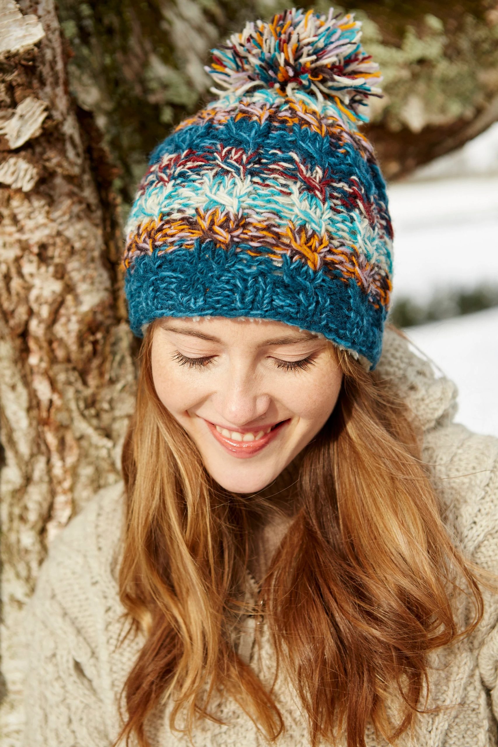 This comfortable and eye-catching knit hat features a deep teal base accented with mixed stripes of cream, saffron, and burgundy, crafted using a richly textured chunky knit technique. It’s topped with a thick, multicolored pom-pom. Warm and soft, it stands out even on gloomy days.
