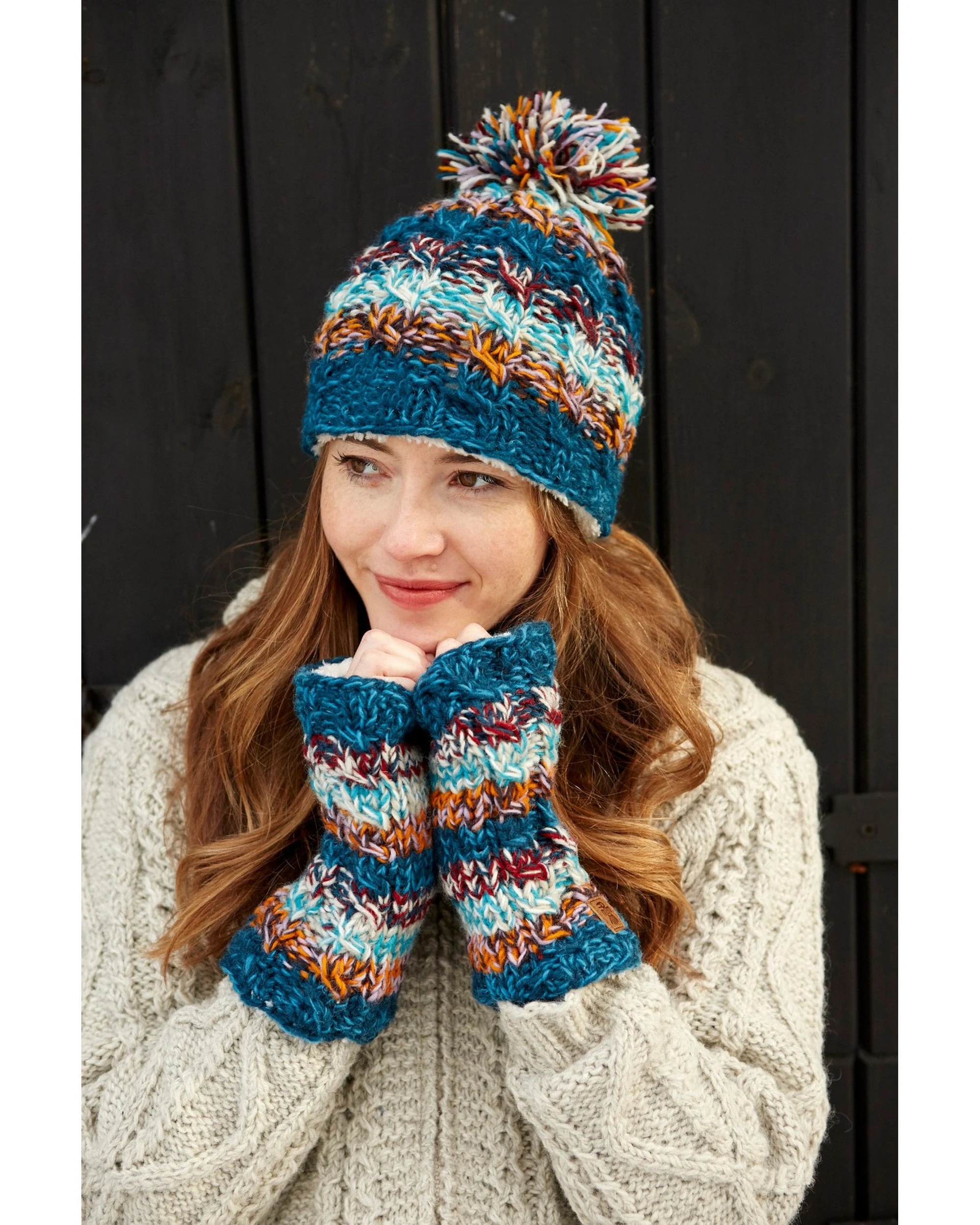 Details: Chunky textured knit with contrasting mixed-color stripes; ribbed cuffs; securely sewn multi-colored pom-poms.